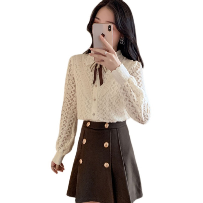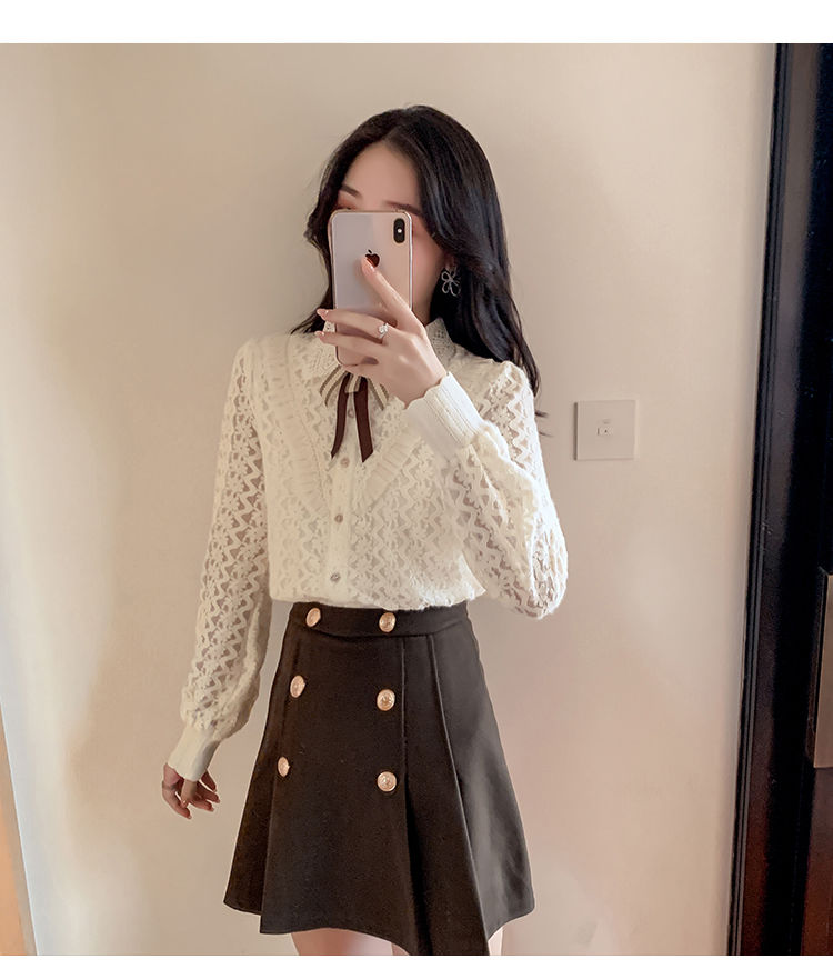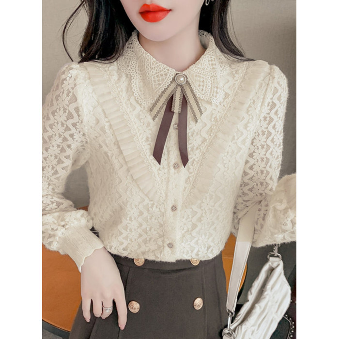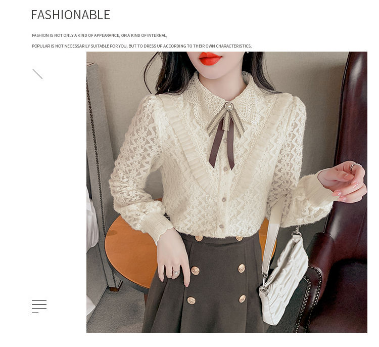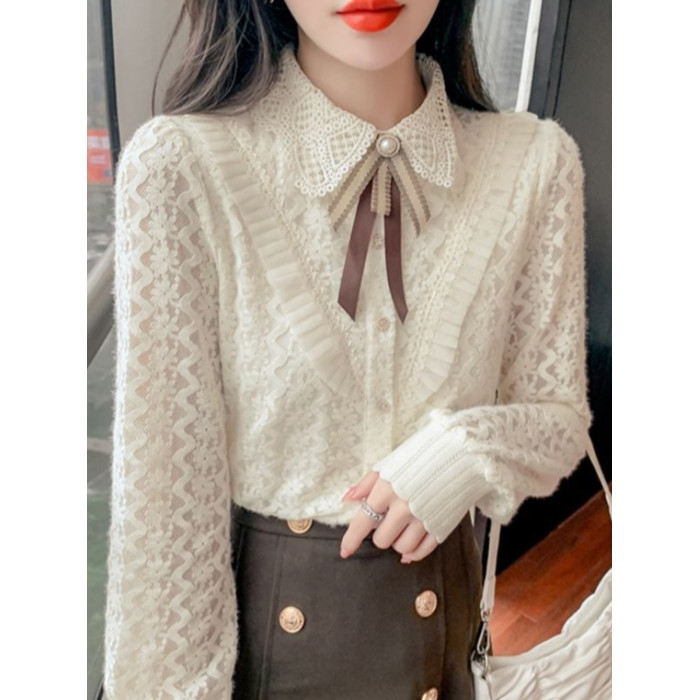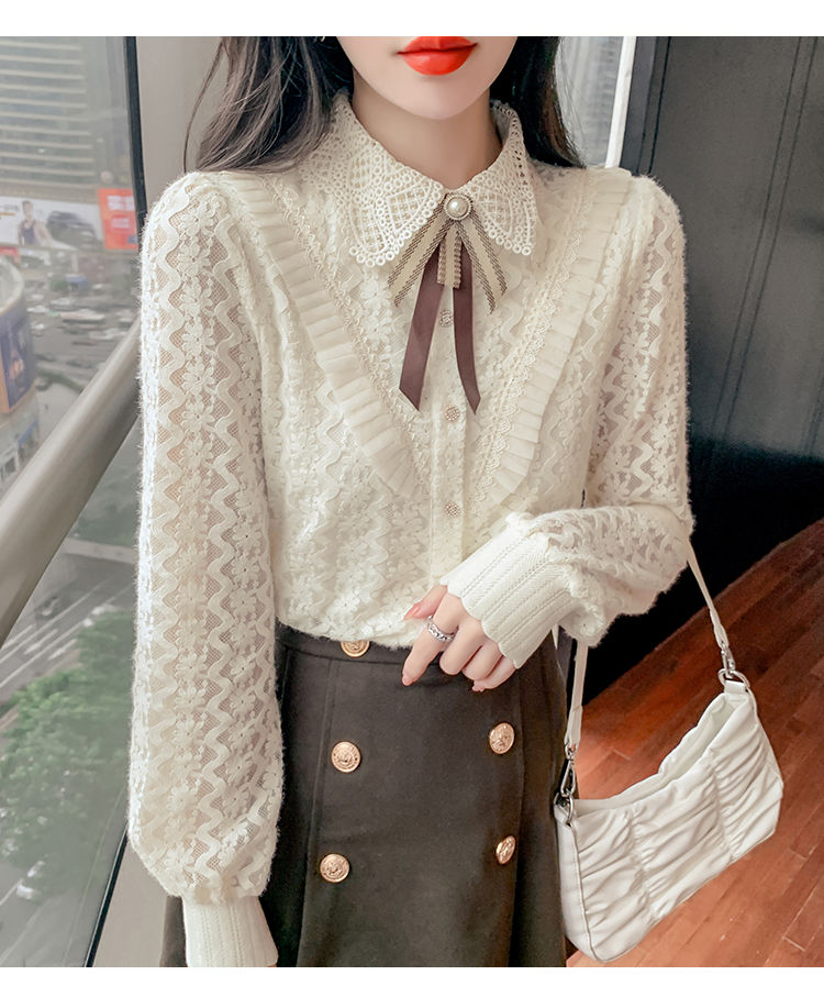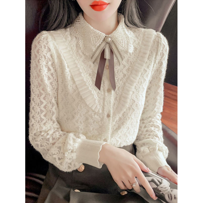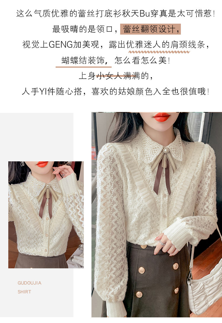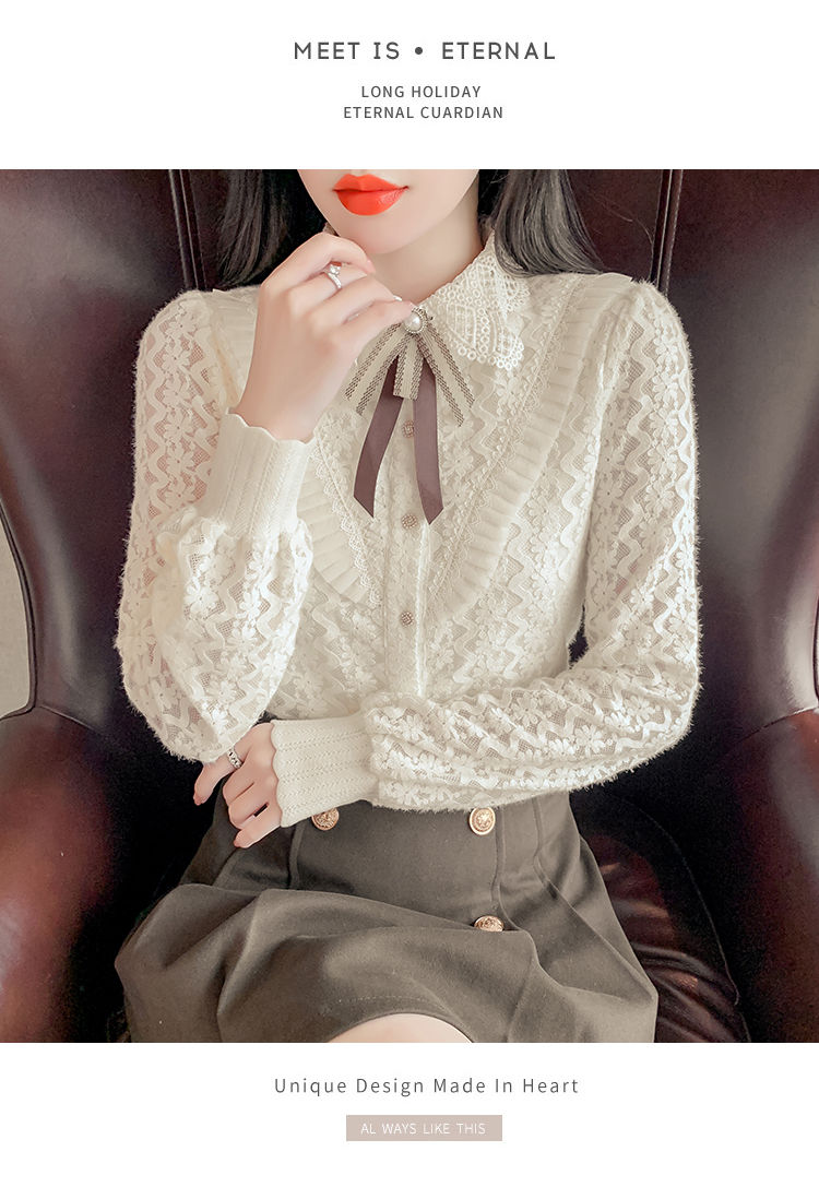加絨加厚襯衫女秋冬新款蕾絲小衫別致氣質上衣高貴洋氣時尚打底衫