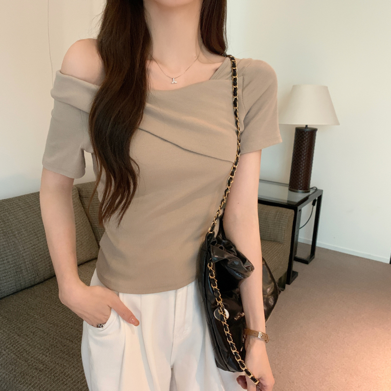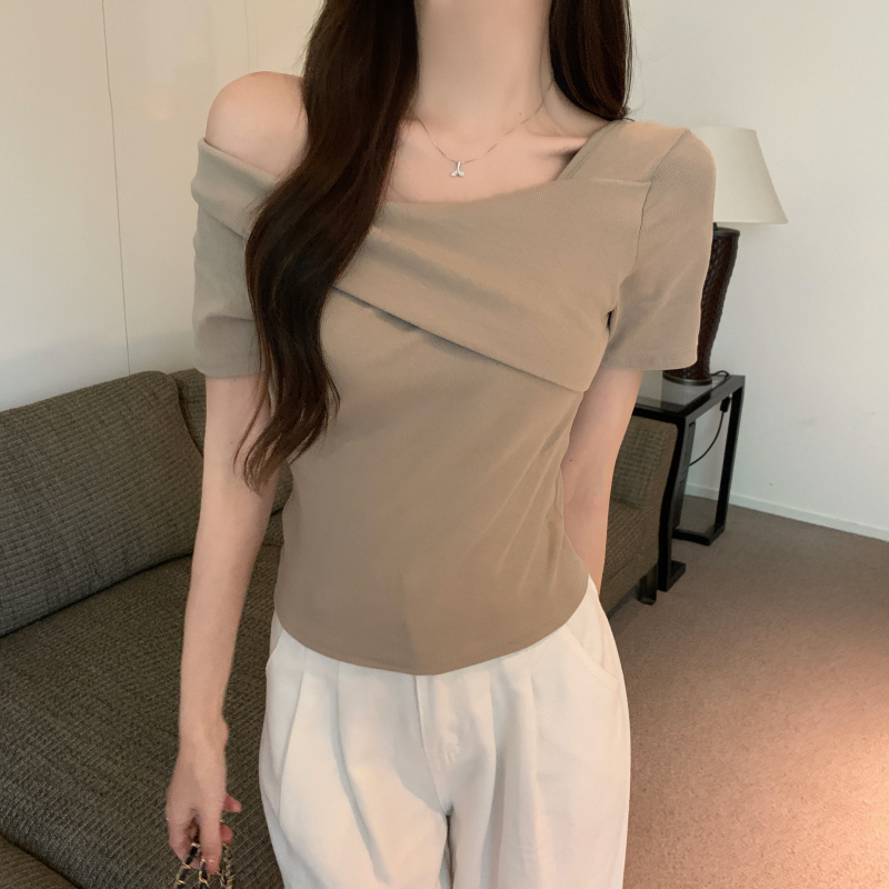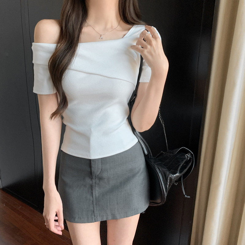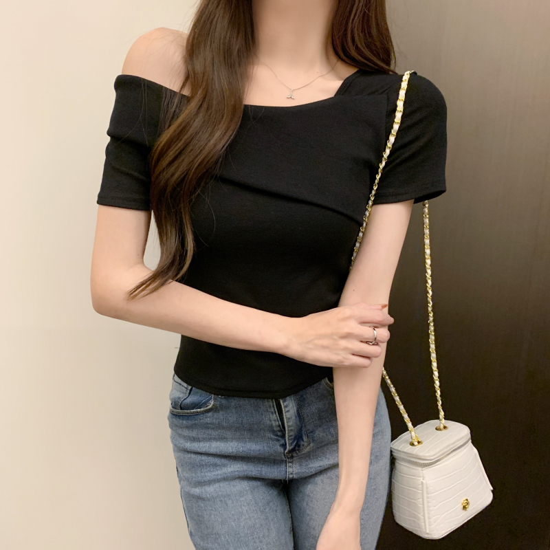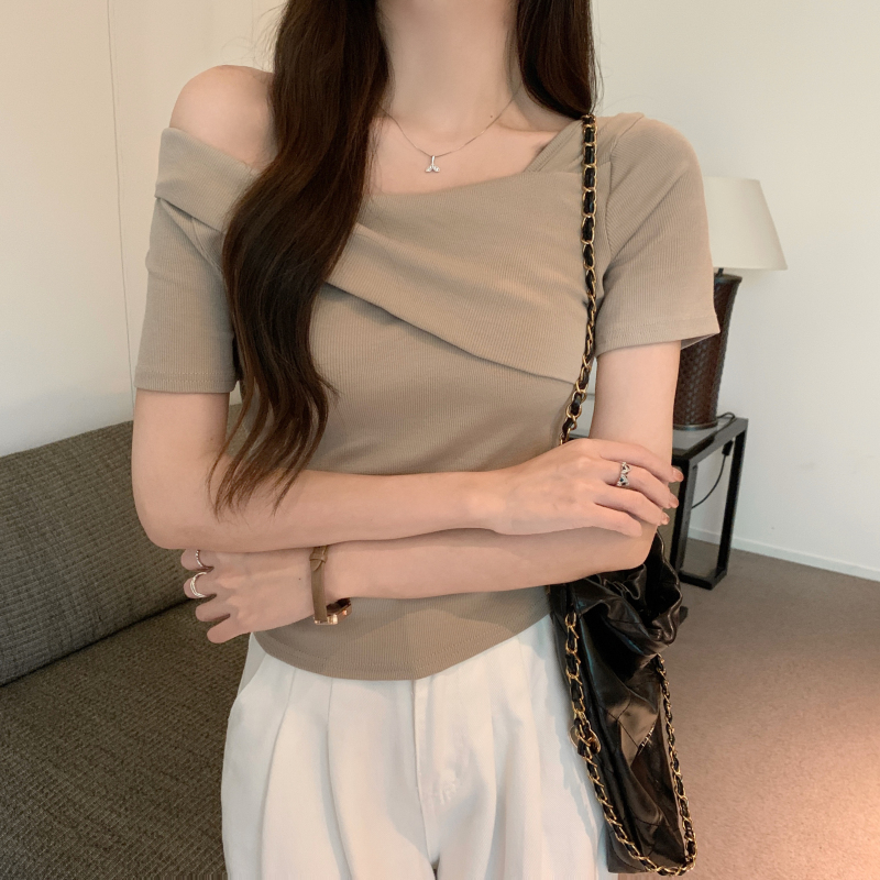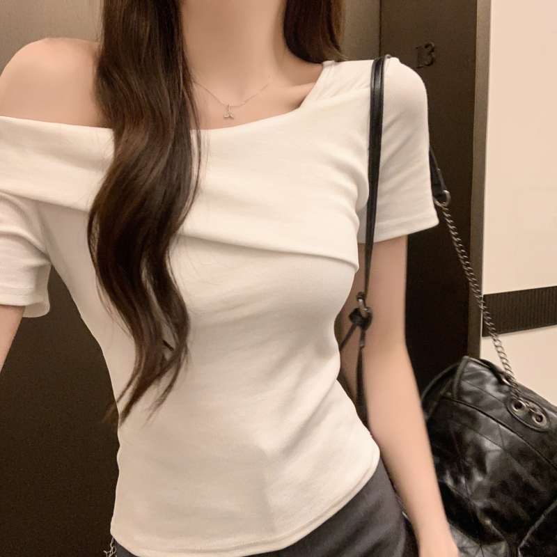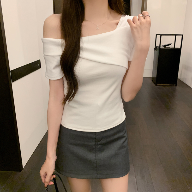 小衆氣質不規則一字肩短袖t恤女夏季新款純欲辣妹設計感體恤上衣