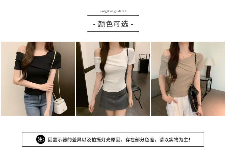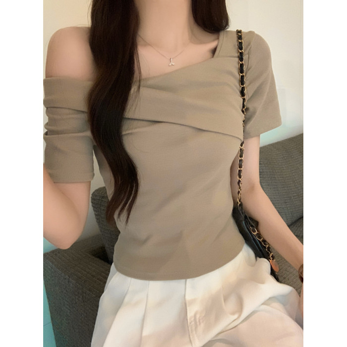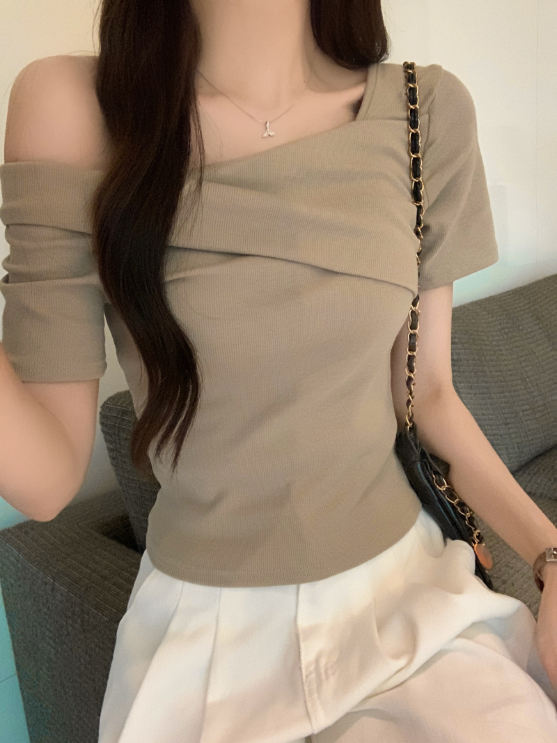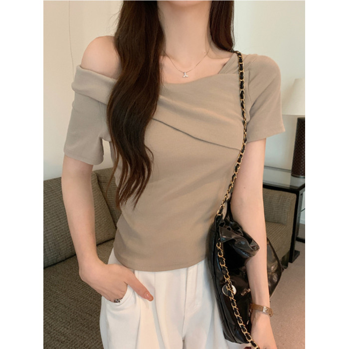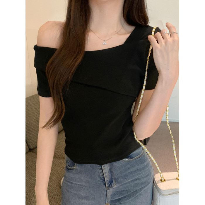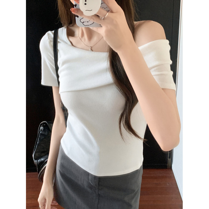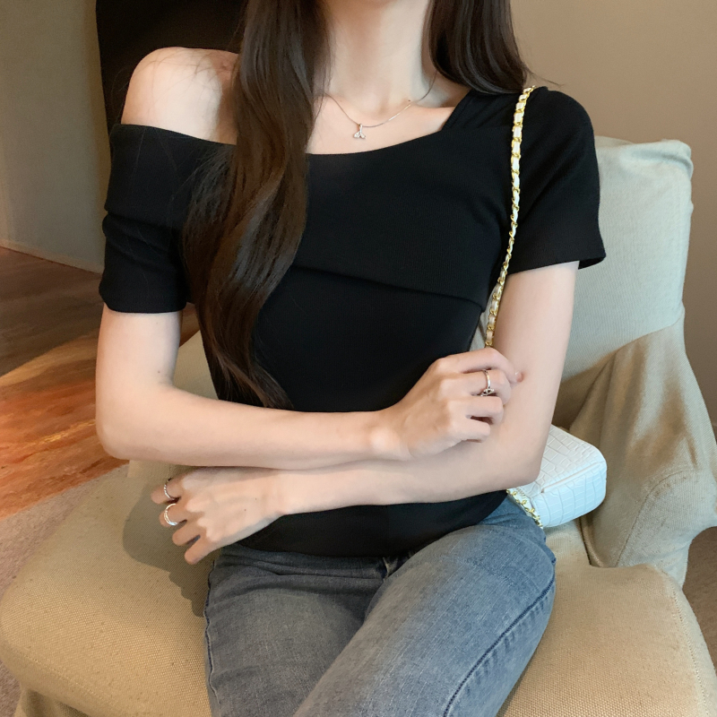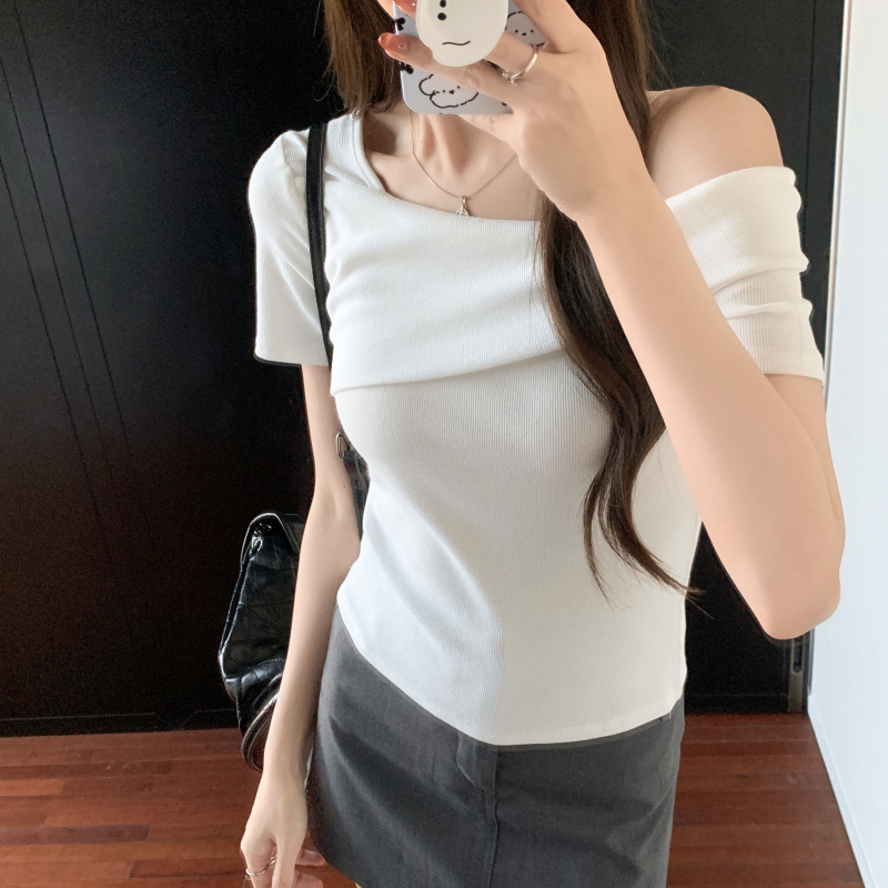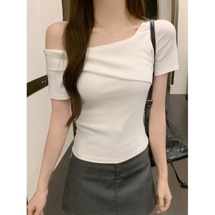 小衆氣質不規則一字肩短袖t恤女夏季新款純欲辣妹設計感體恤上衣
