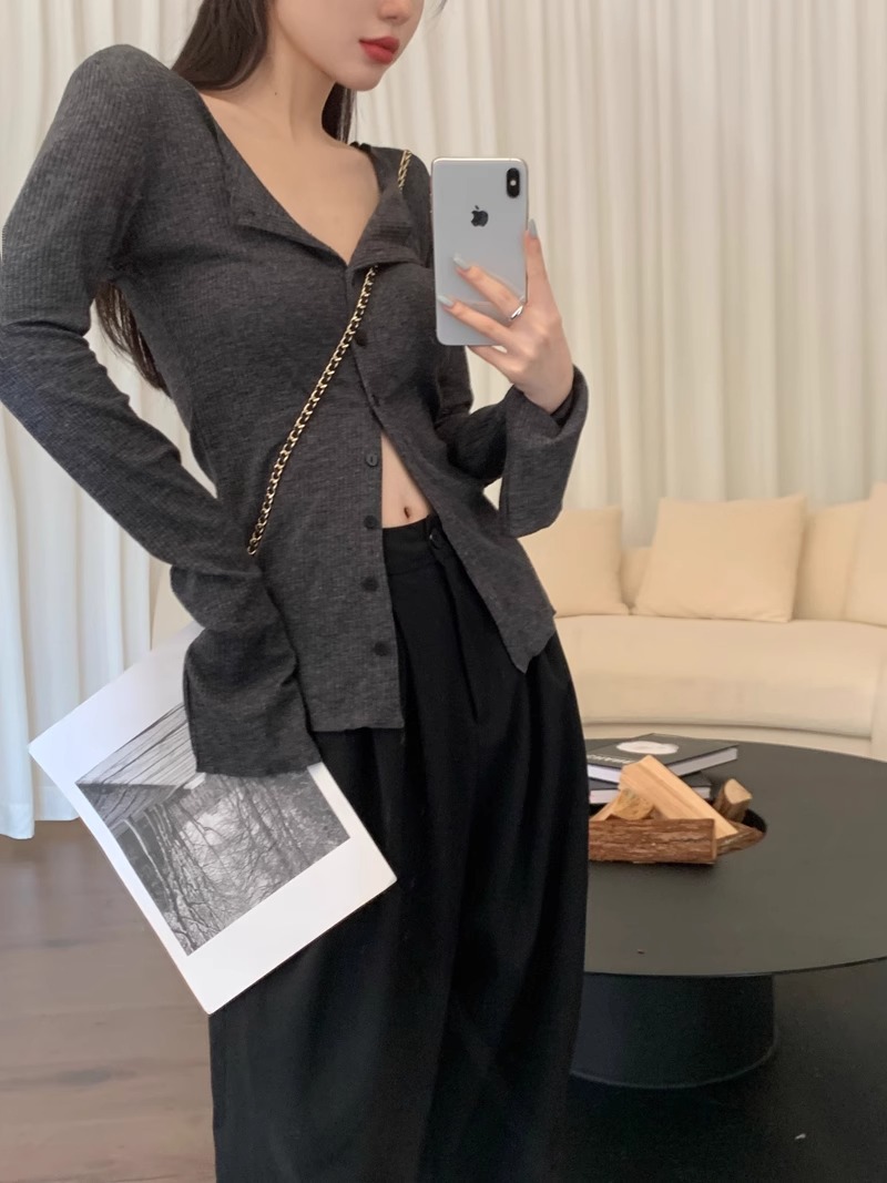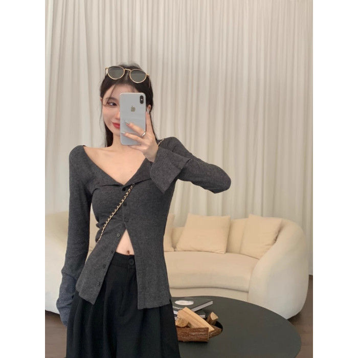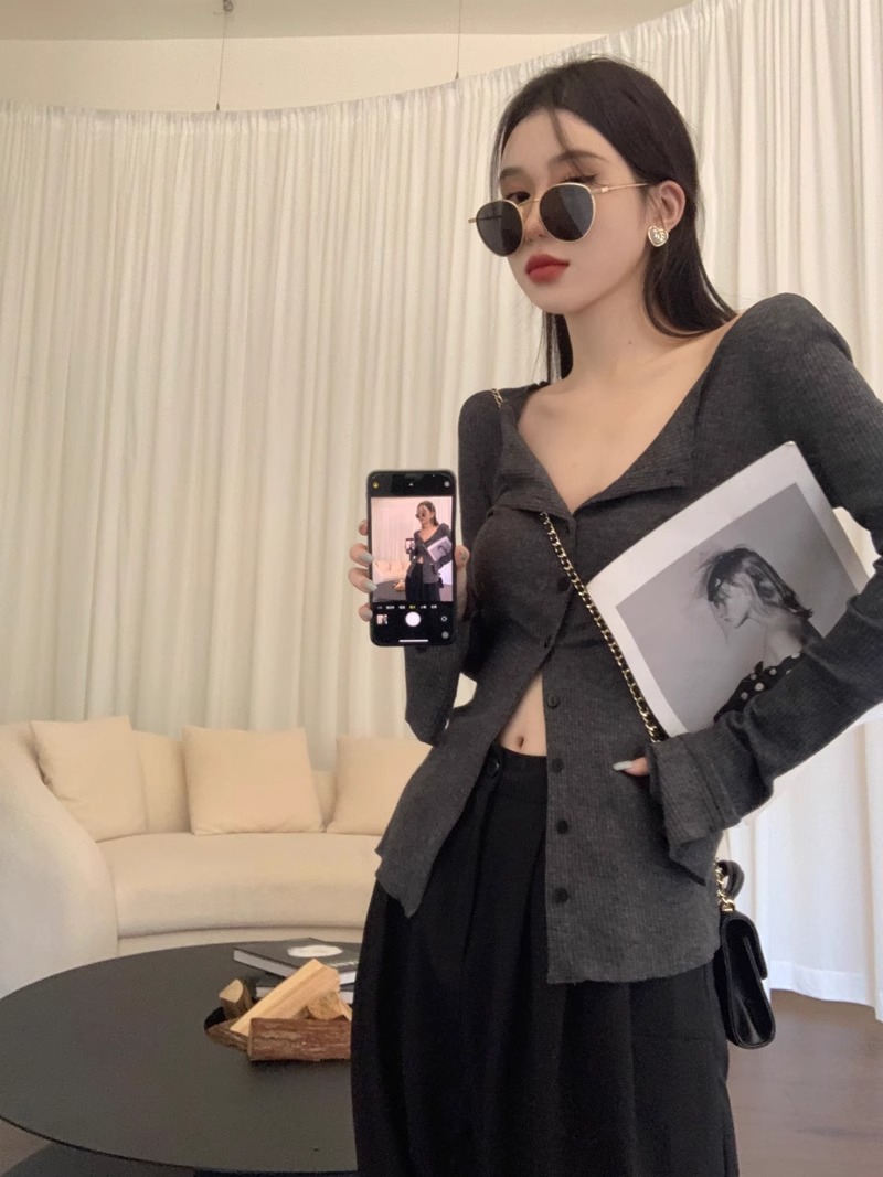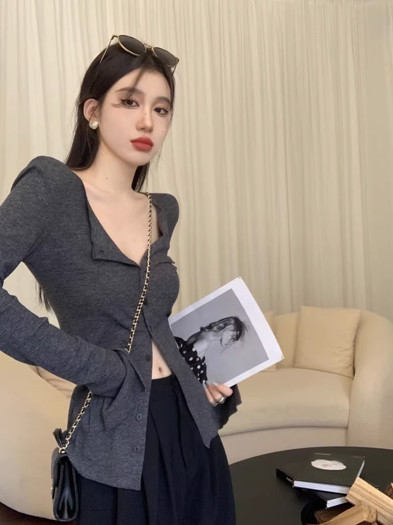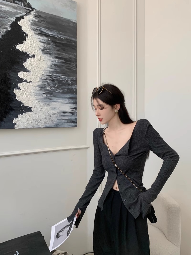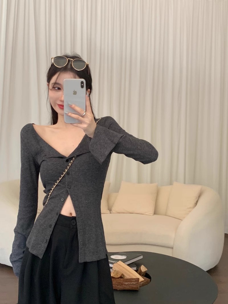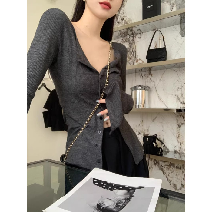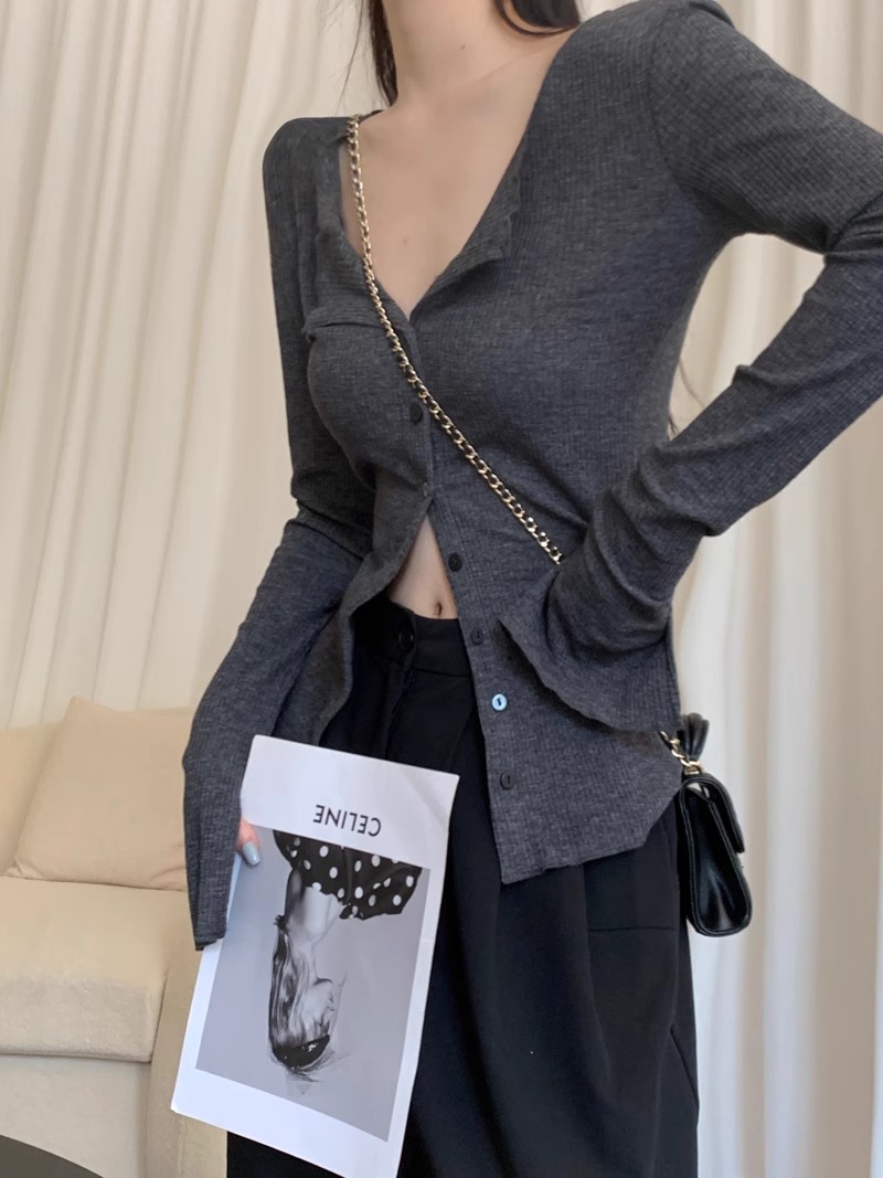秋冬新款辣妹V領收腰針織開衫女修身內搭打底衫小衆別致長袖上衣