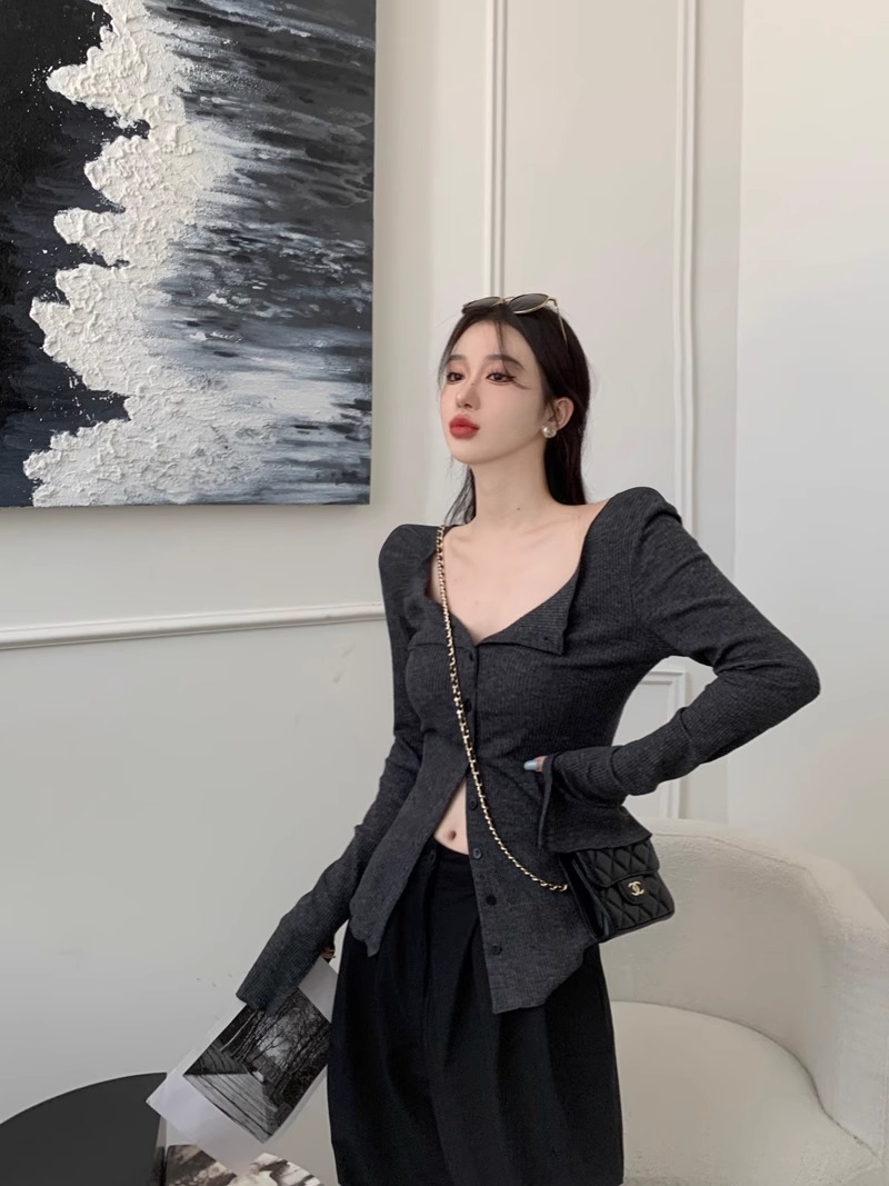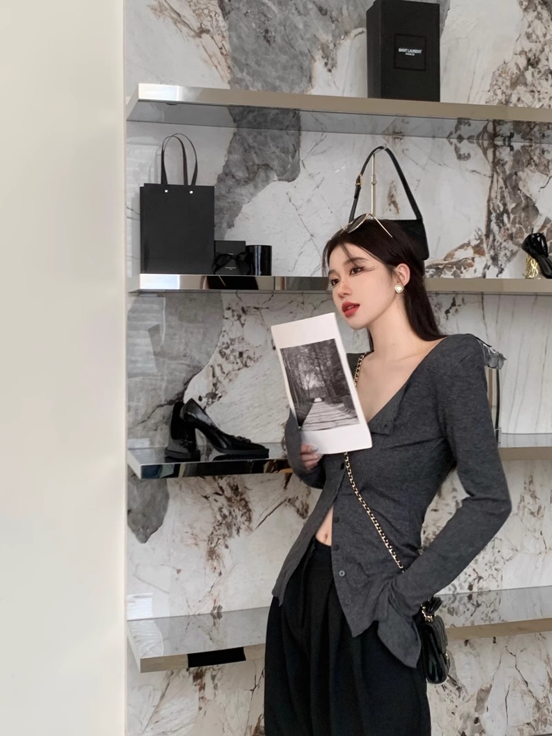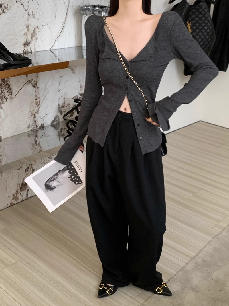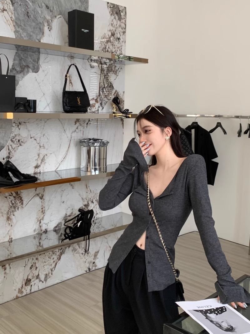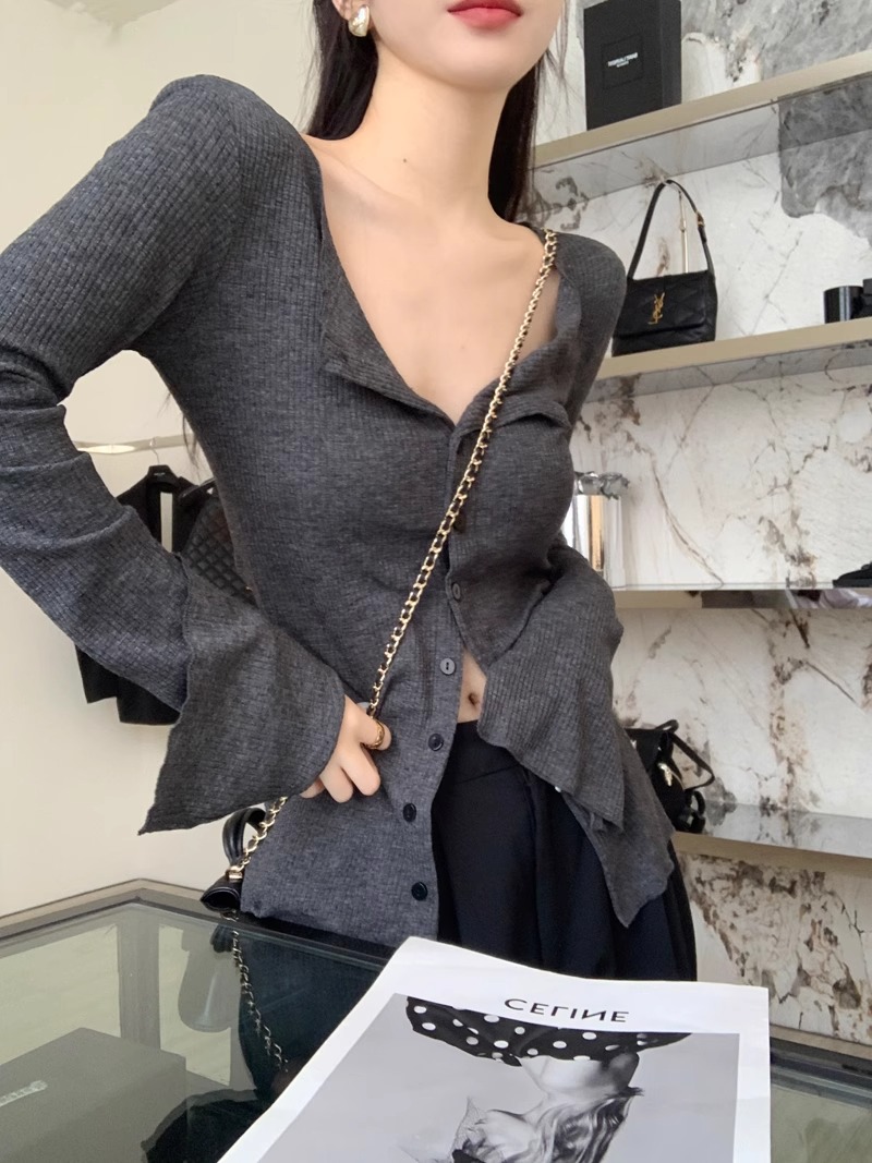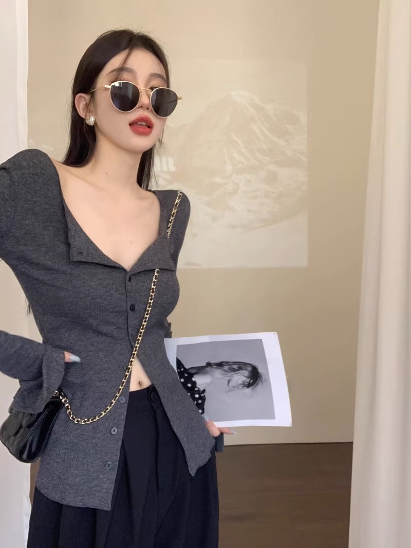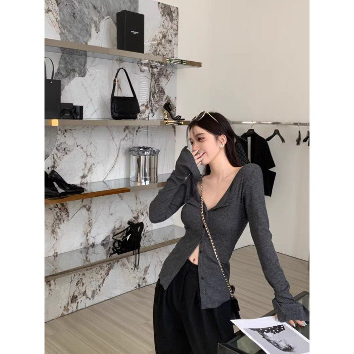 秋冬新款辣妹V領收腰針織開衫女修身內搭打底衫小衆別致長袖上衣