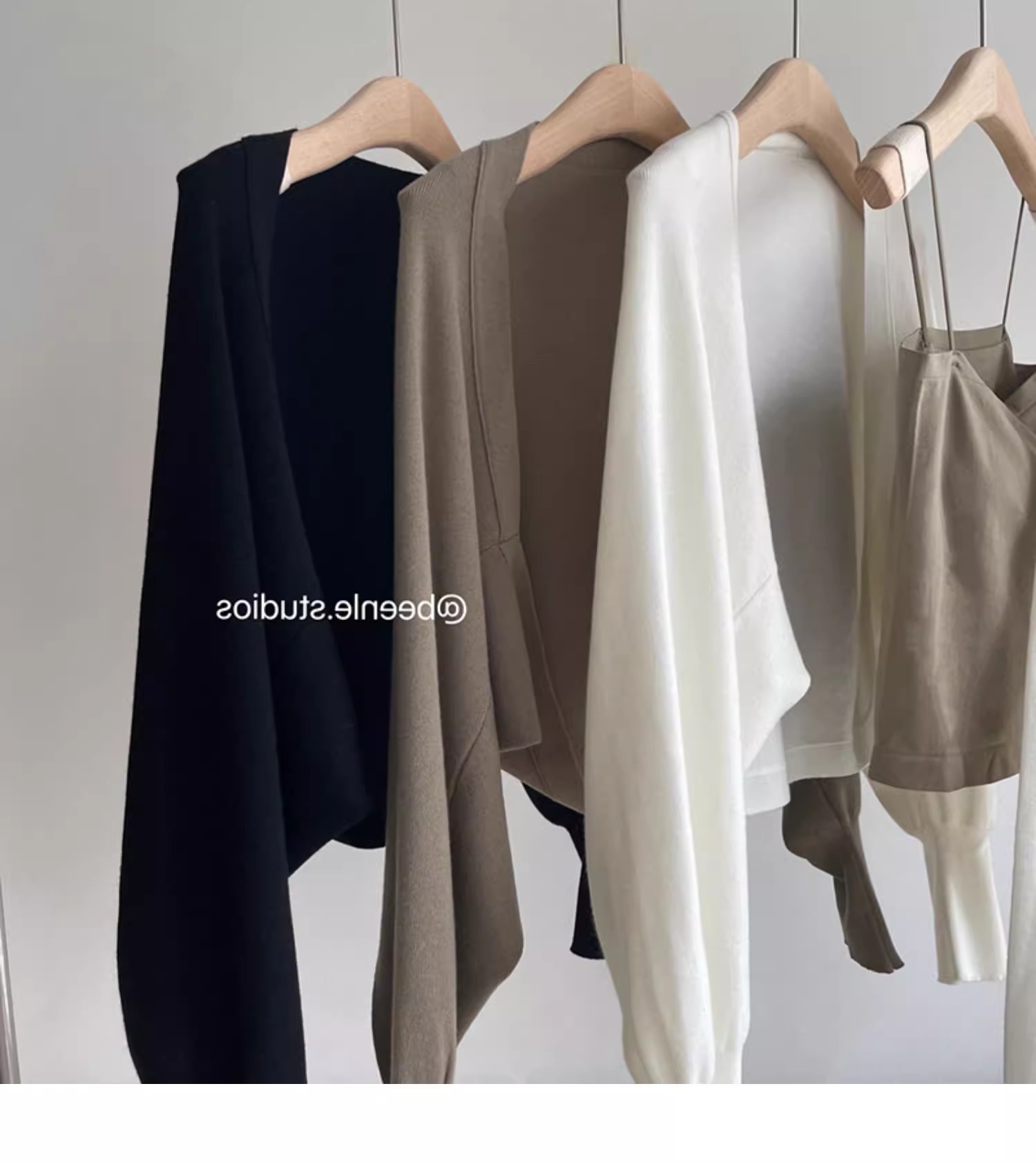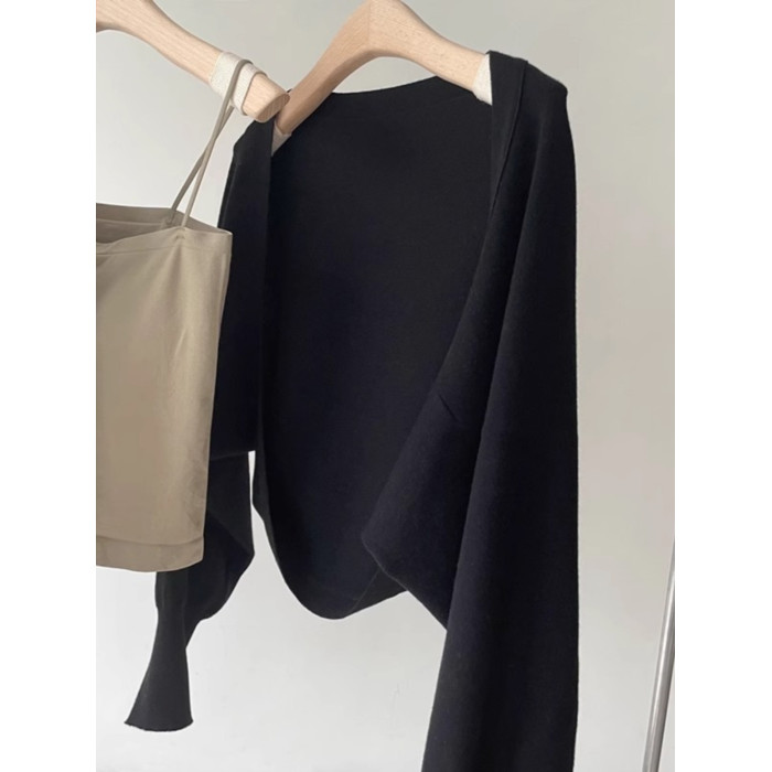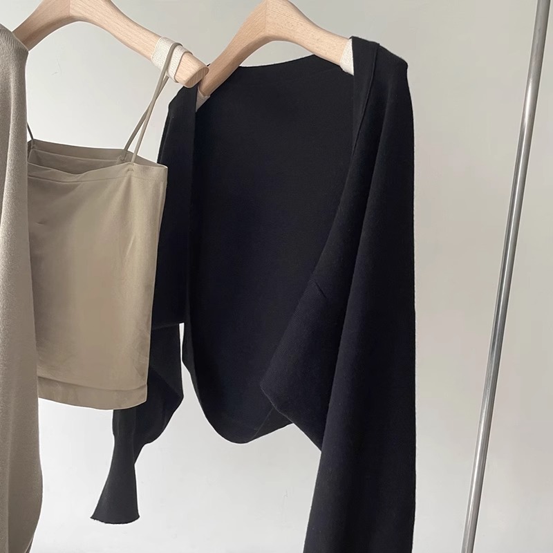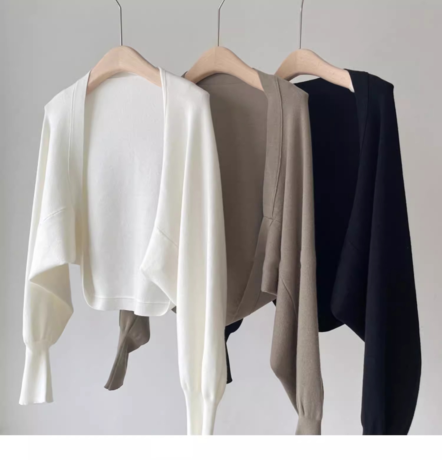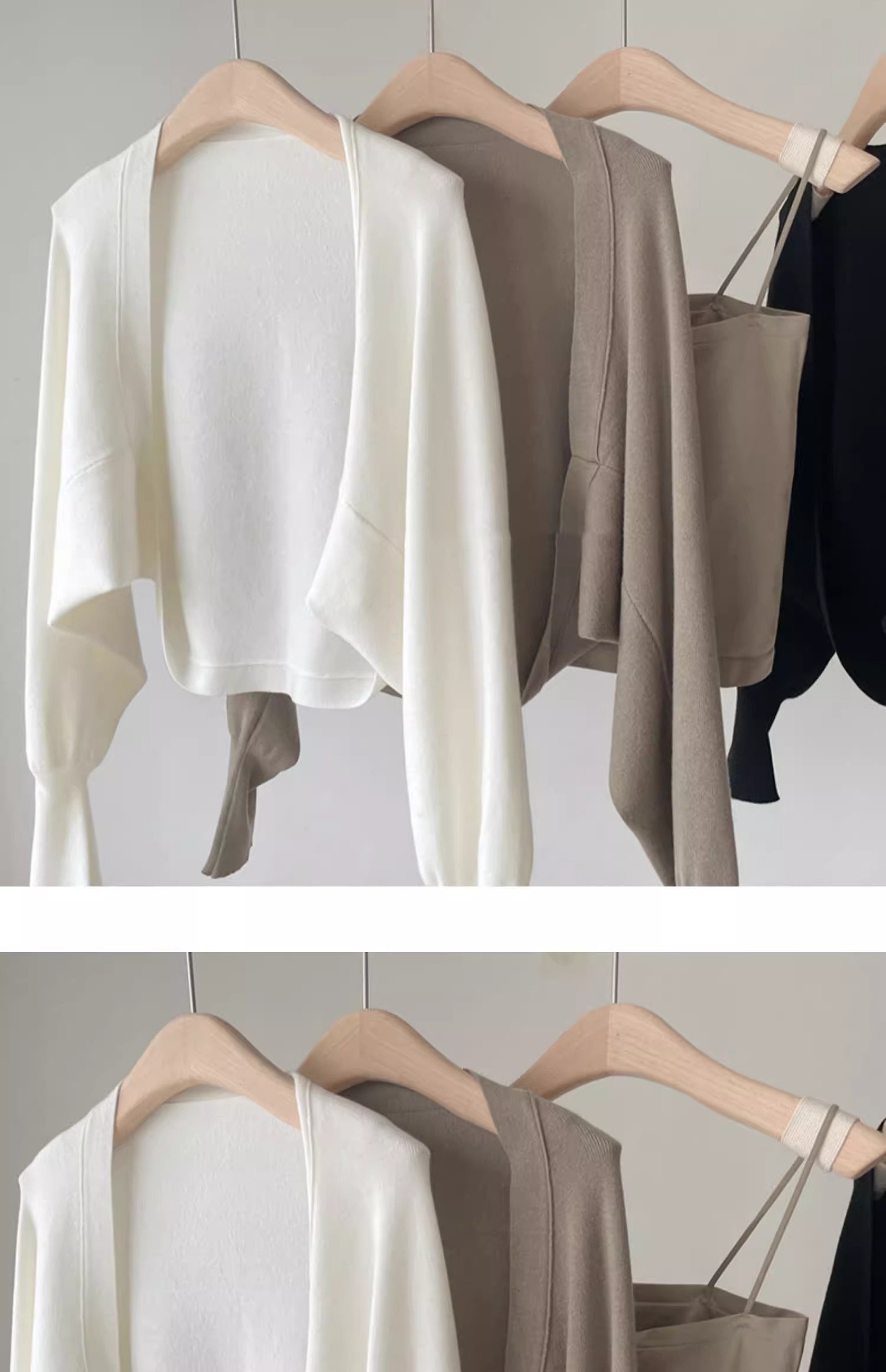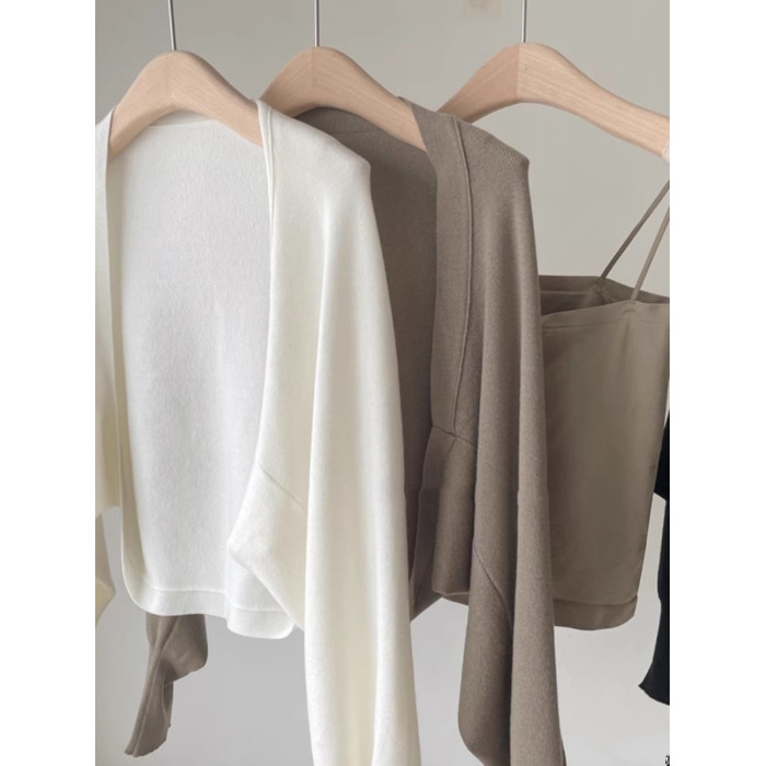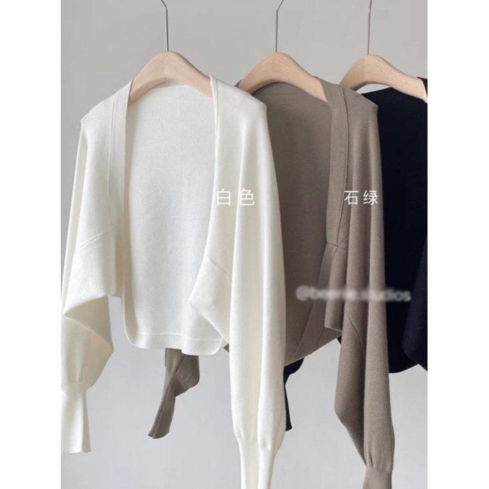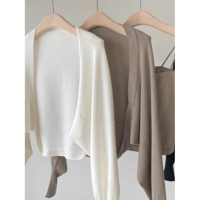 白色短款蝙蝠袖冰絲針織開衫女裝秋冬季披肩外搭坎肩薄款毛衣外套