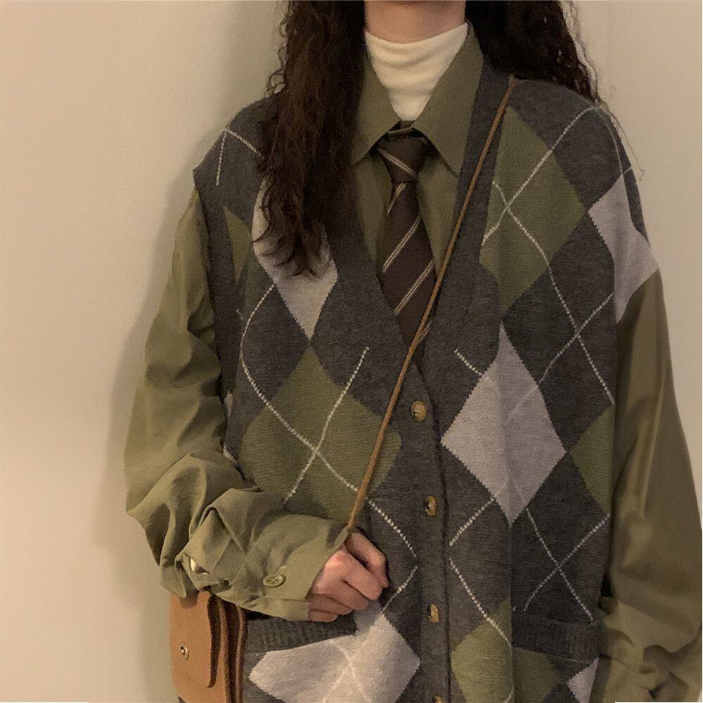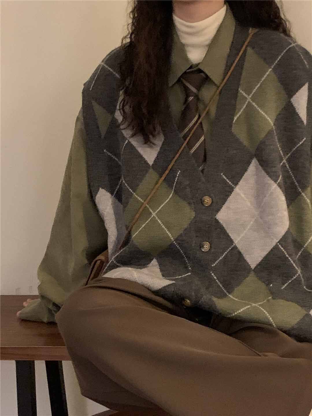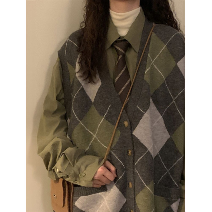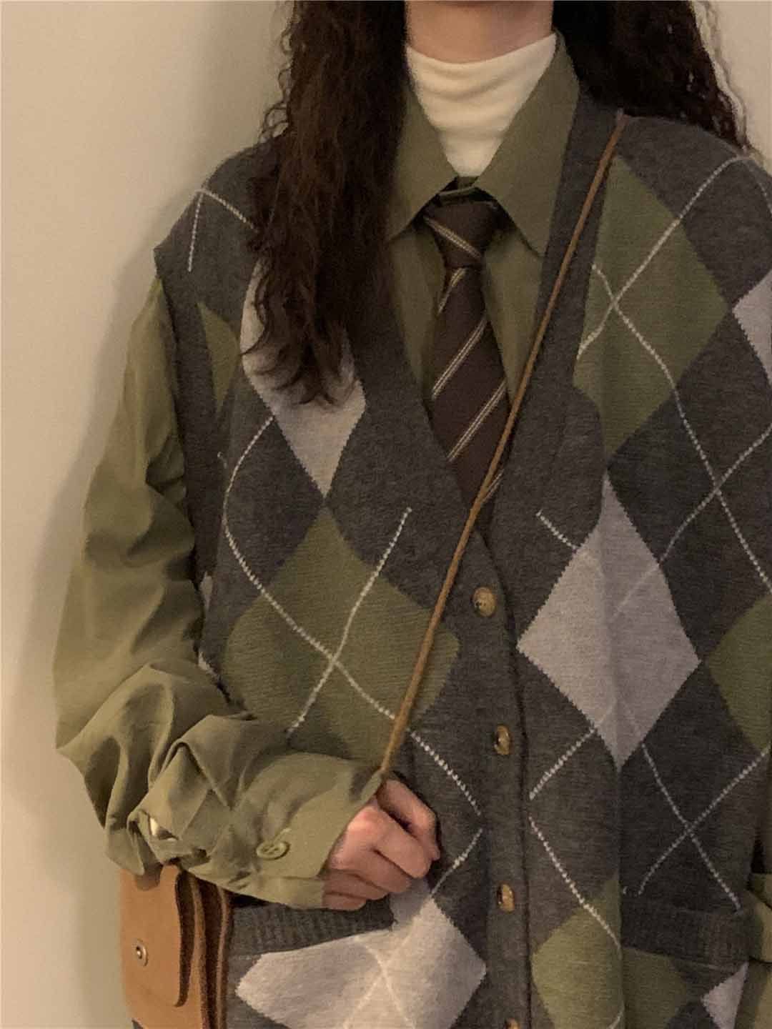 胖MM200斤特大碼套裝學院風拼色V領格子針織毛衣馬甲背心女領帶