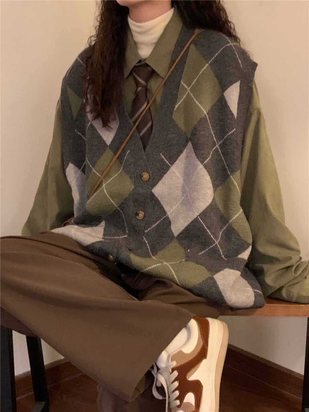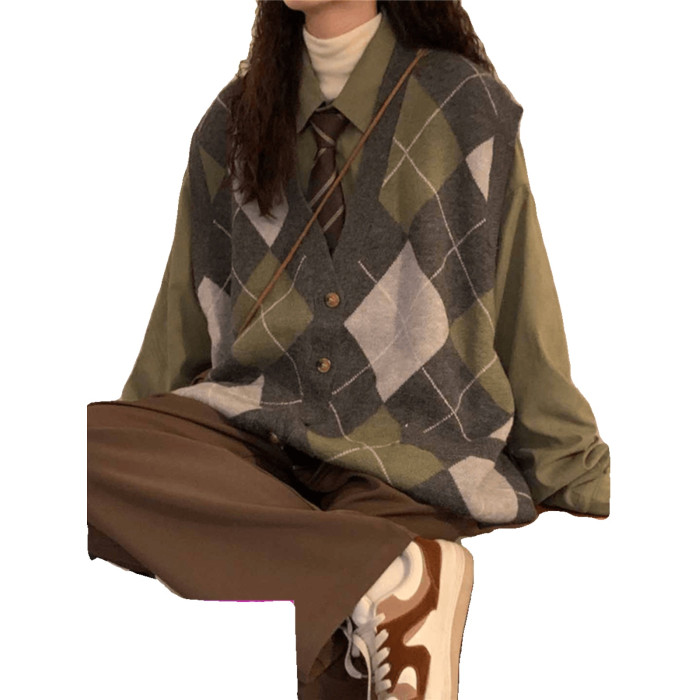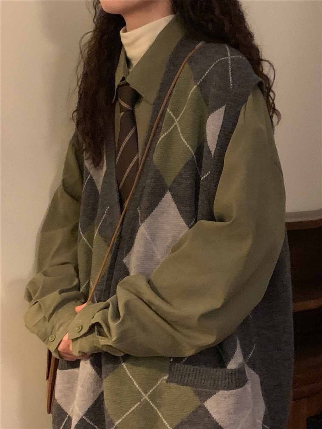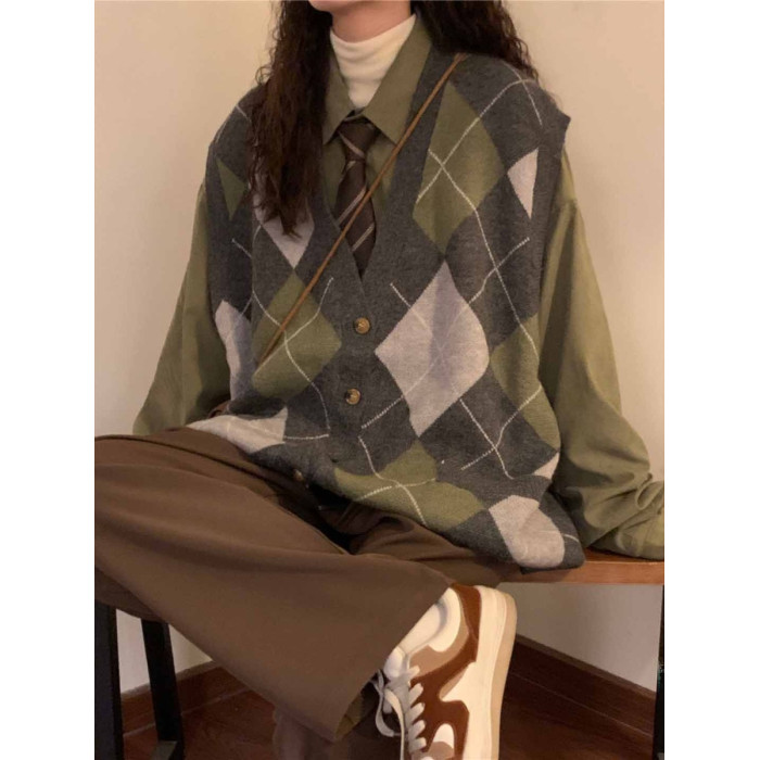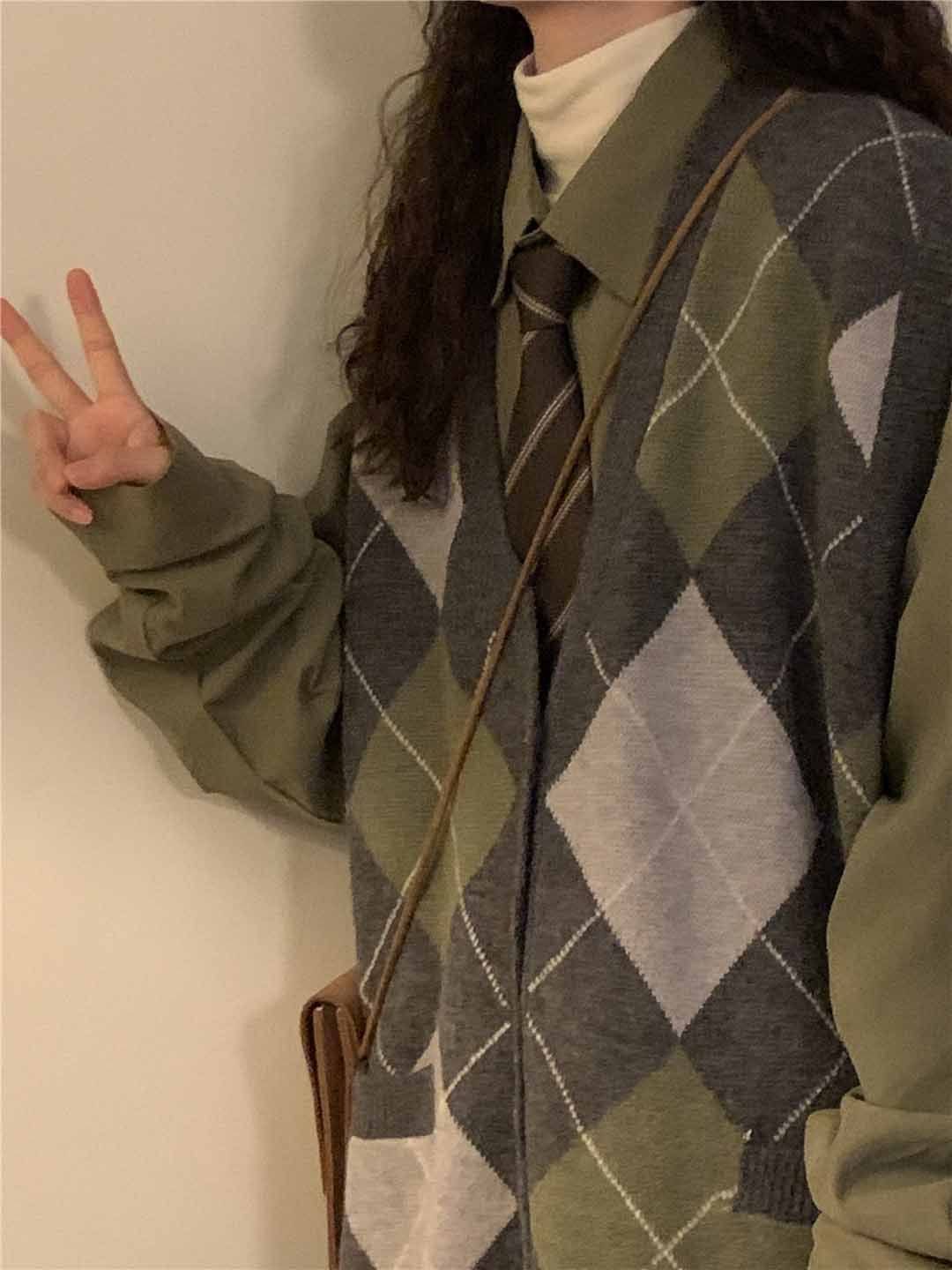 胖MM200斤特大碼套裝學院風拼色V領格子針織毛衣馬甲背心女領帶