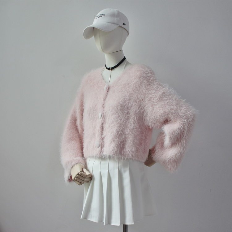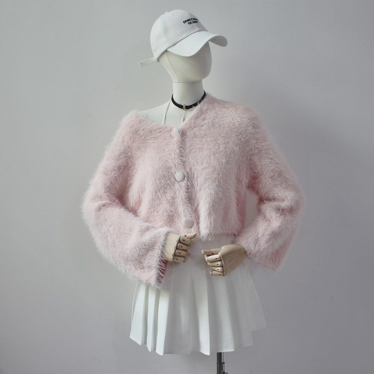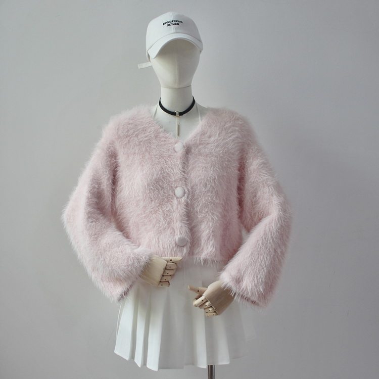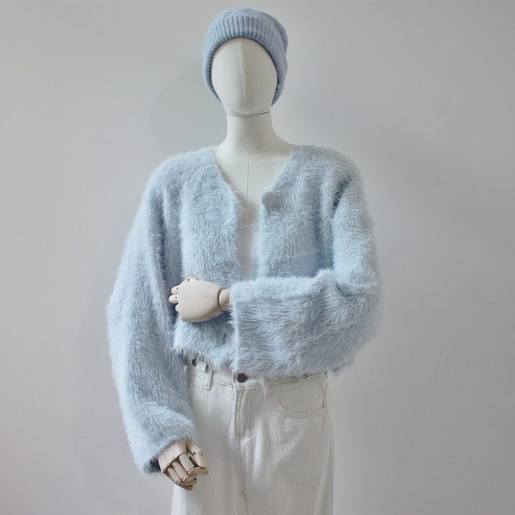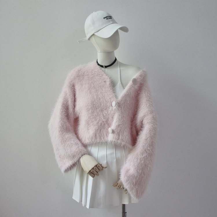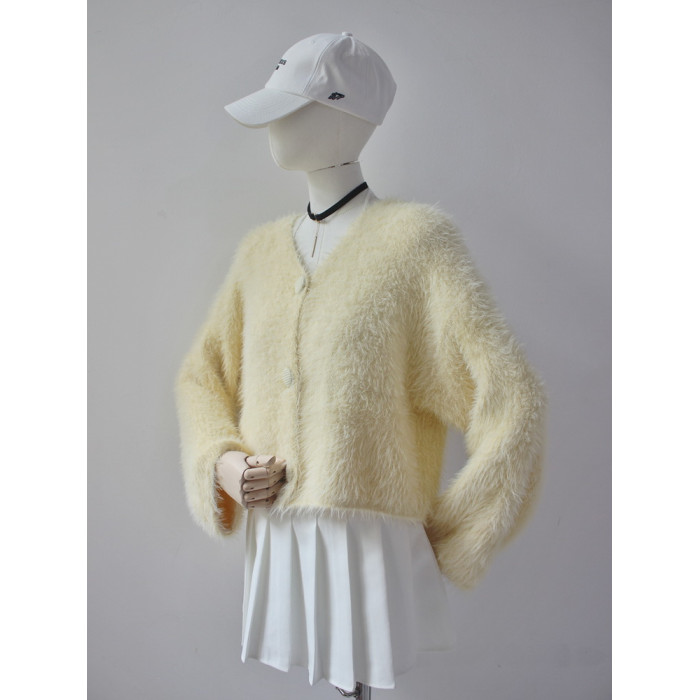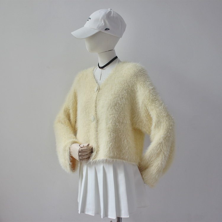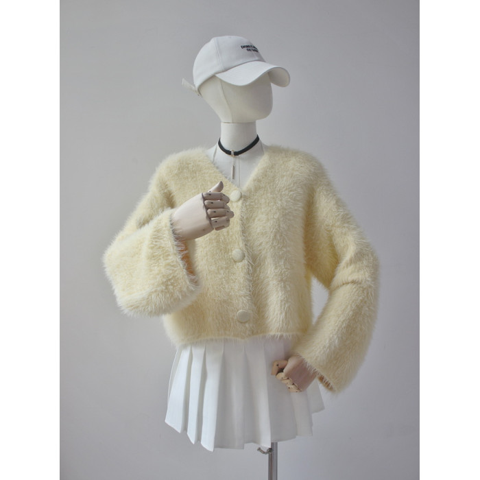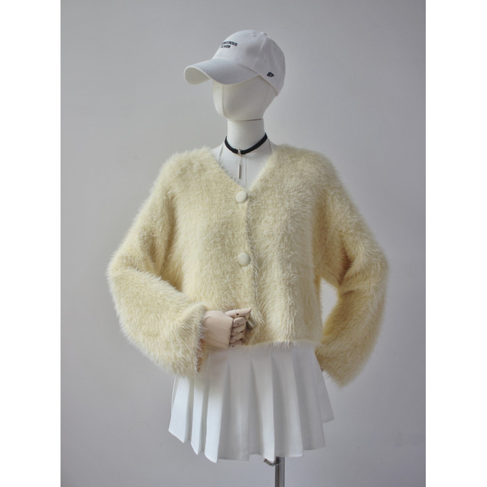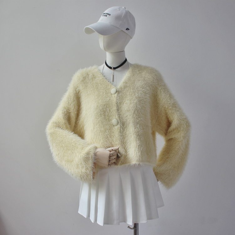 毛衫之都奶黃色仿水貂絨開衫毛衣外套短款奶fufu溫柔軟糯上衣女