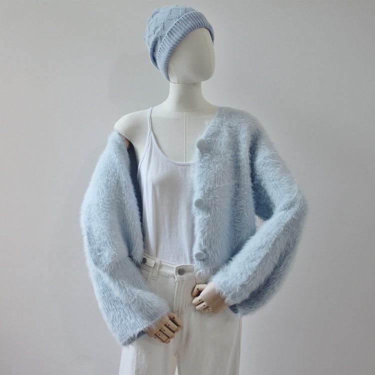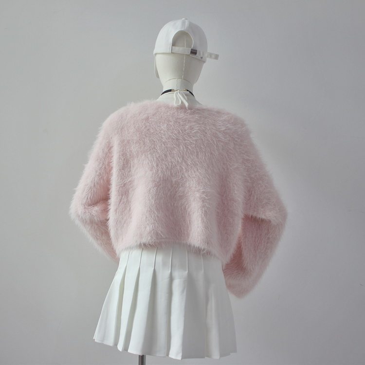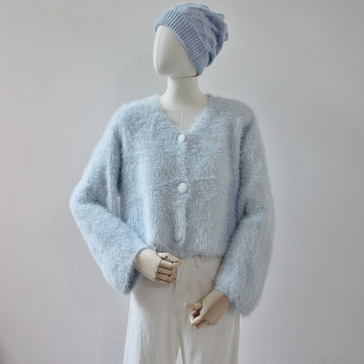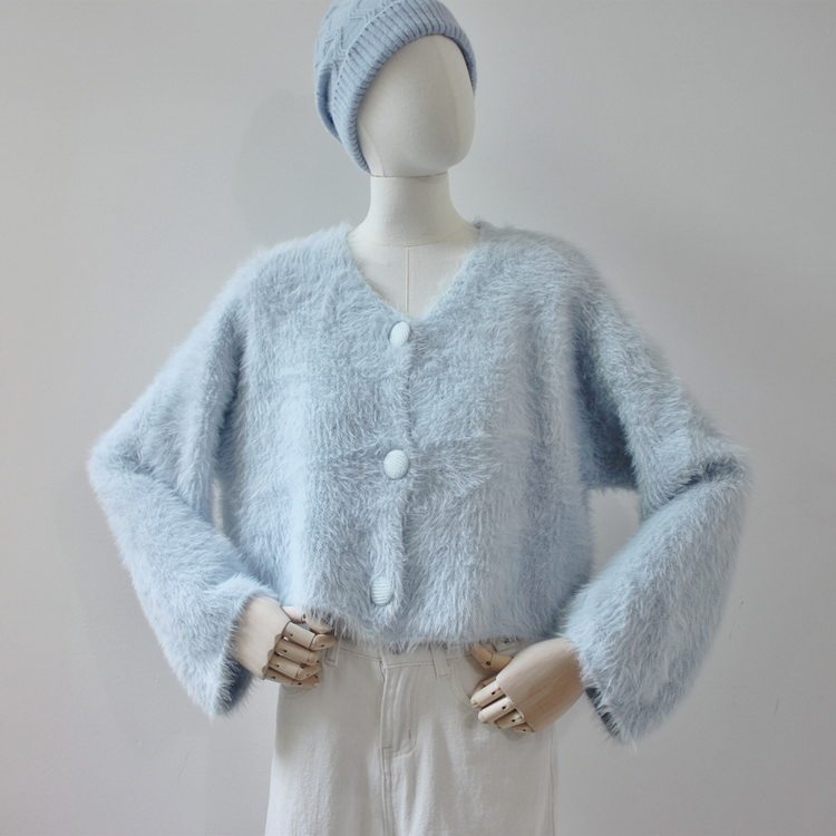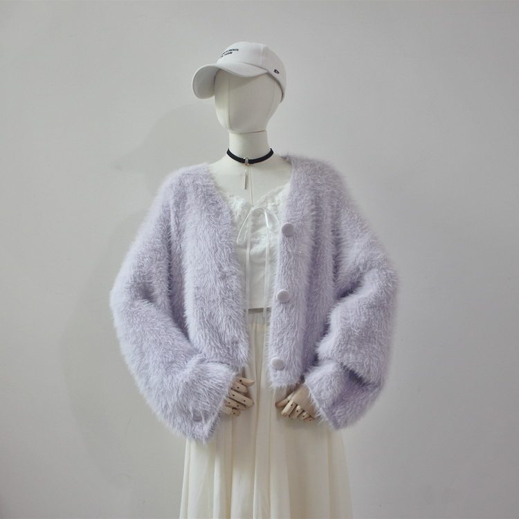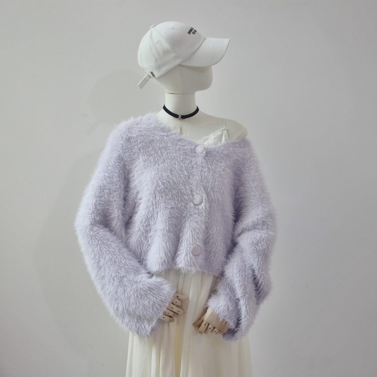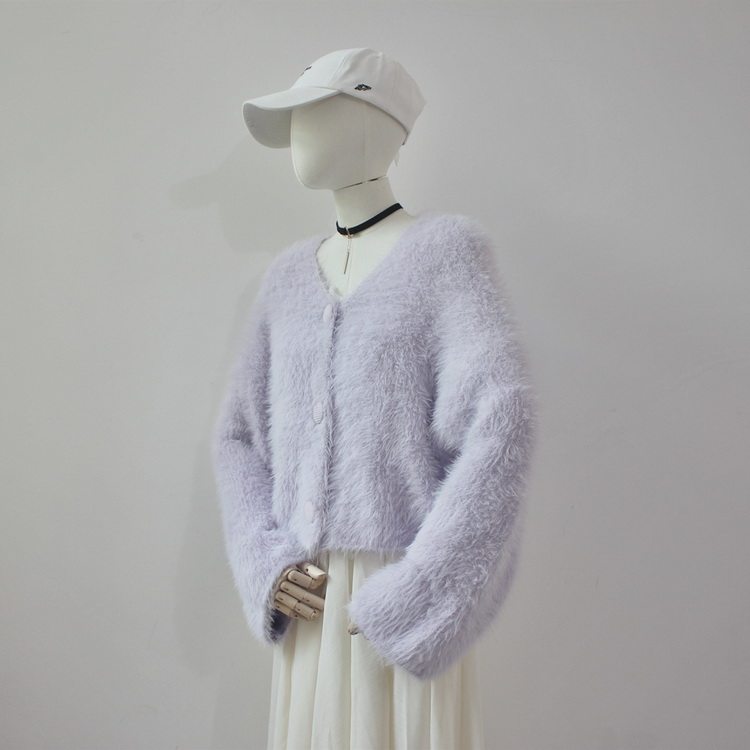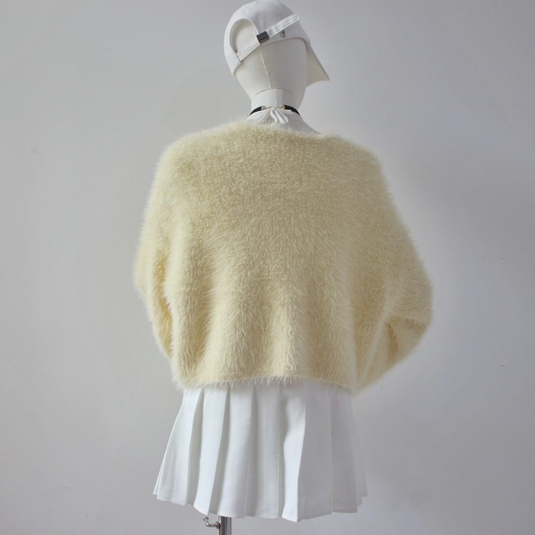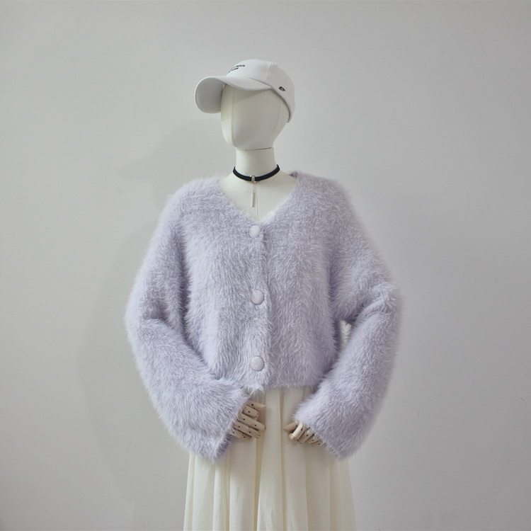 毛衫之都奶黃色仿水貂絨開衫毛衣外套短款奶fufu溫柔軟糯上衣女