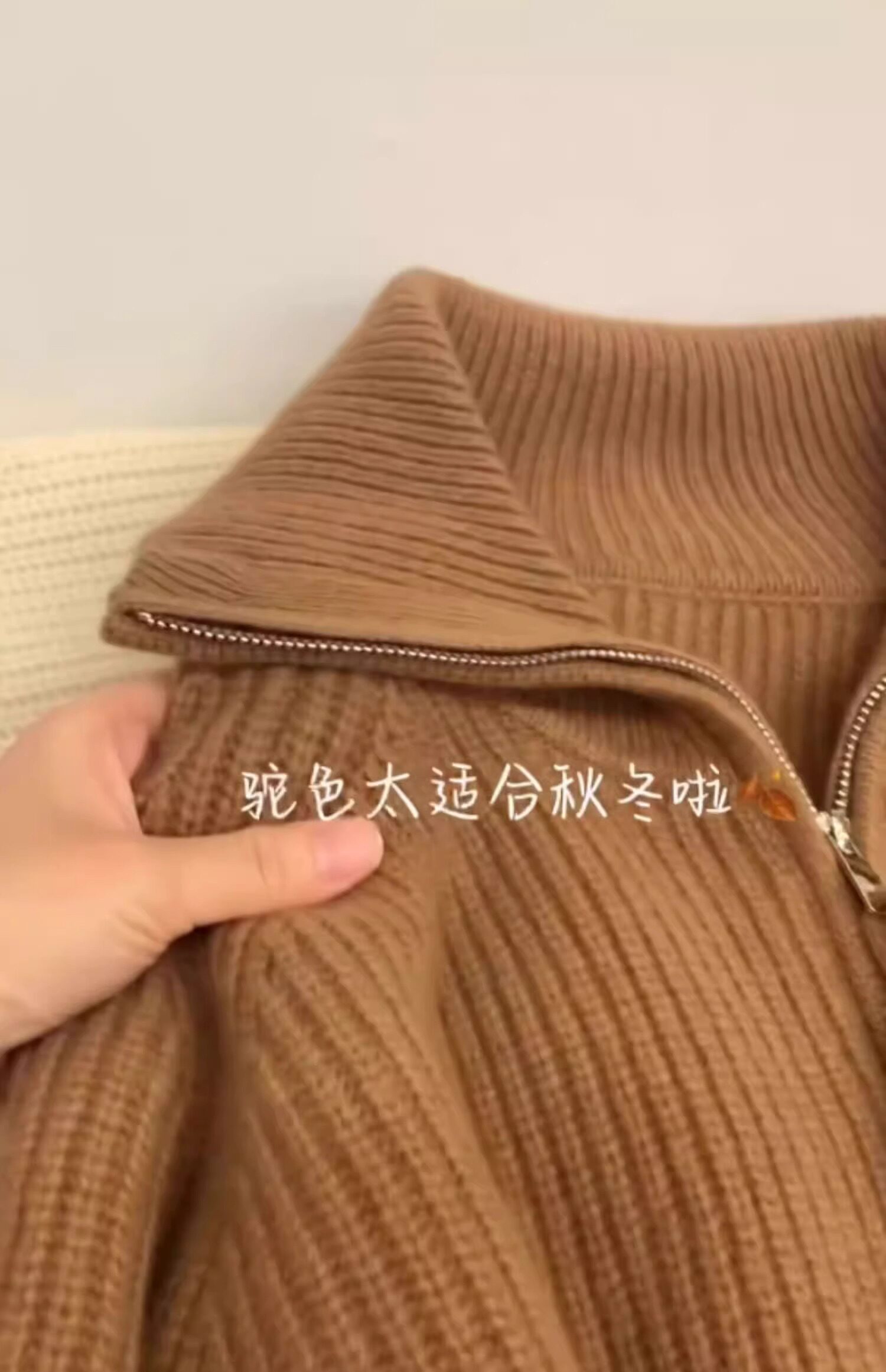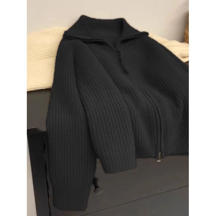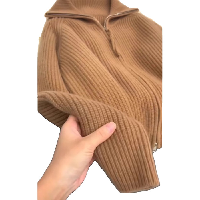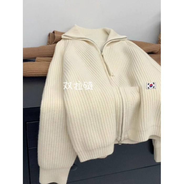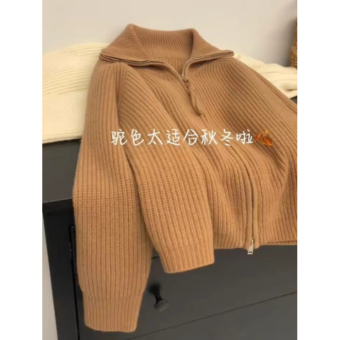 軟糯慵懶雙拉鍊毛衣外套女秋冬季翻領針織開衫寬松外搭浣熊絨上衣