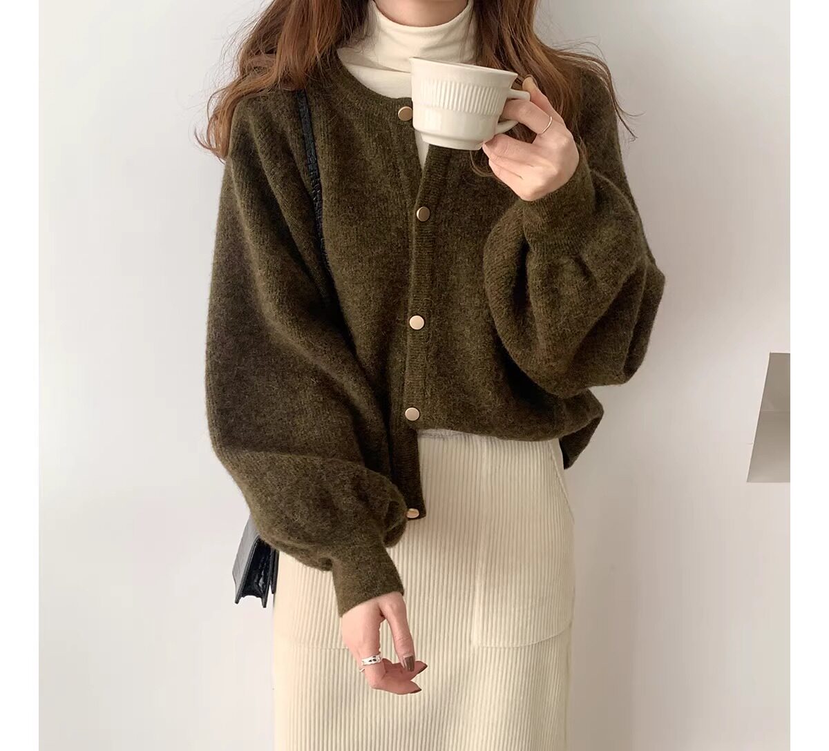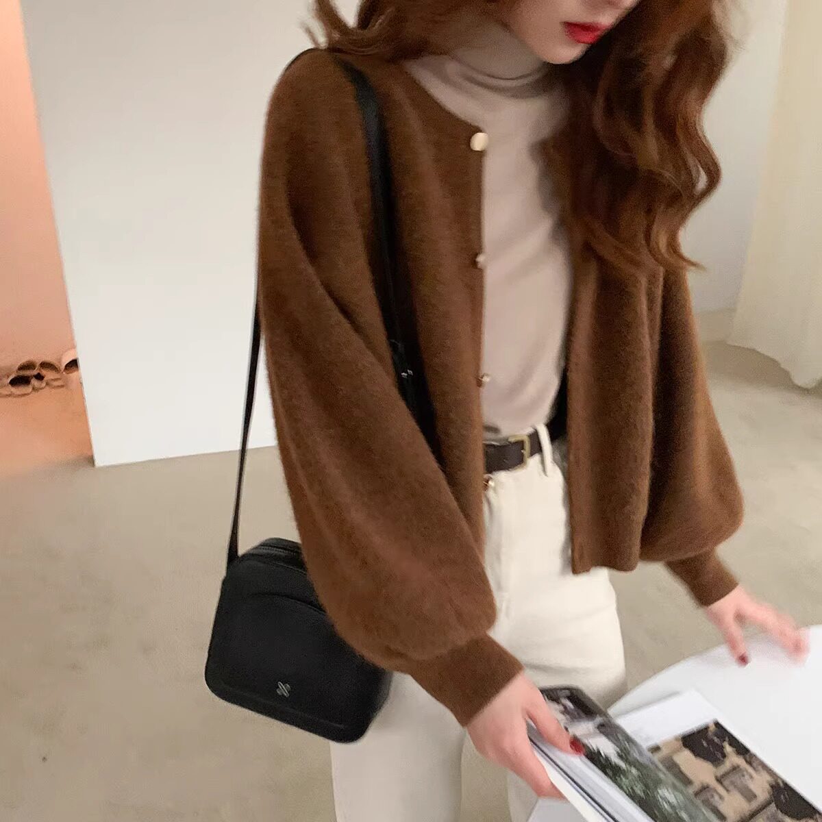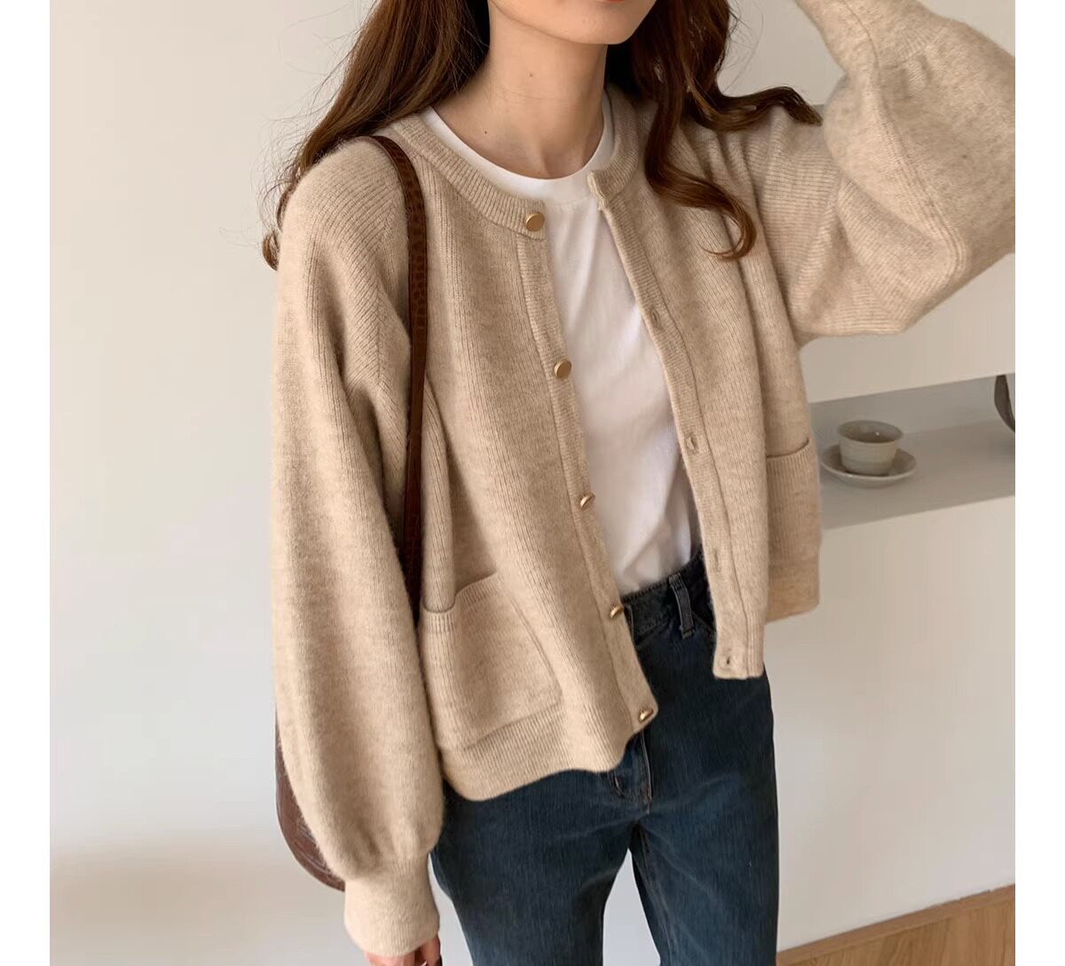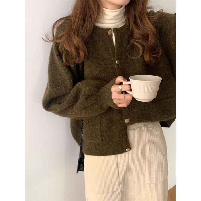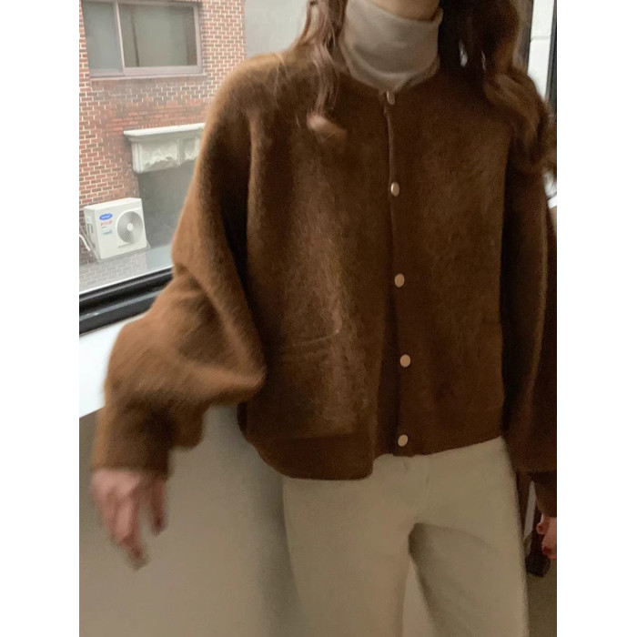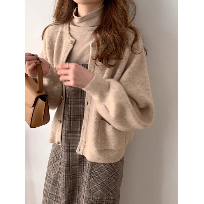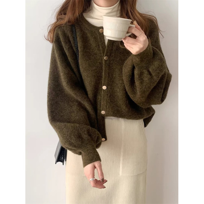 燈籠袖圓領毛衣外套女款秋冬新款日系復古寬松軟糯小香風針織開衫