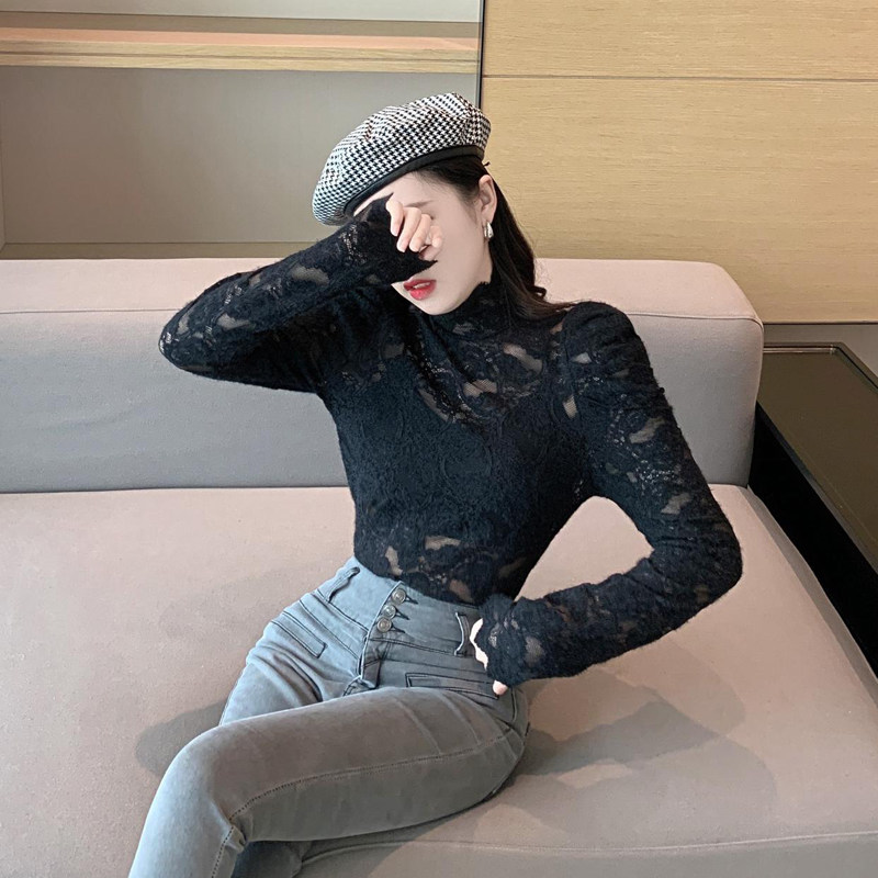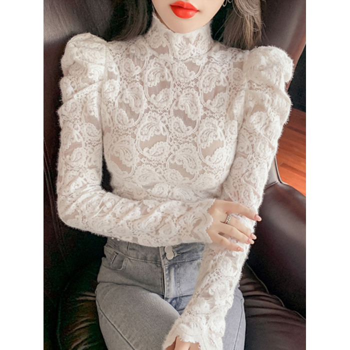 洋氣高領蕾絲打底衫女春秋冬新款加絨加厚修身內搭泡泡袖氣質上衣