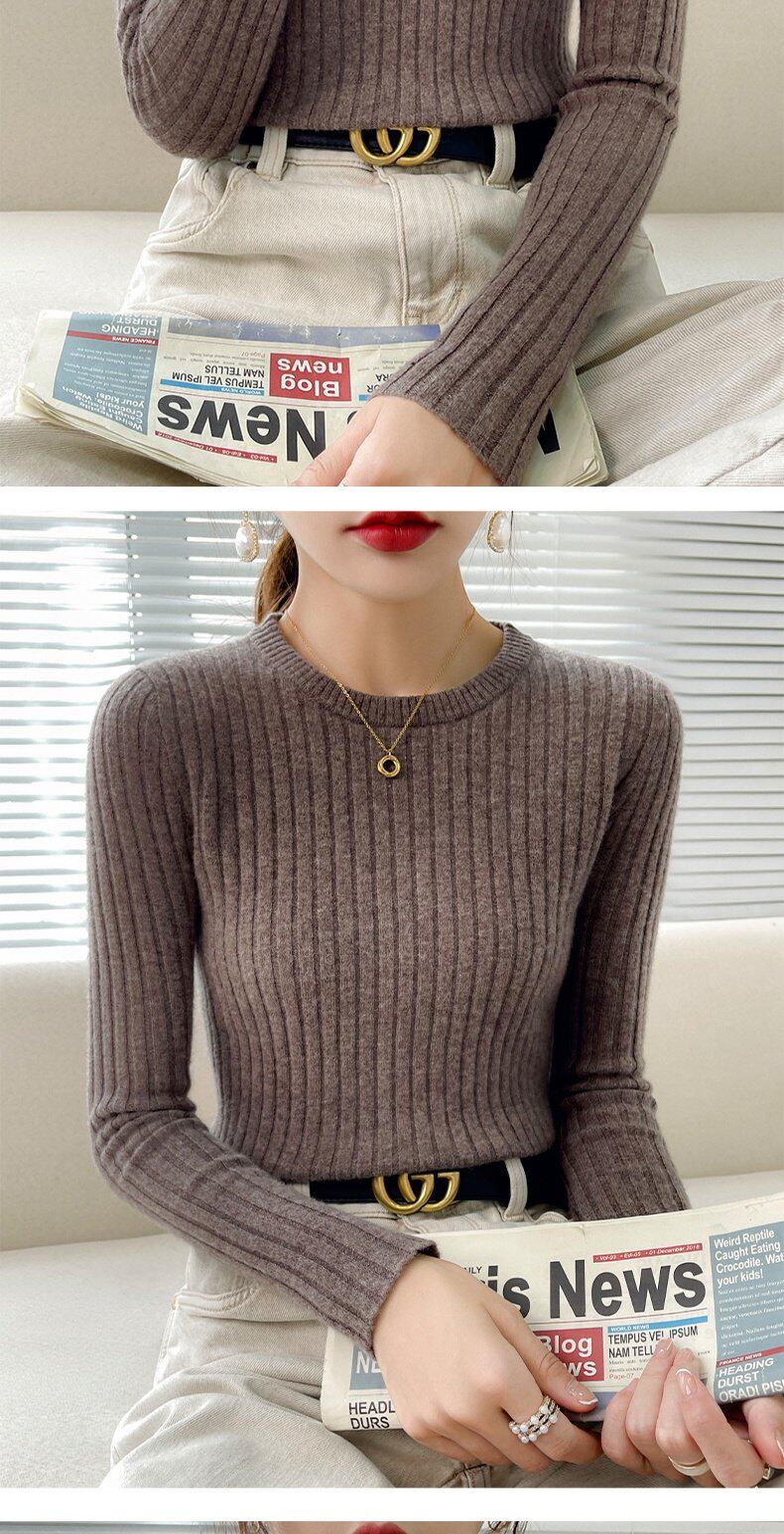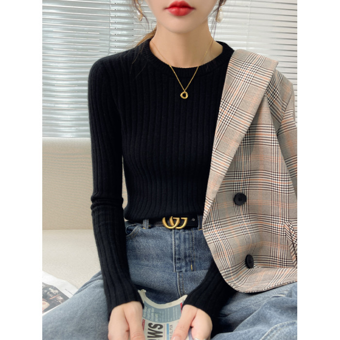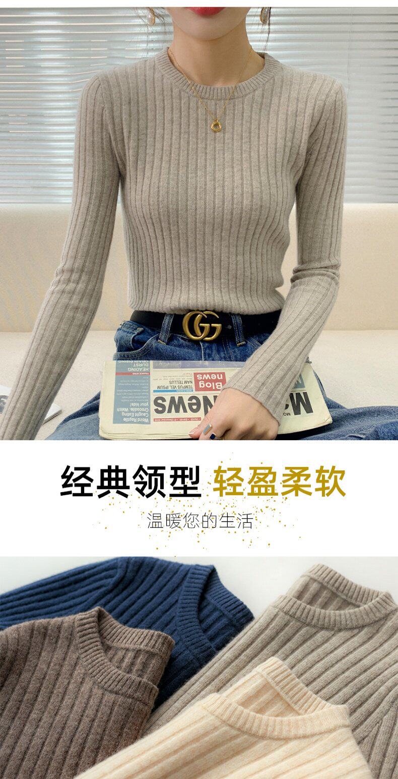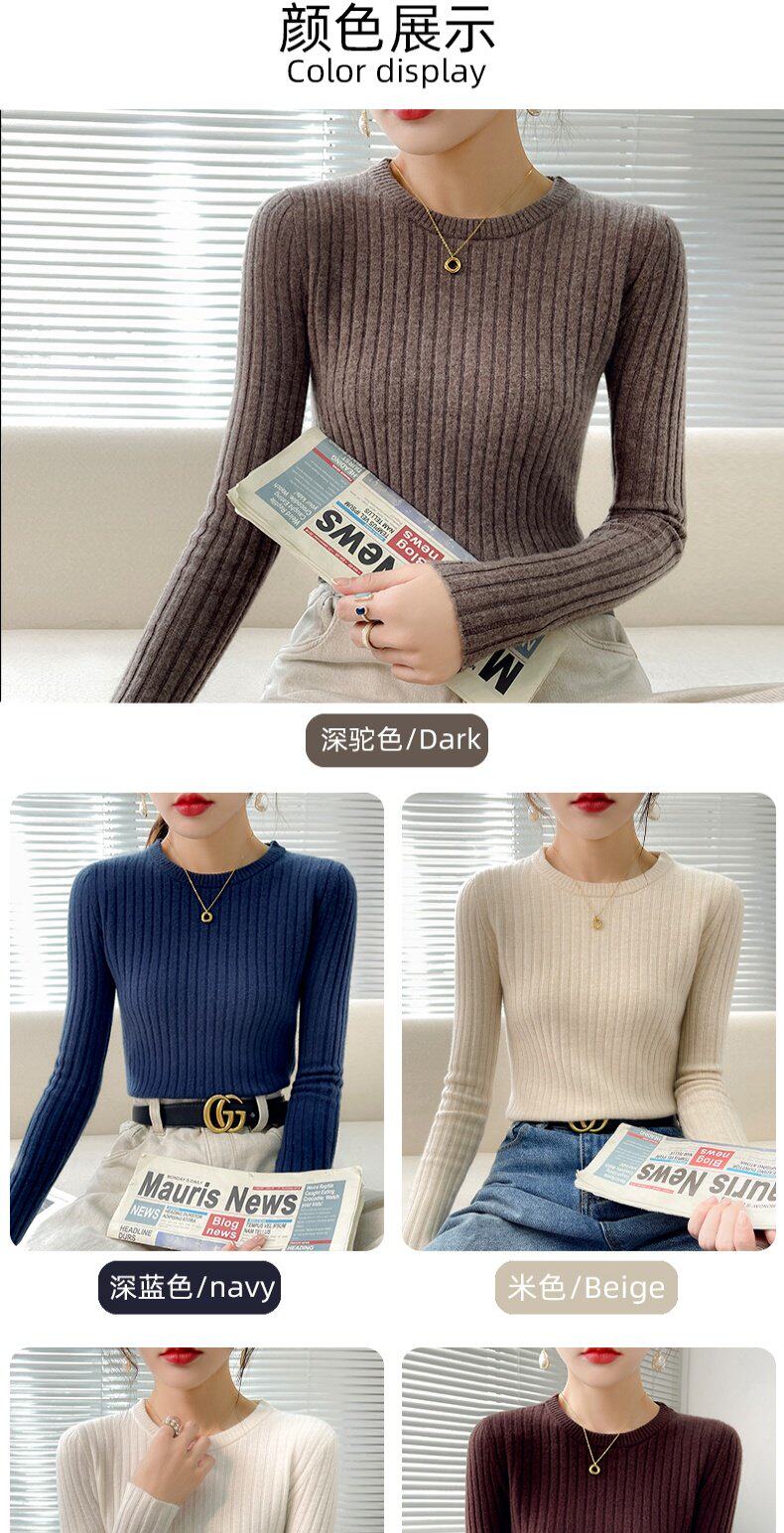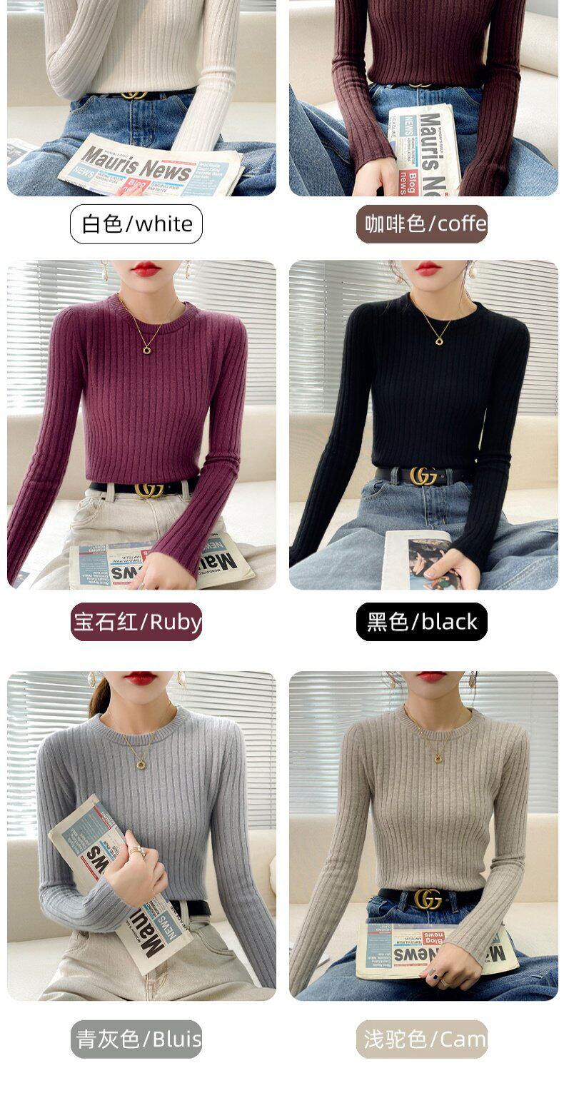 秋冬新款圓領配大衣針織衫女修身套頭打底衫長袖上衣內搭顯瘦毛衣