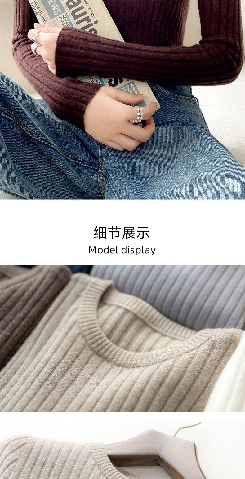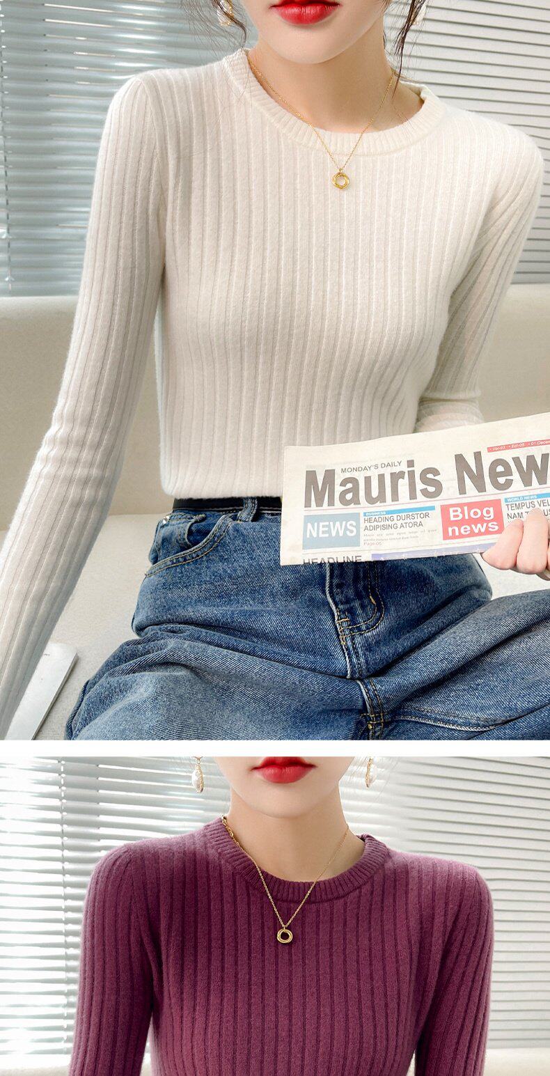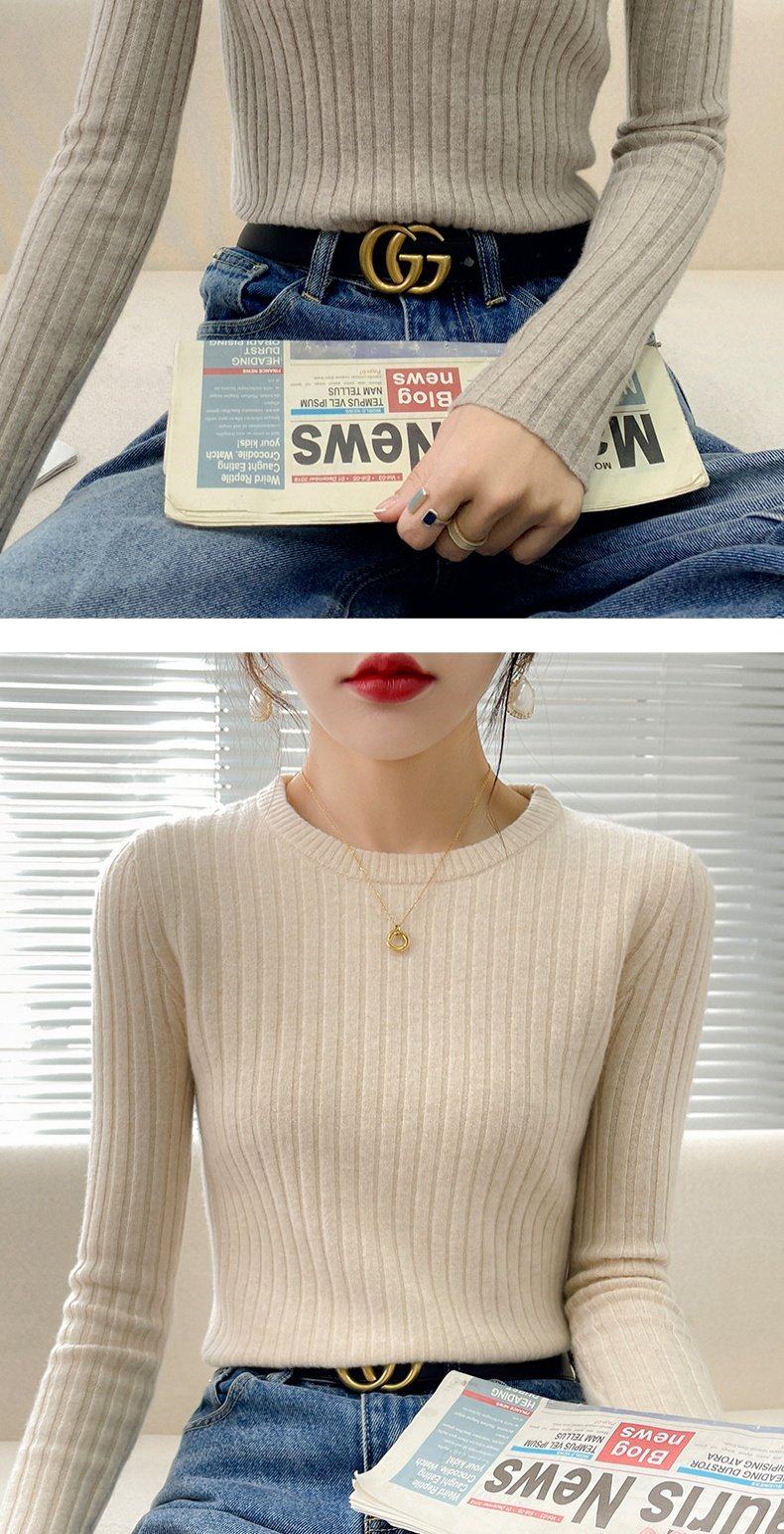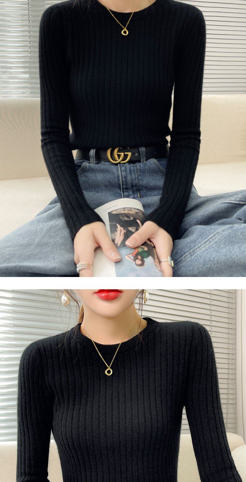 秋冬新款圓領配大衣針織衫女修身套頭打底衫長袖上衣內搭顯瘦毛衣