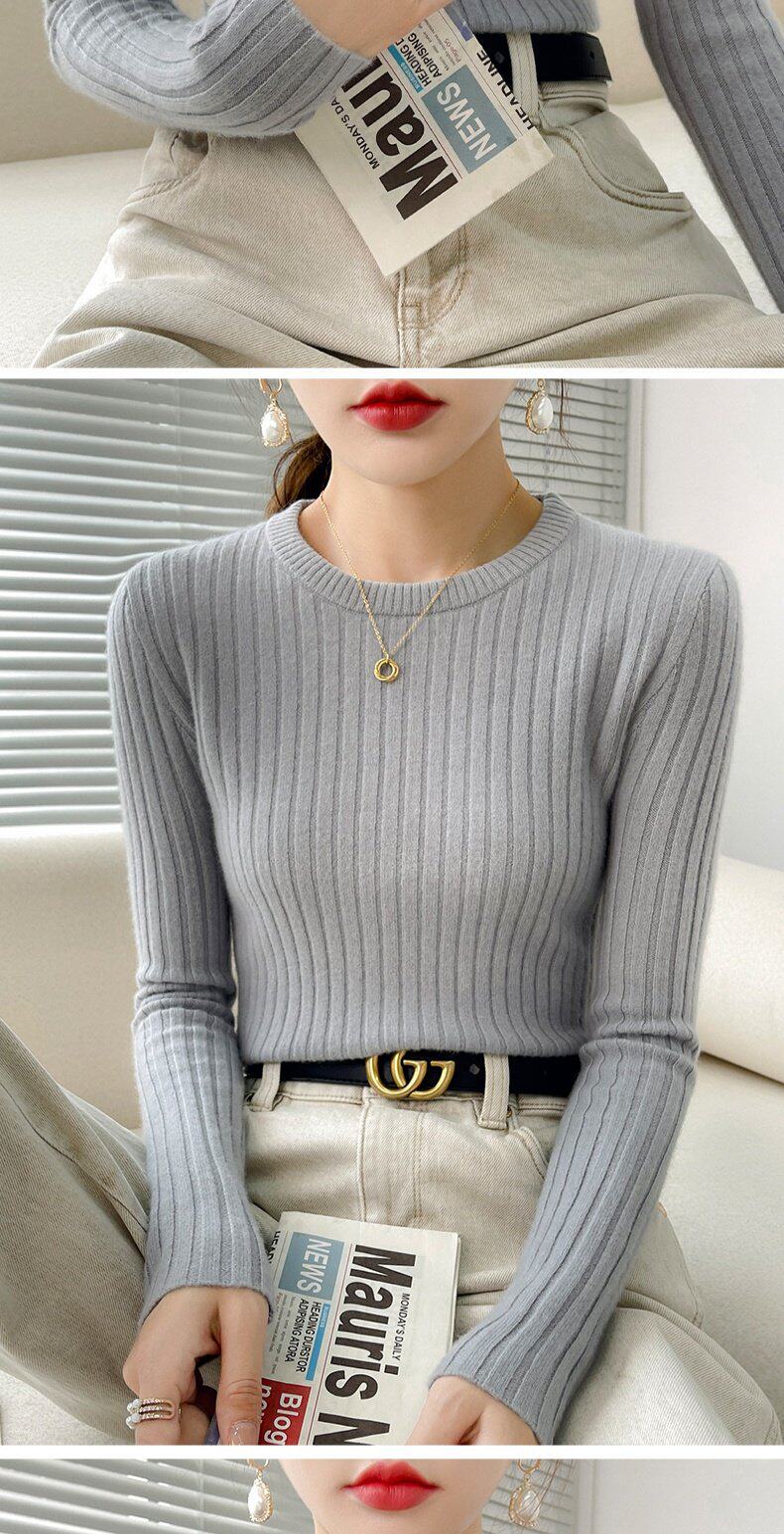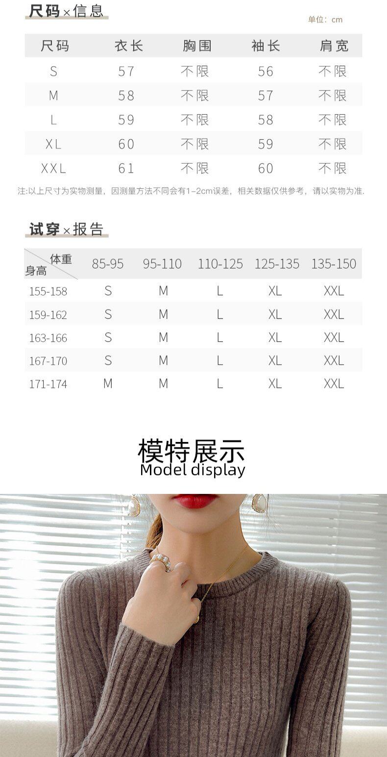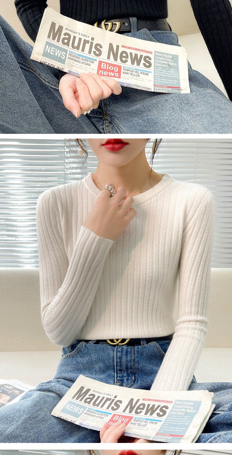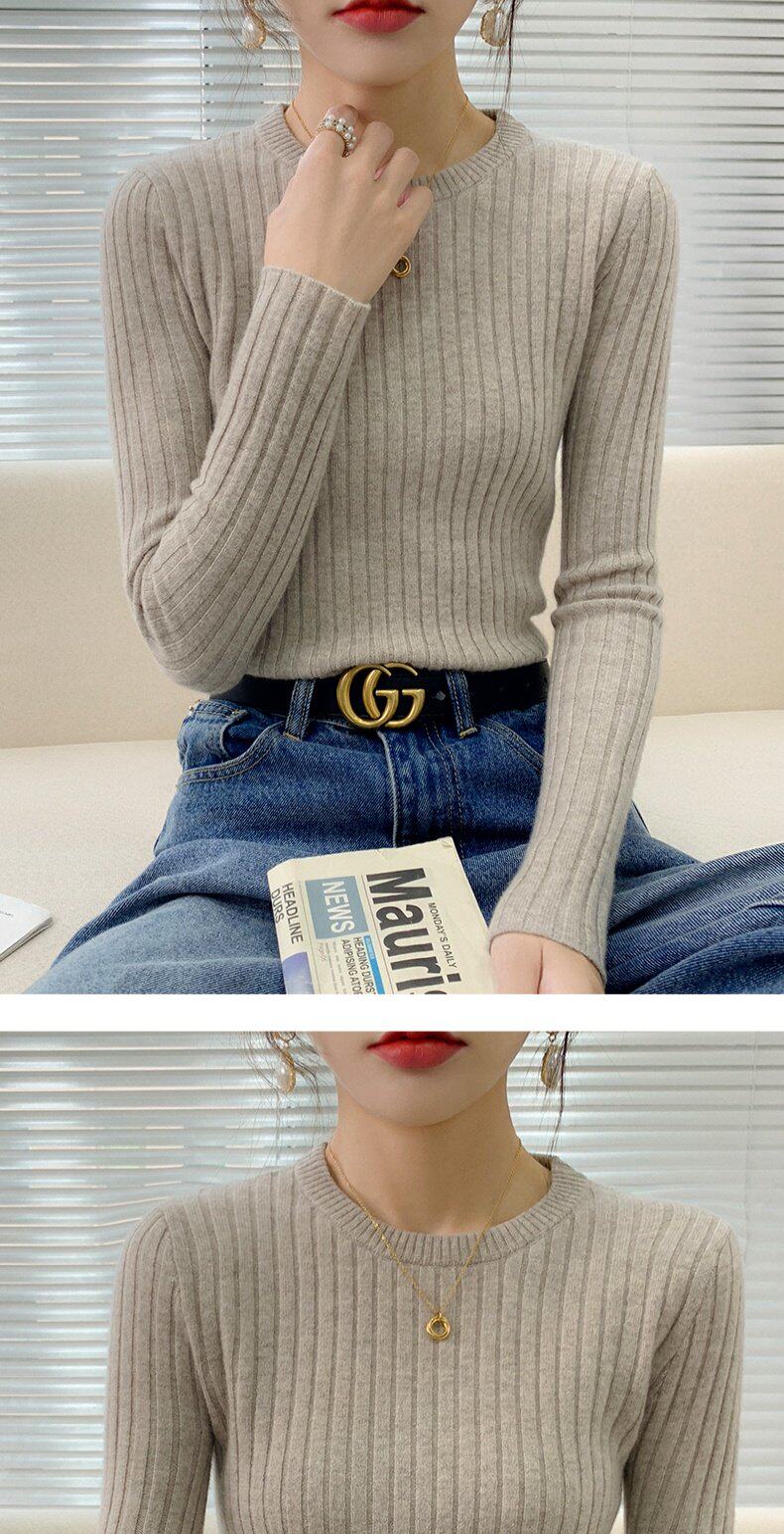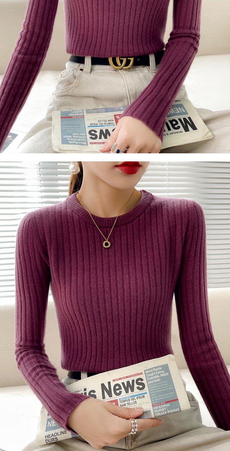 秋冬新款圓領配大衣針織衫女修身套頭打底衫長袖上衣內搭顯瘦毛衣
