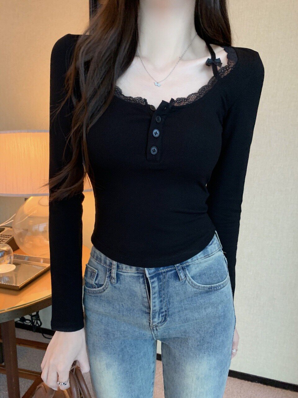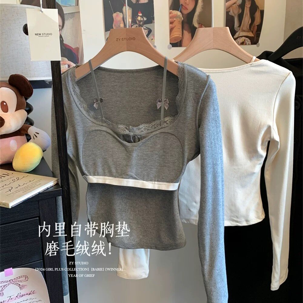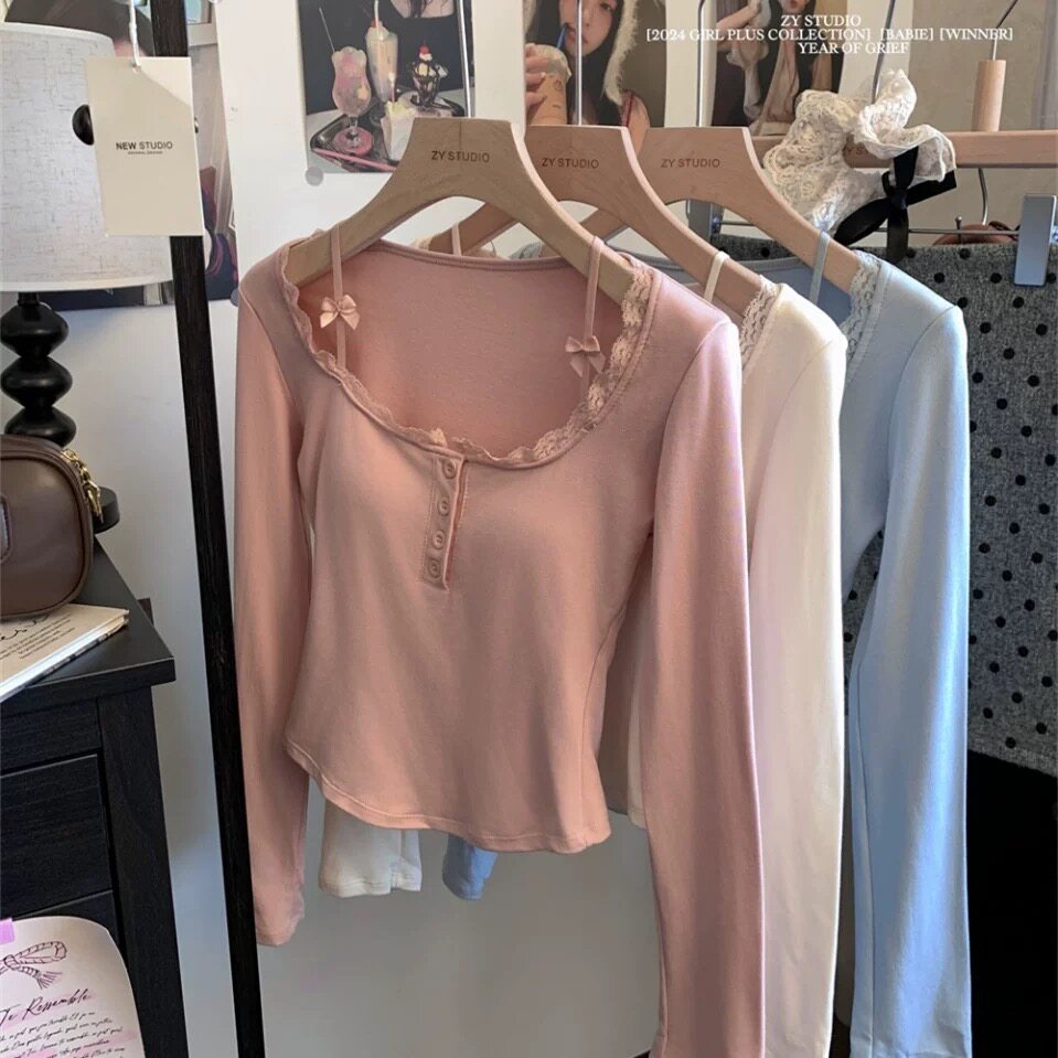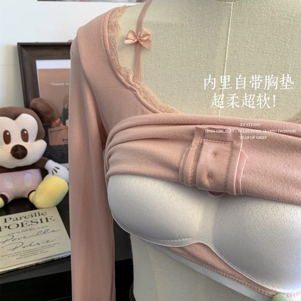 純欲蕾絲拼接紐釦長袖保暖T恤女帶胸墊甜辣修身顯瘦打底內搭上衣