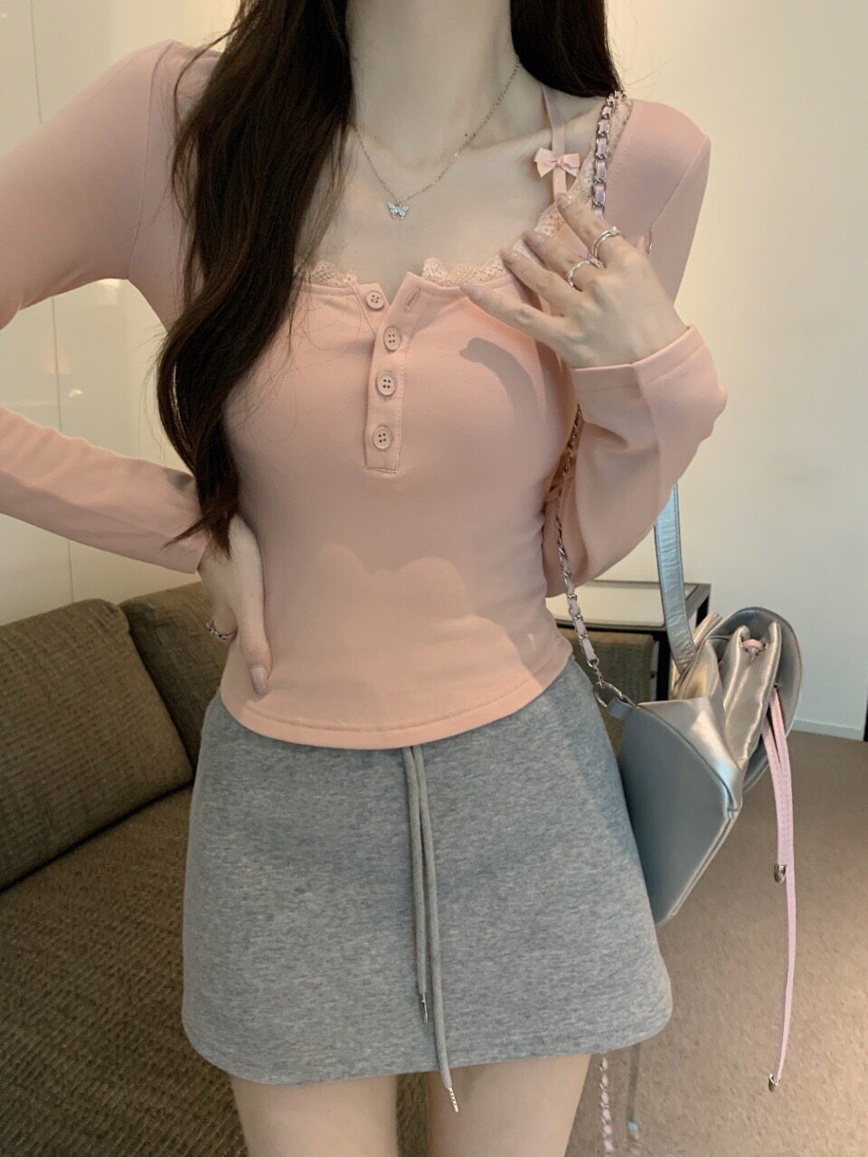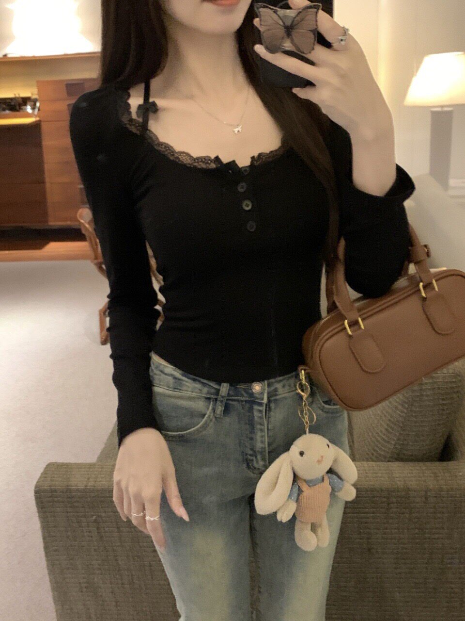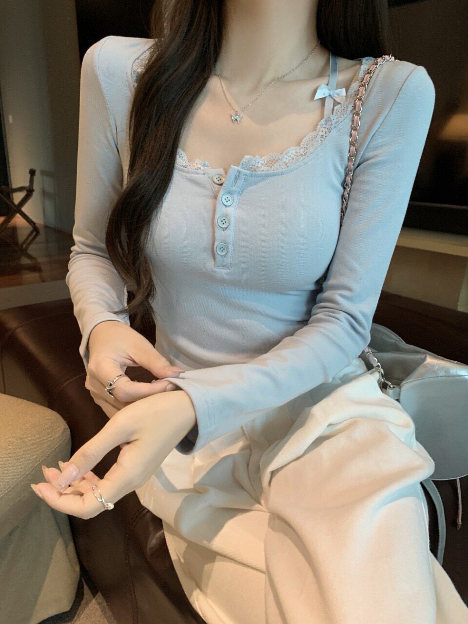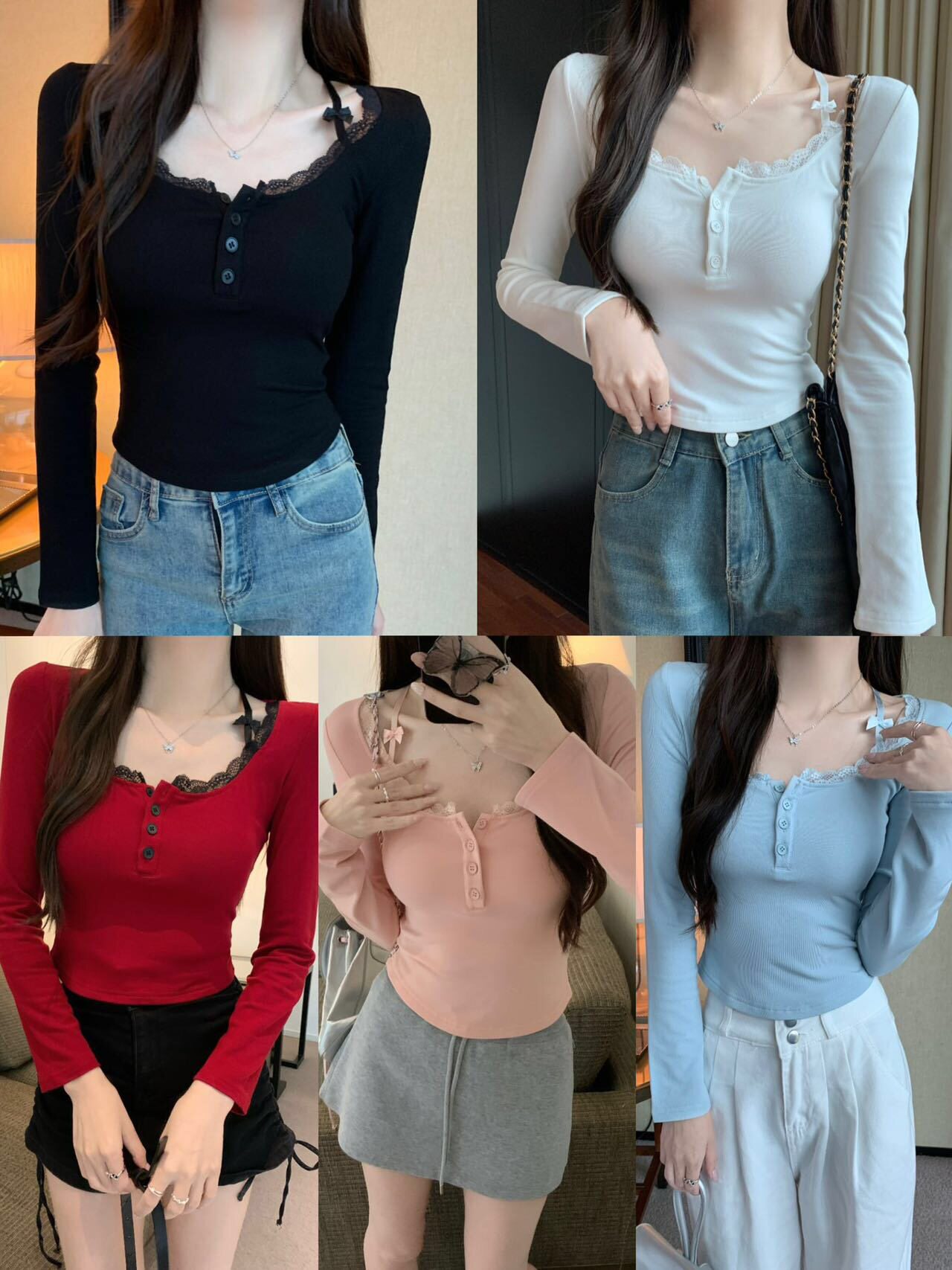 純欲蕾絲拼接紐釦長袖保暖T恤女帶胸墊甜辣修身顯瘦打底內搭上衣