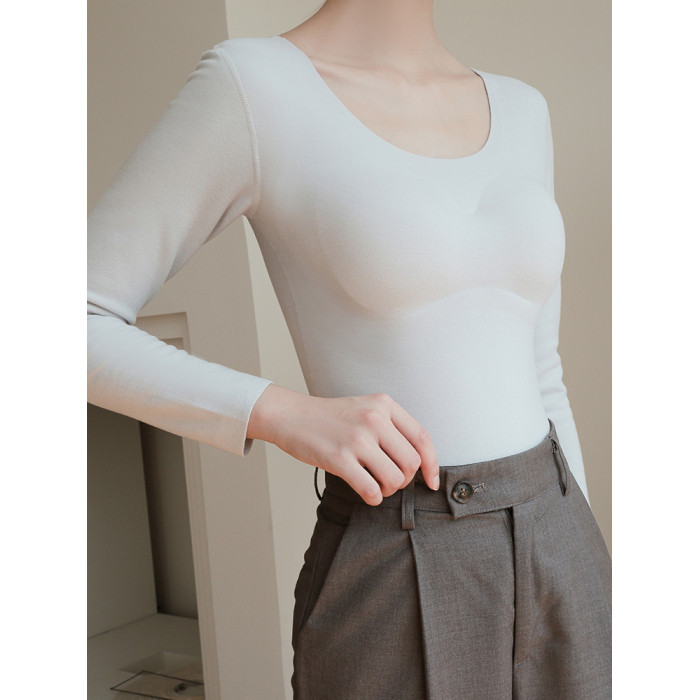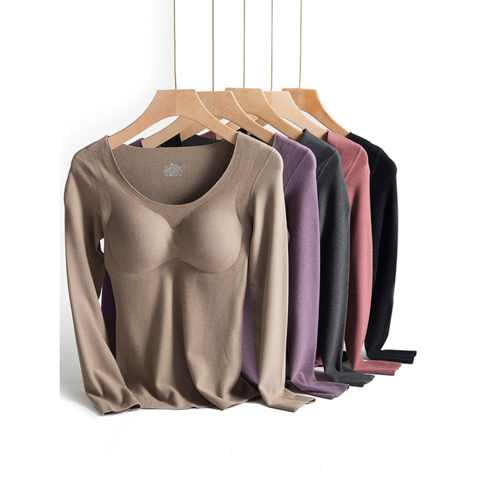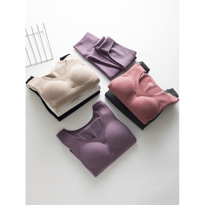 女士無痕德絨保暖內衣帶胸墊套裝加絨加厚秋衣髮熱打底衫秋冬上衣