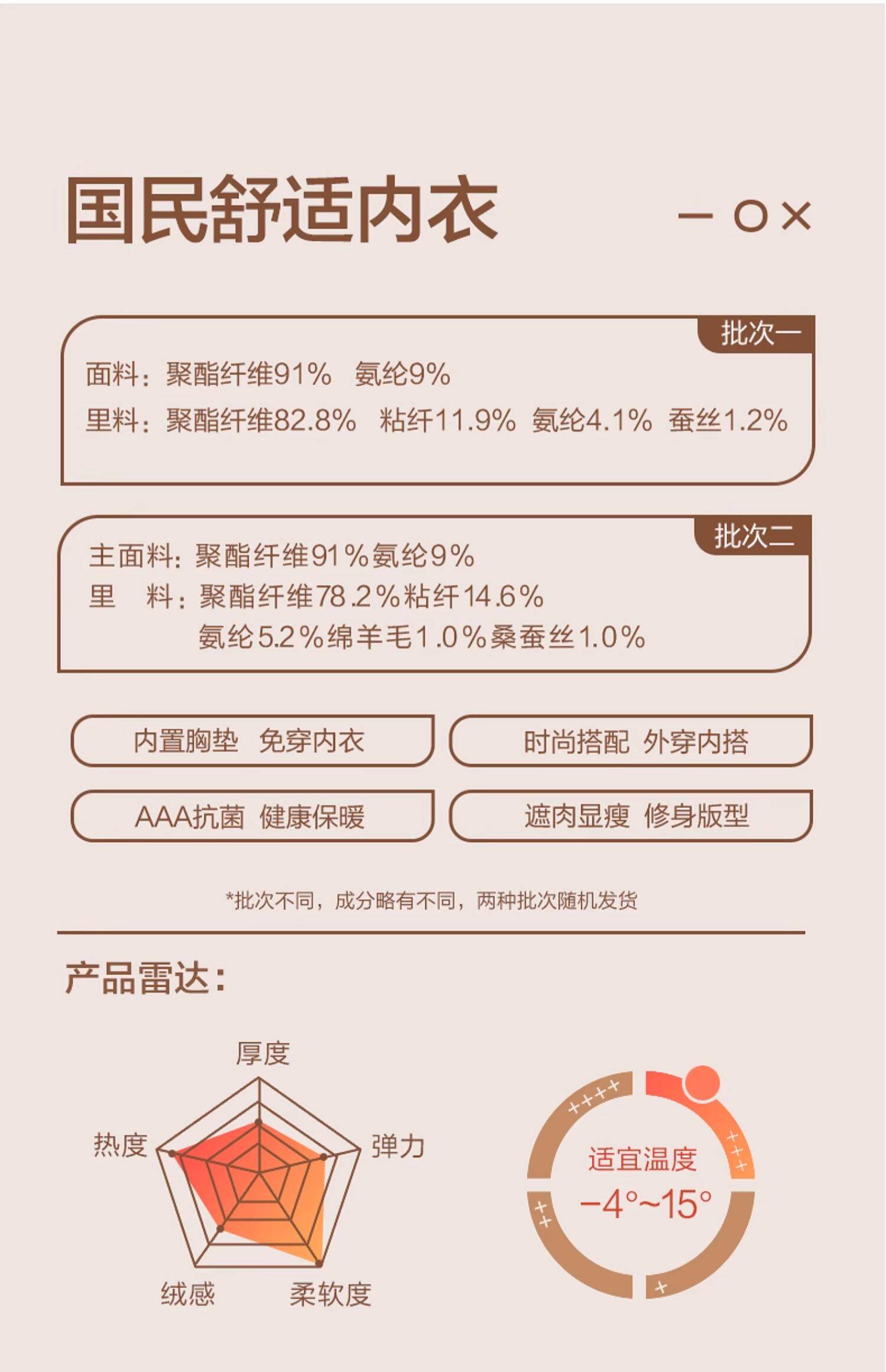 裡料材質成分 聚酯纖維82.8% 粘膠纖維(粘纖)11.9% 聚氨酯彈性纖維(氨綸)4.1% 桑蠶絲1.2%