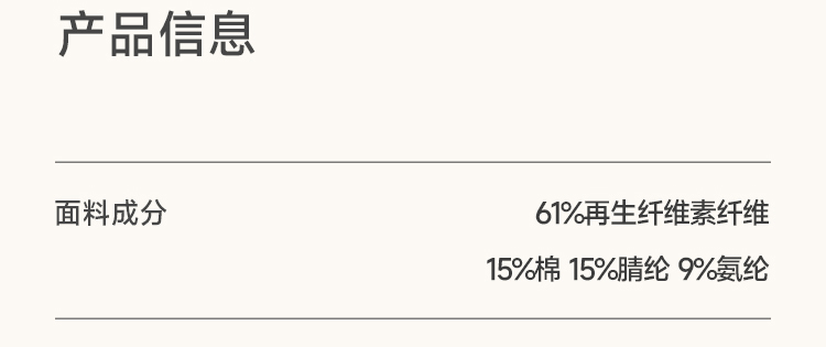 | 面料材質成分 | 再生纖維素纖維61% 棉15% 聚丙烯腈纖維(腈綸)15% 聚氨酯彈性纖維(氨綸)9% |