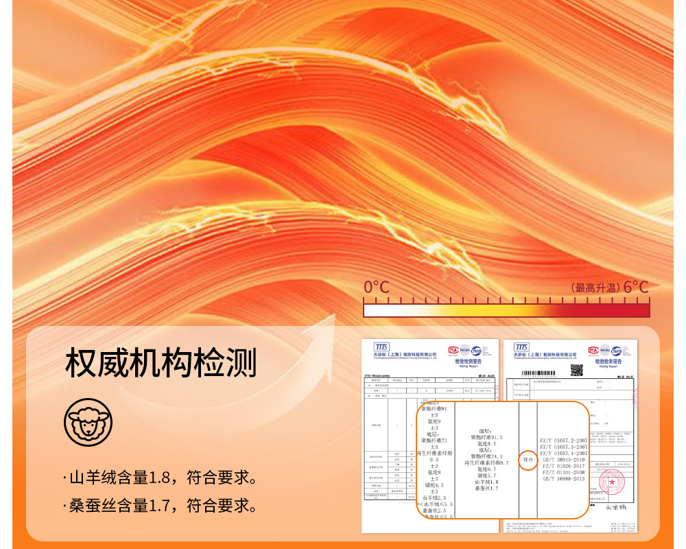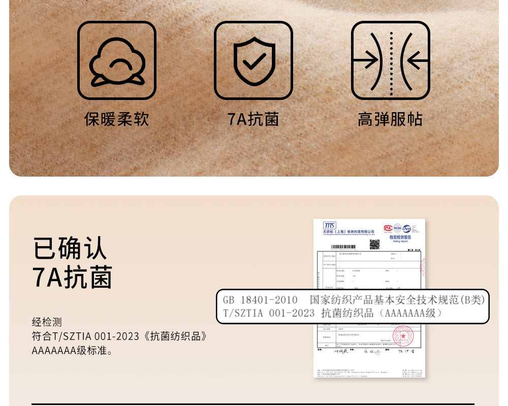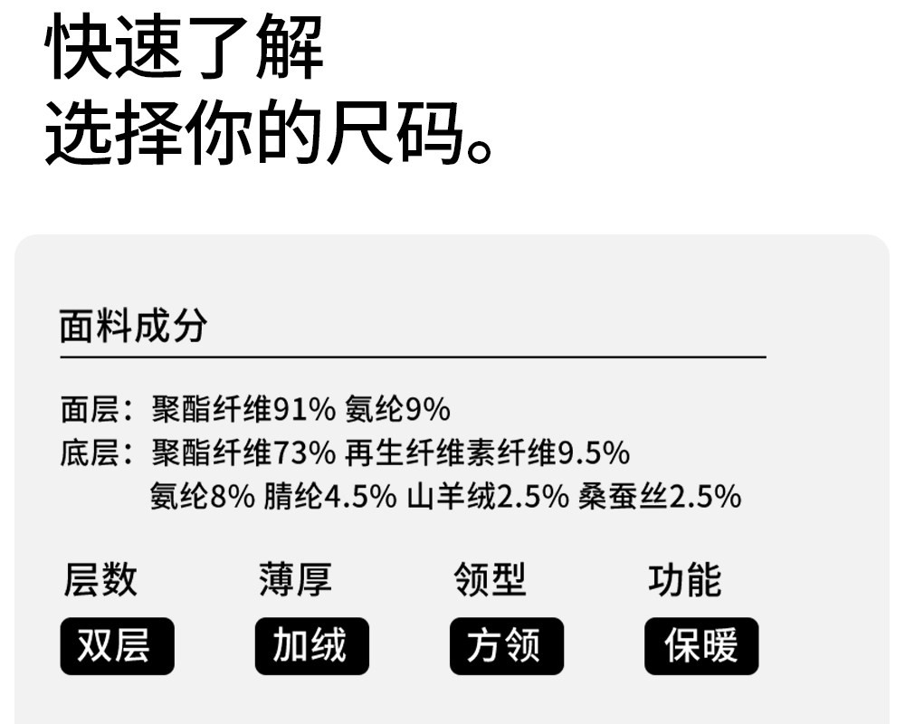 | 裡料材質成分 | 聚酯纖維73% 再生纖維素纖維9.5% 聚氨酯彈性纖維(氨綸)8% 聚丙烯腈纖維(腈綸)4.5% 山羊羢(羊羢)2.5% 桑蠶絲2.5% |