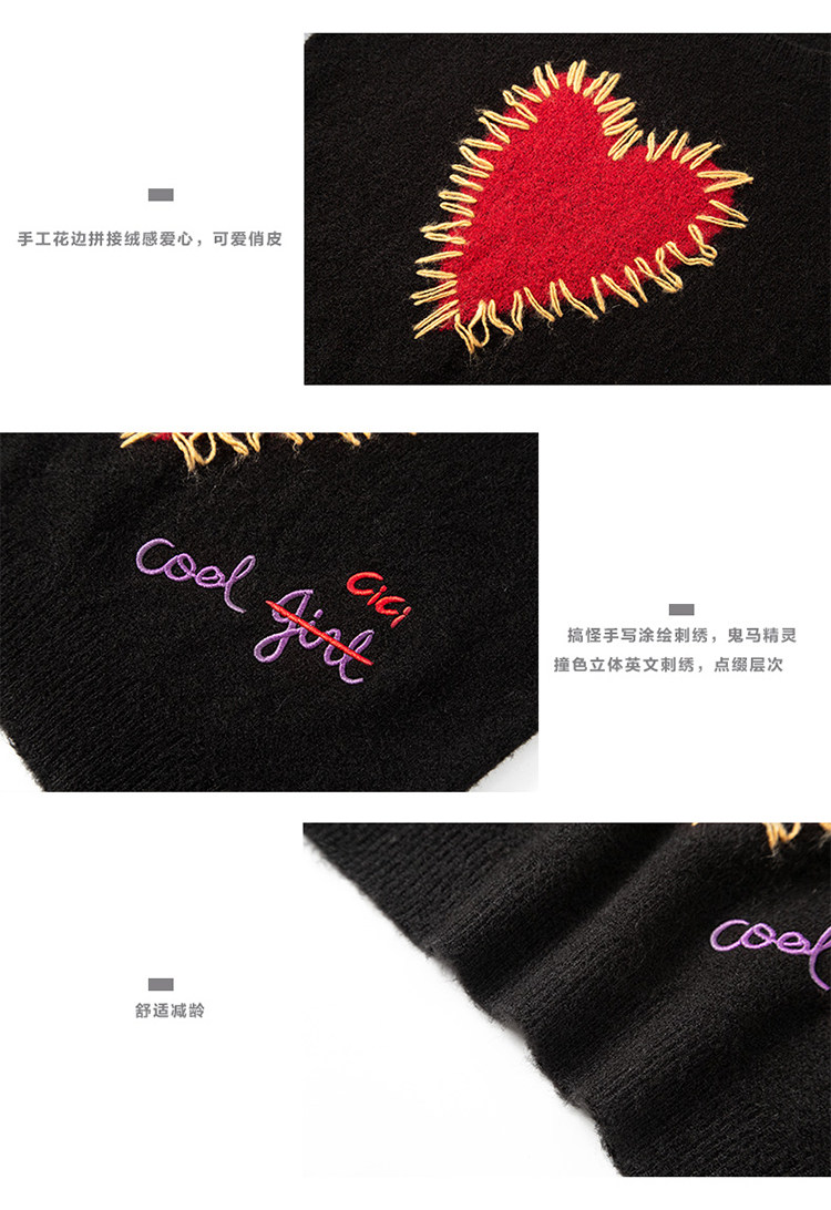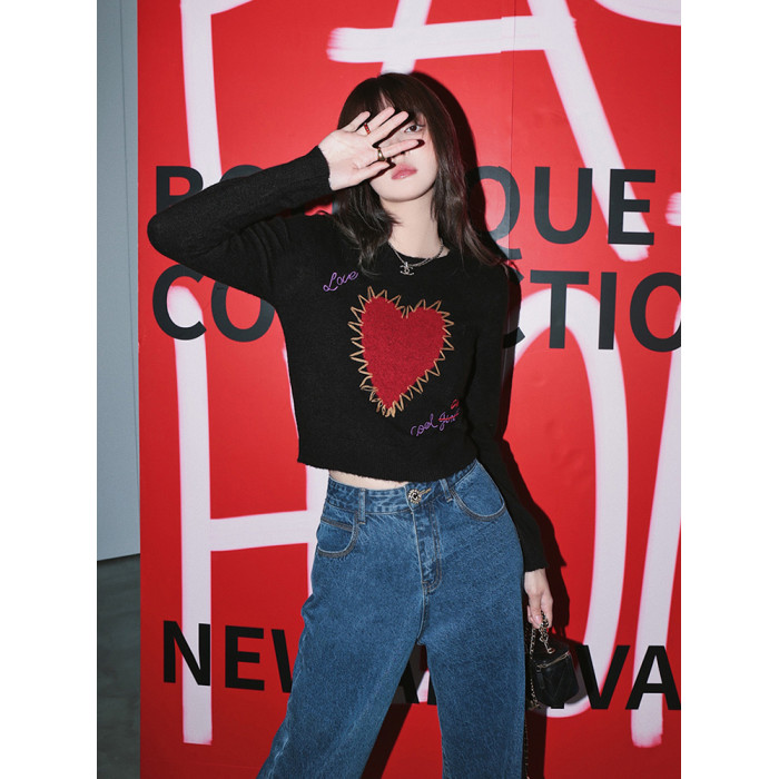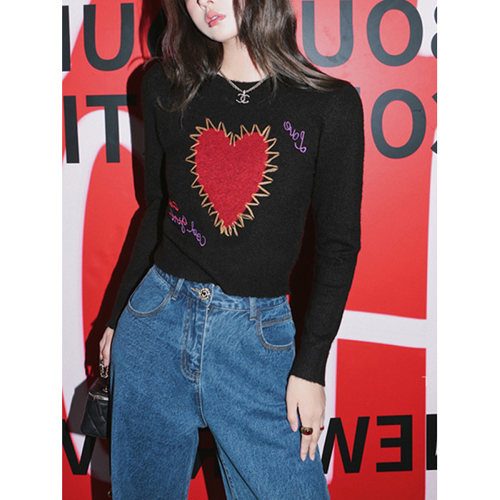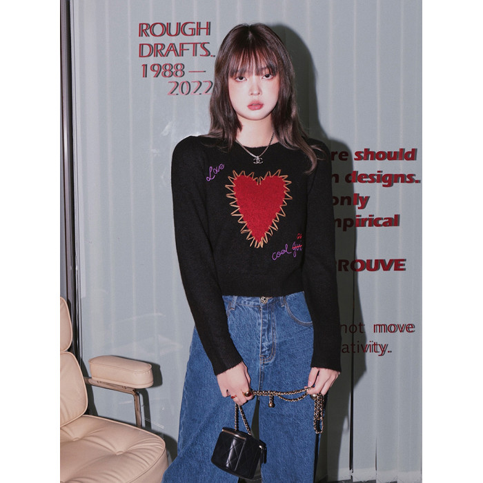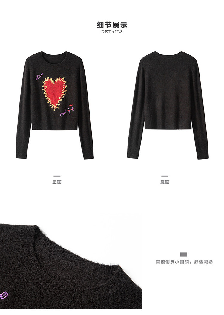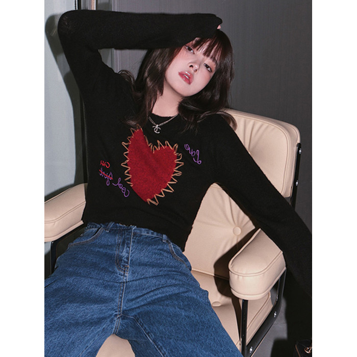甜酷辣妹愛心刺綉上衣黑色毛衣女套頭圓領秋冬內搭打底針織衫短款