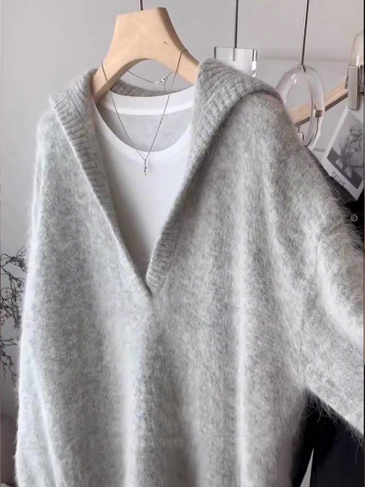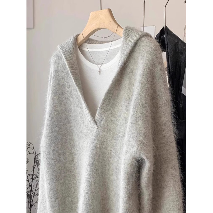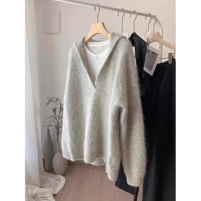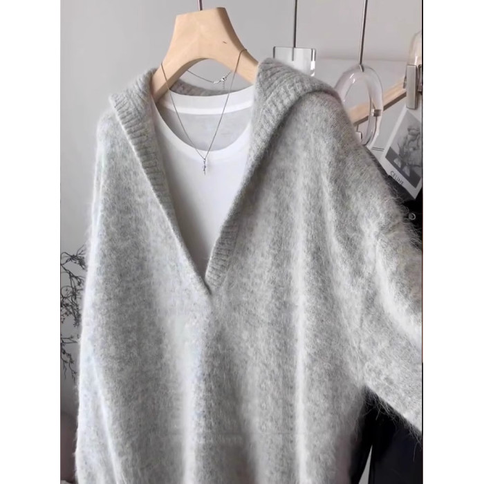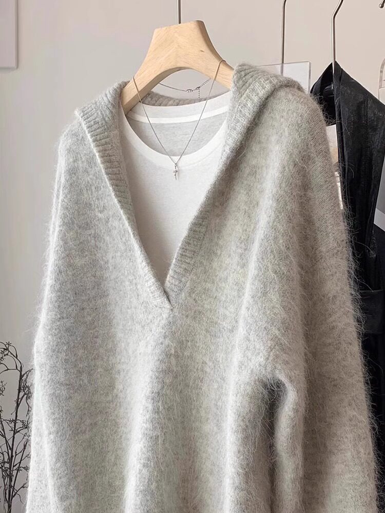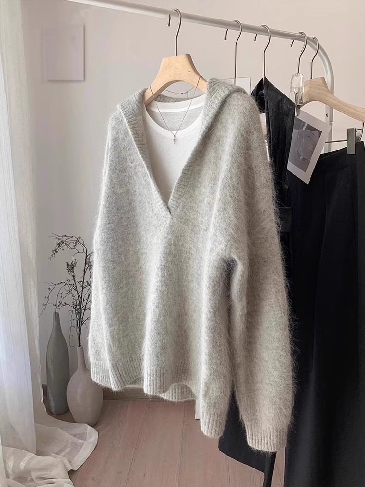 無D推薦!歐貨高級灰色羊駝毛毛衣女春季加厚寬松V領慵懶風針織衫