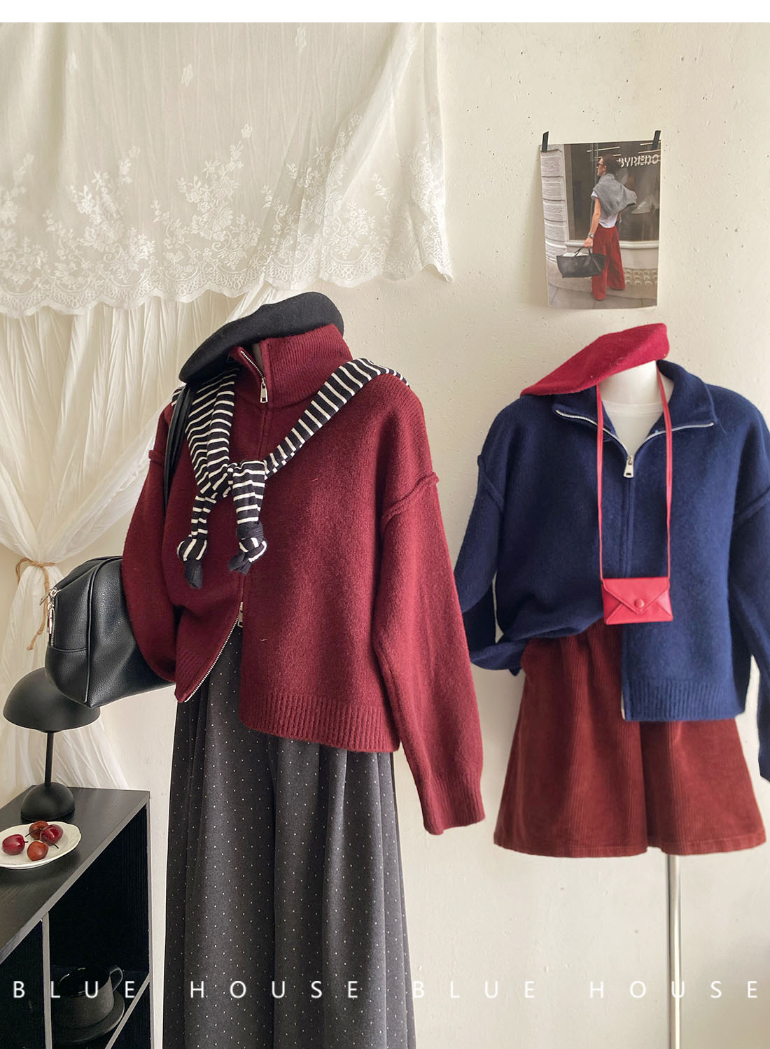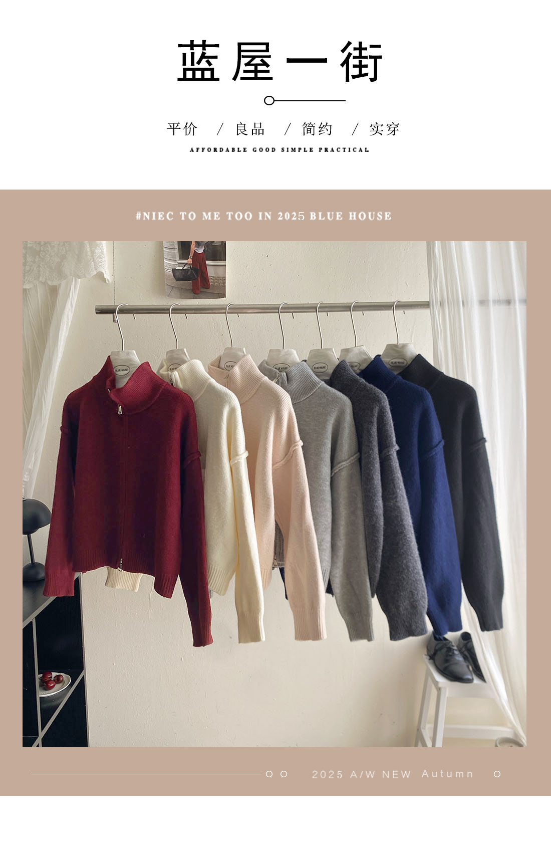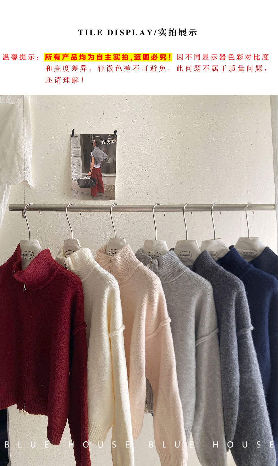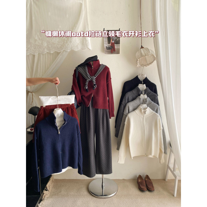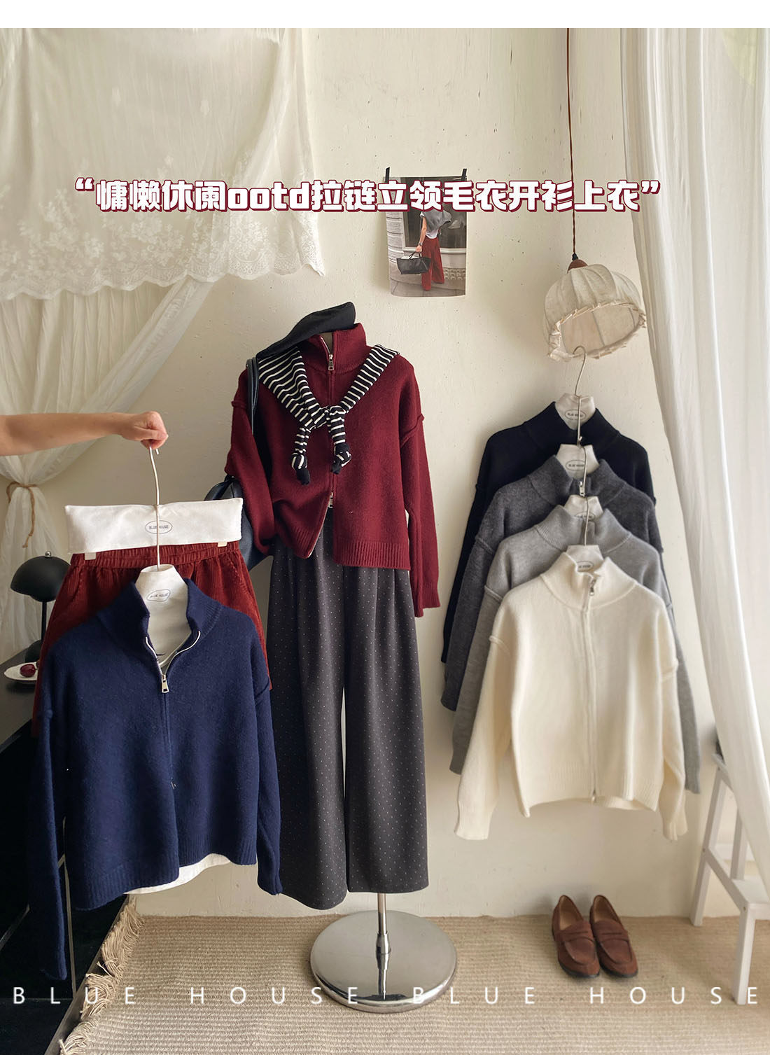 復古雙拉鍊立領毛衣外套女秋冬法式反車拼接長袖休閒減齡針織開衫