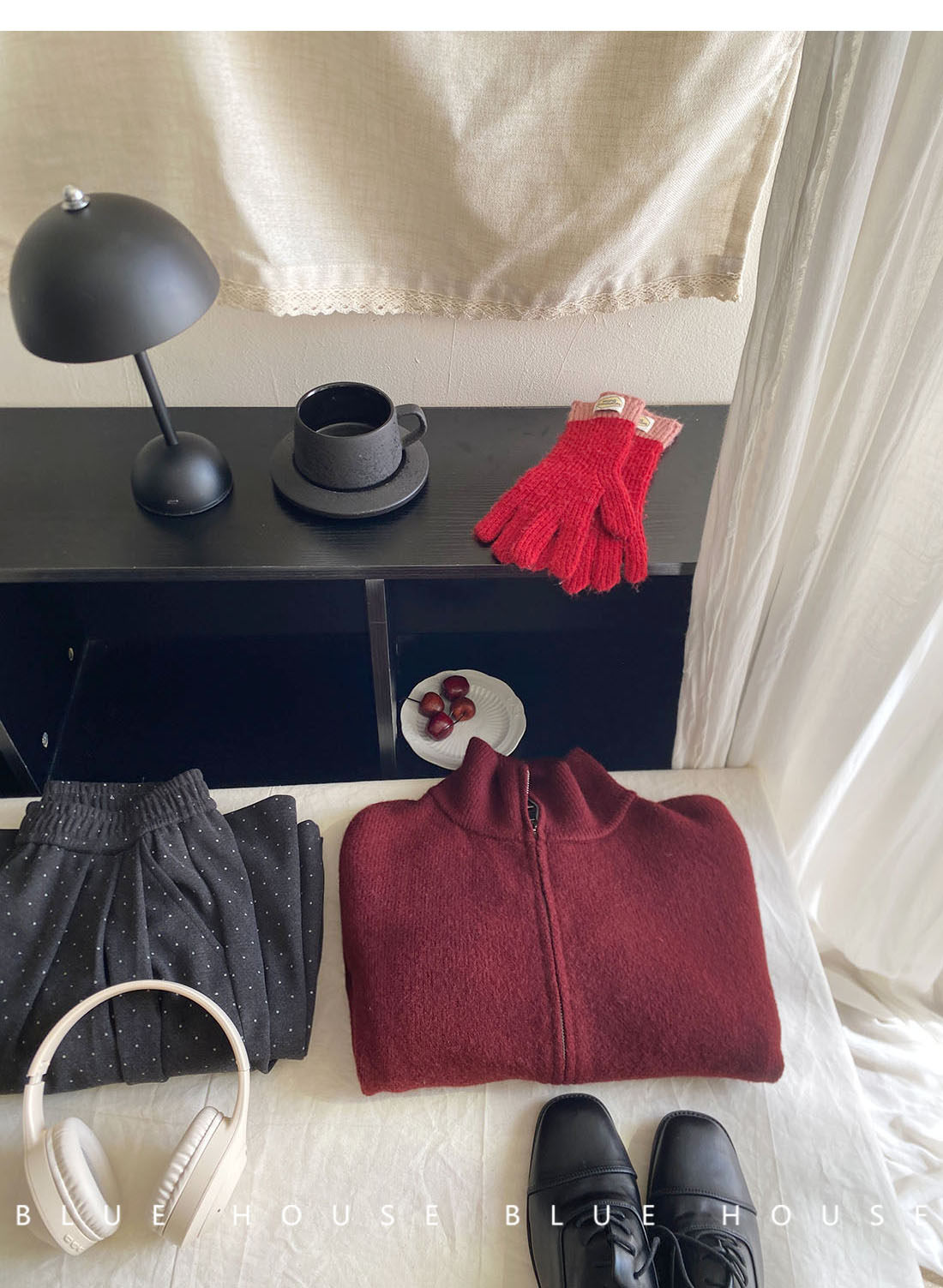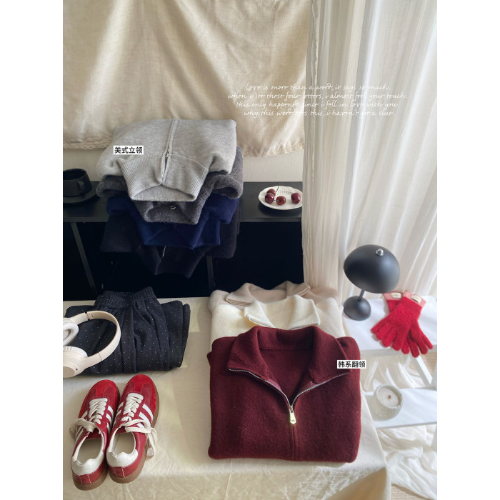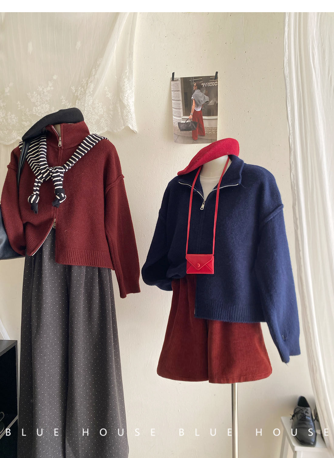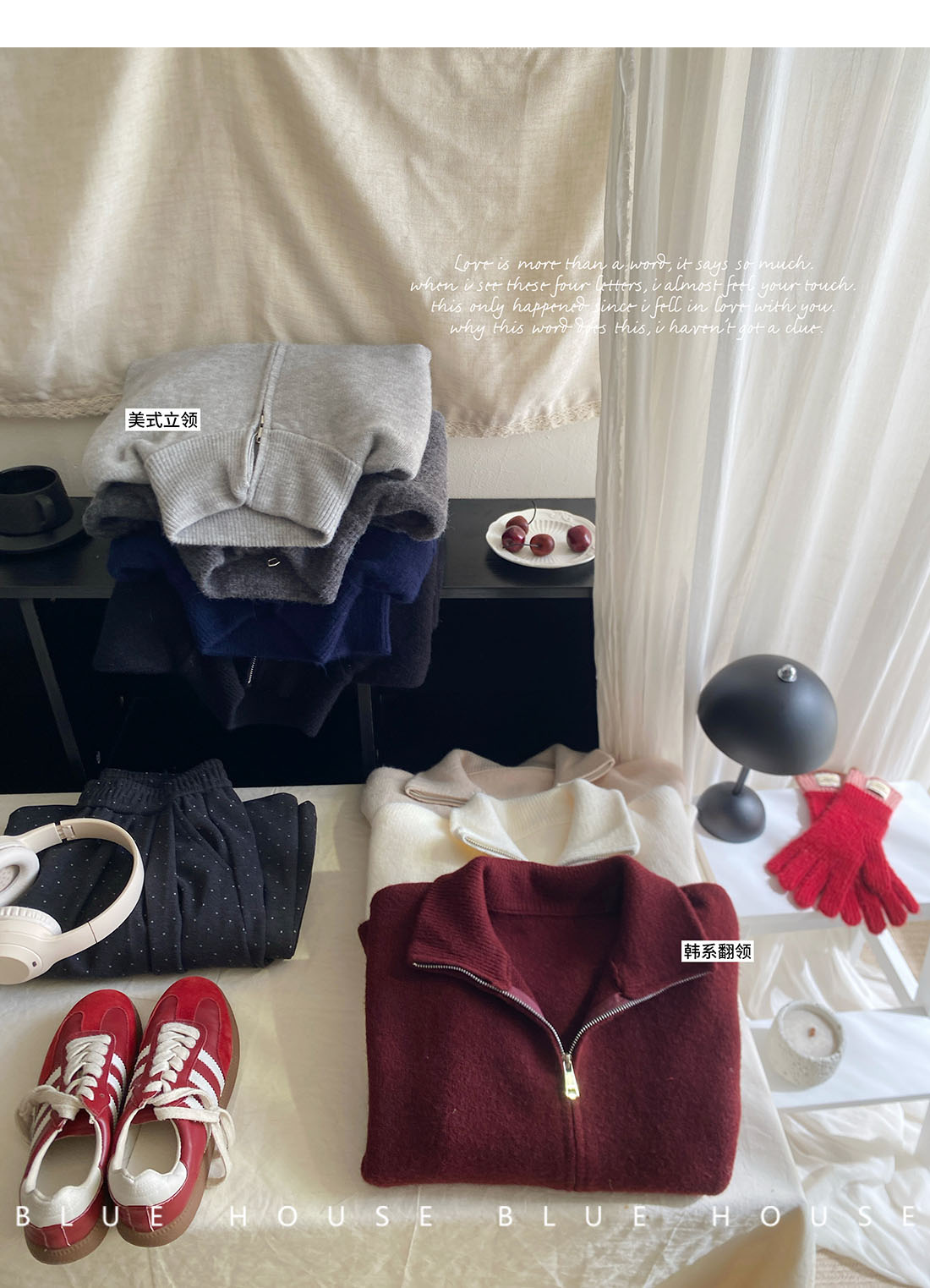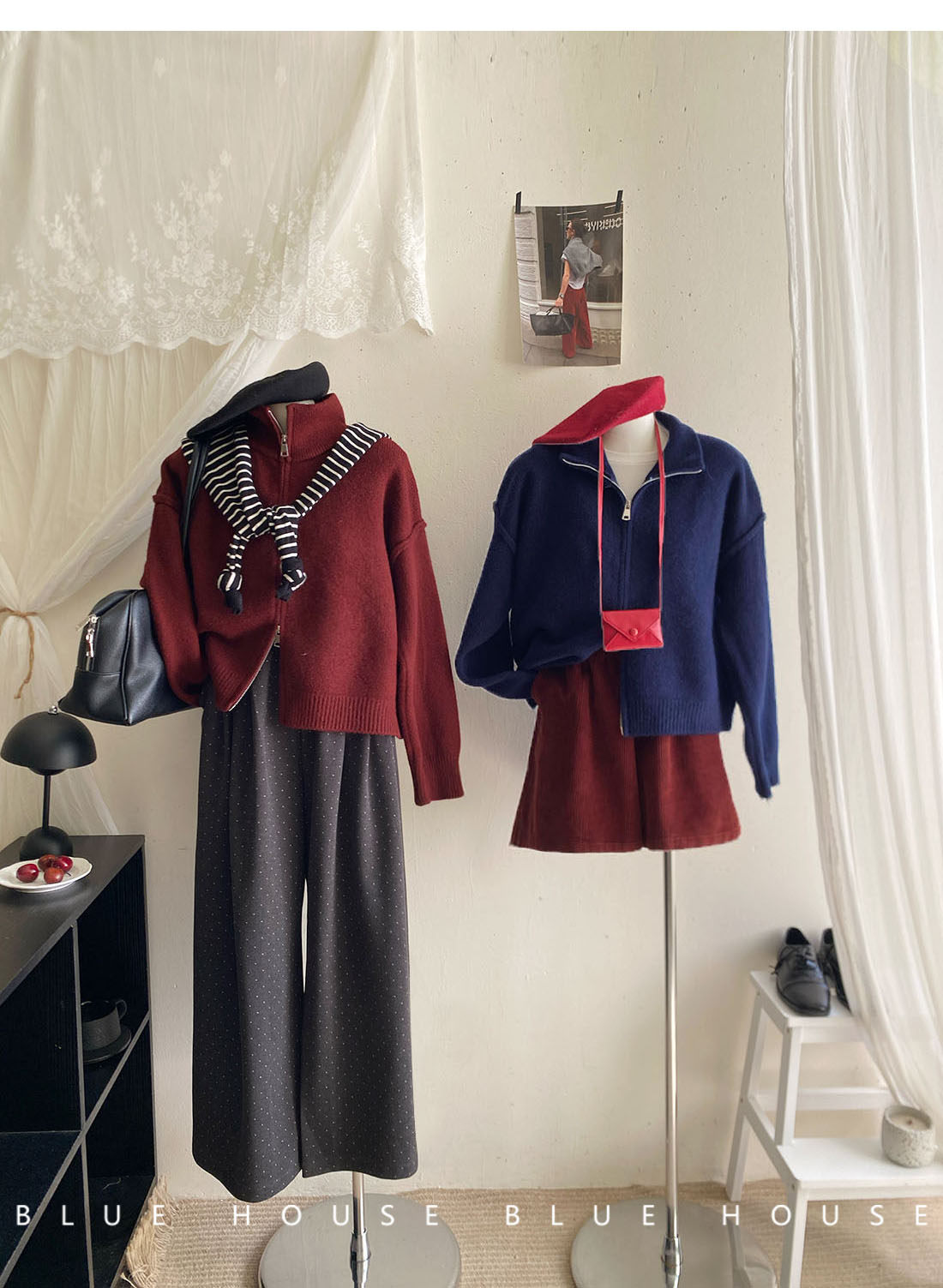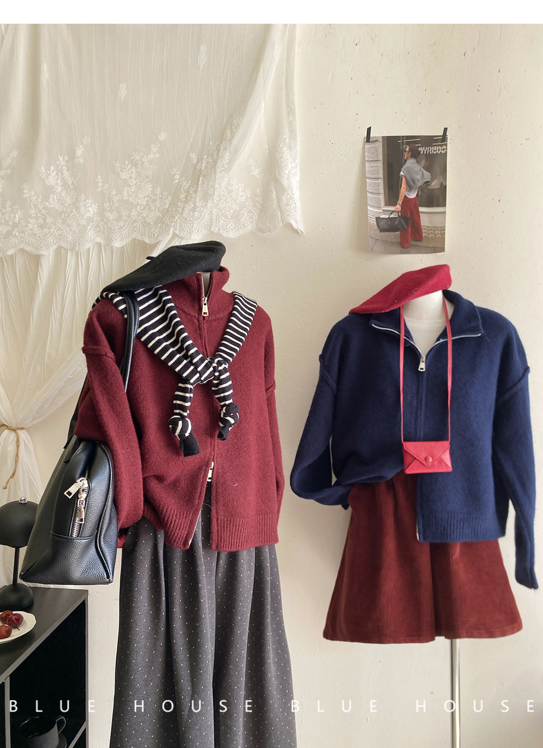 復古雙拉鍊立領毛衣外套女秋冬法式反車拼接長袖休閒減齡針織開衫