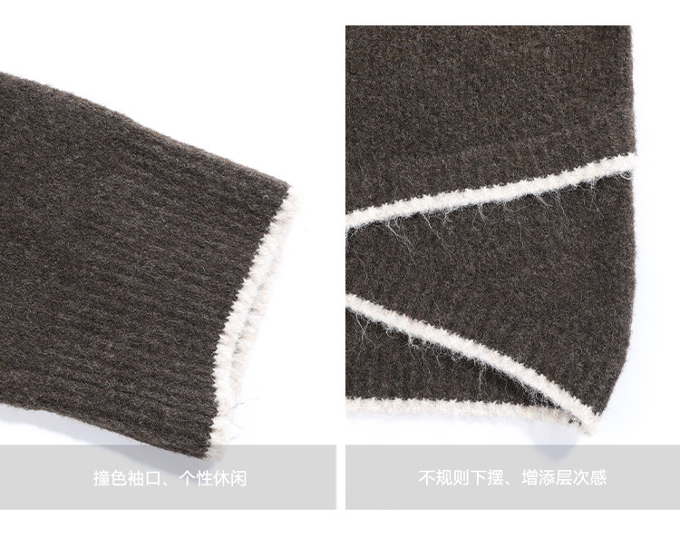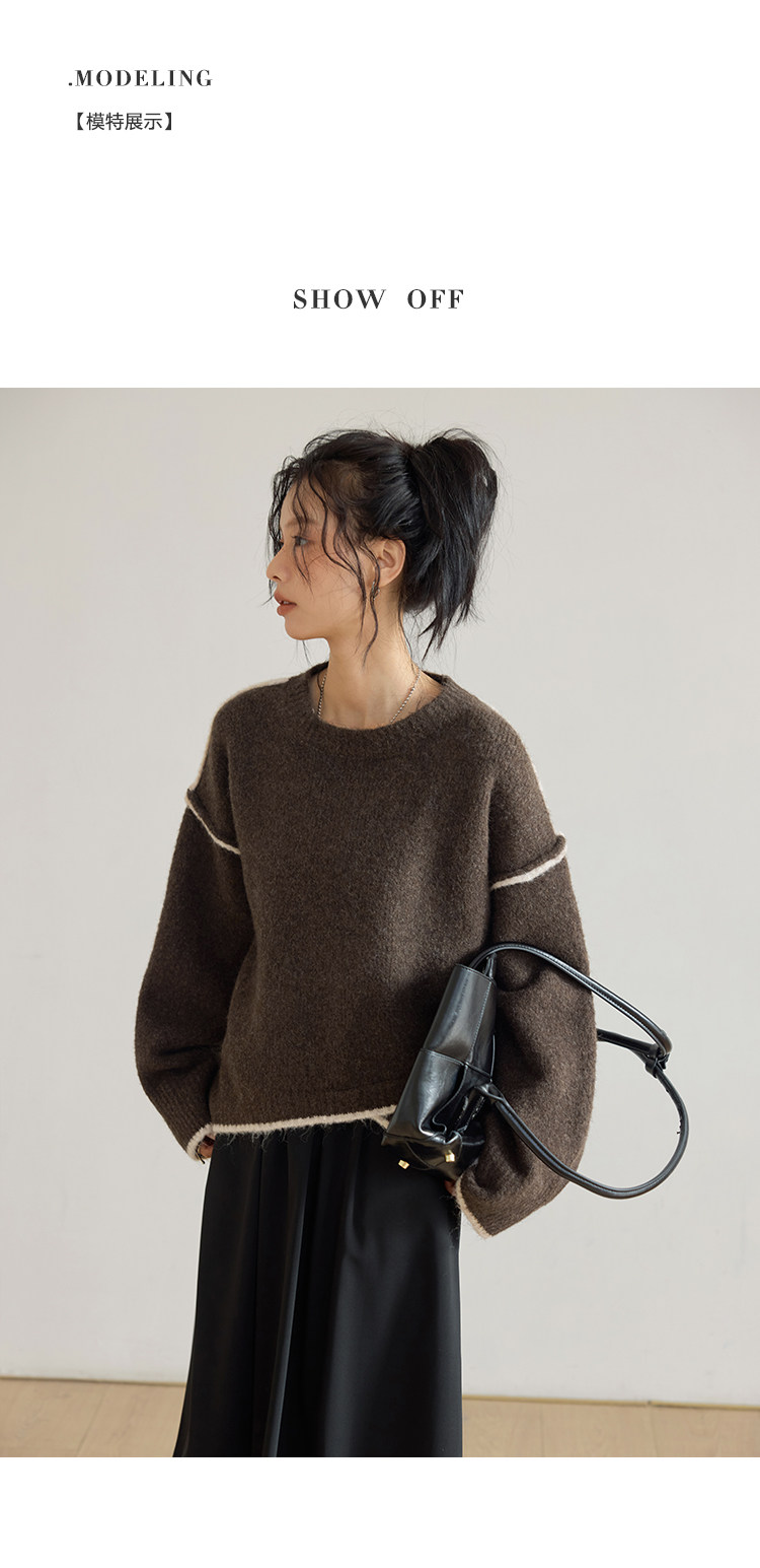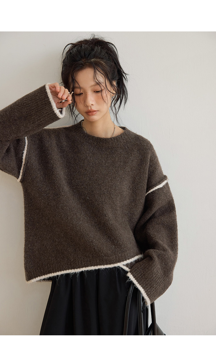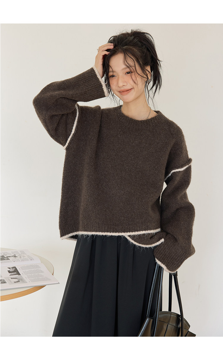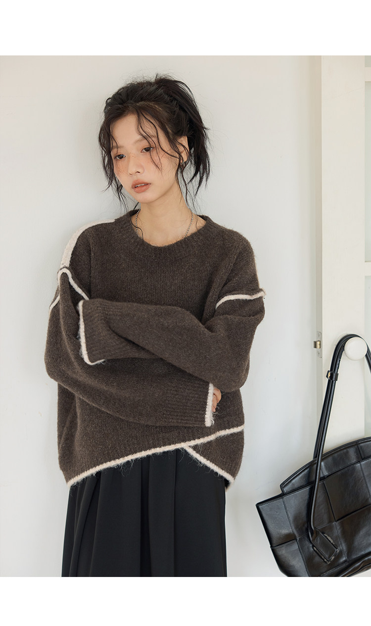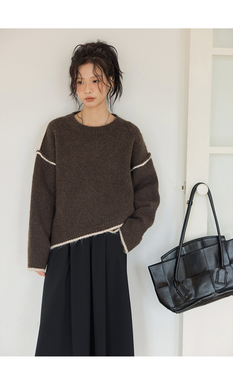咖色圓領毛衣女冬季寬鬆加厚設計感小衆秋冬撞色不規則針織衫上衣