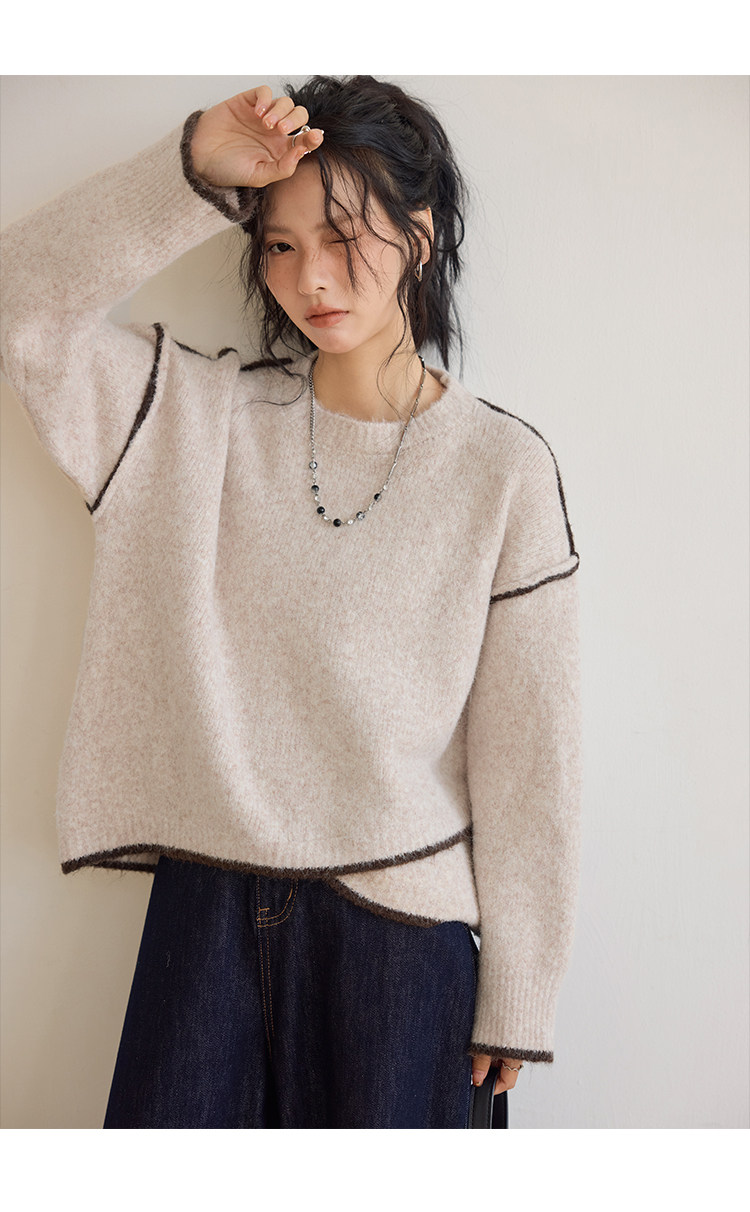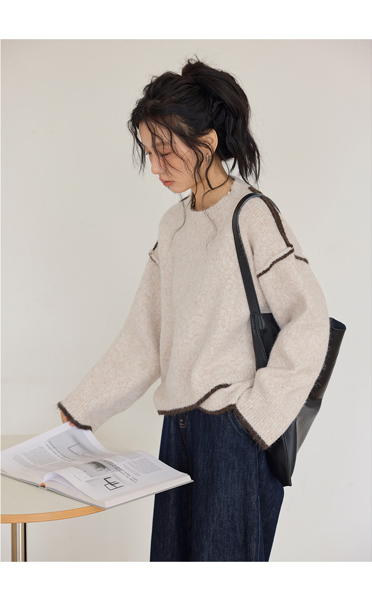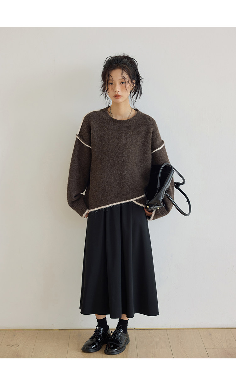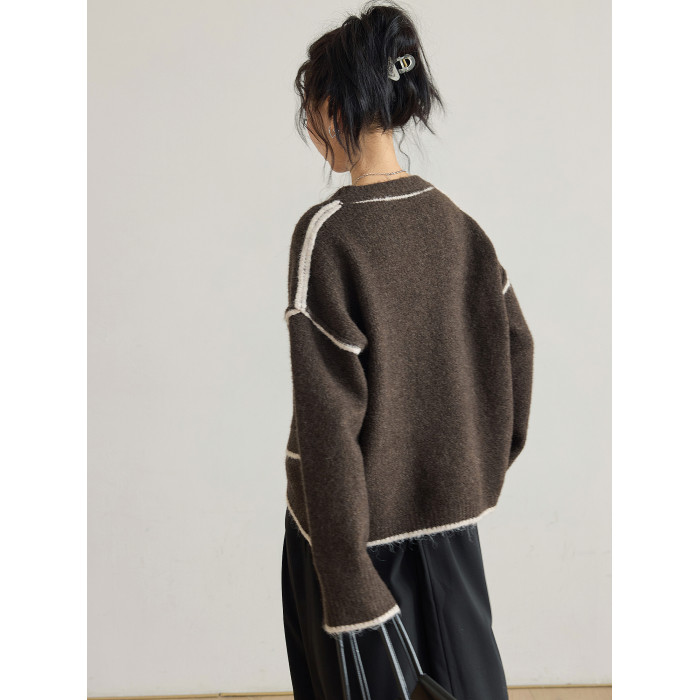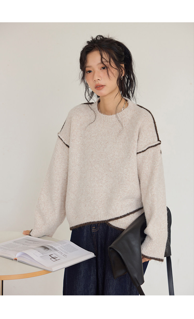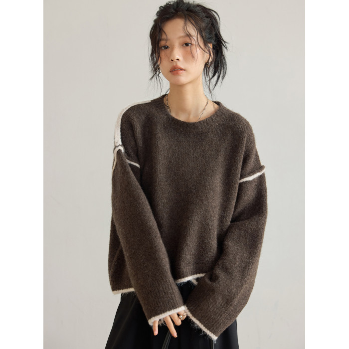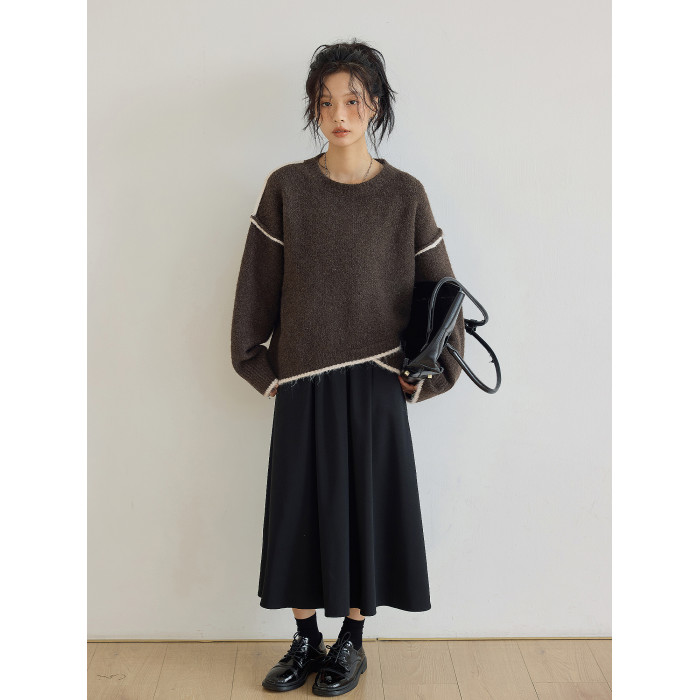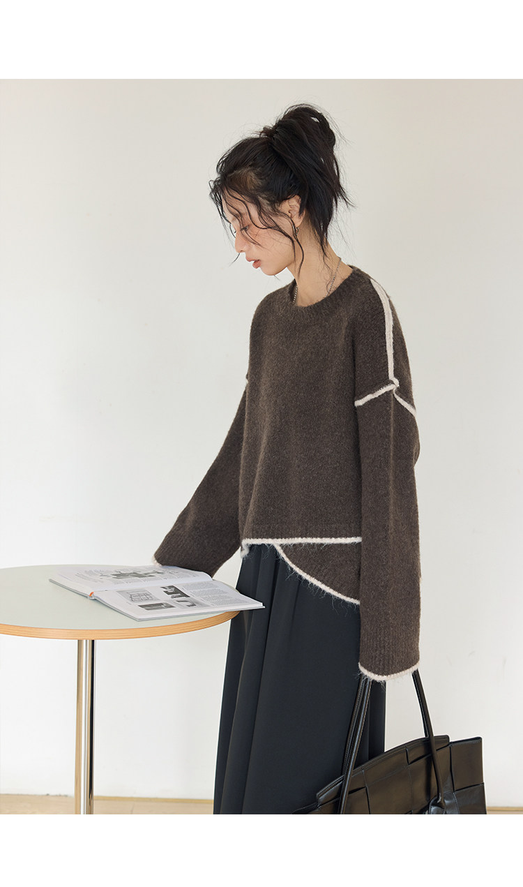 咖色圓領毛衣女冬季寬鬆加厚設計感小衆秋冬撞色不規則針織衫上衣