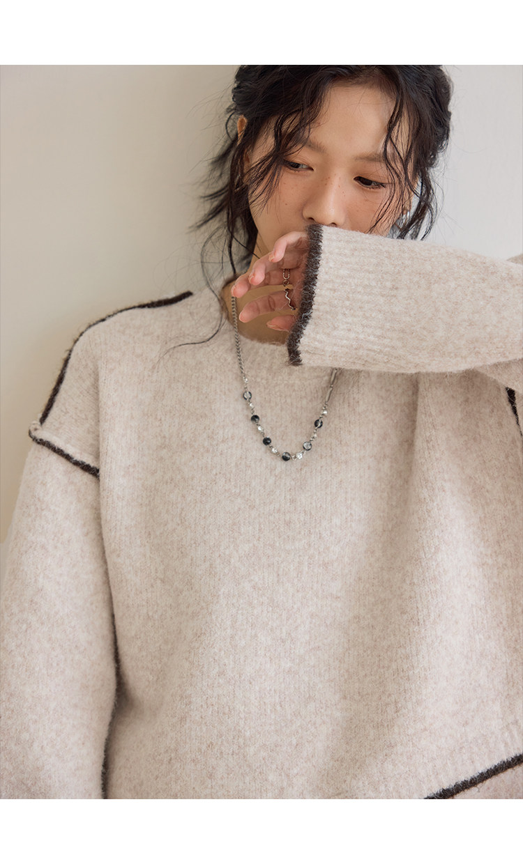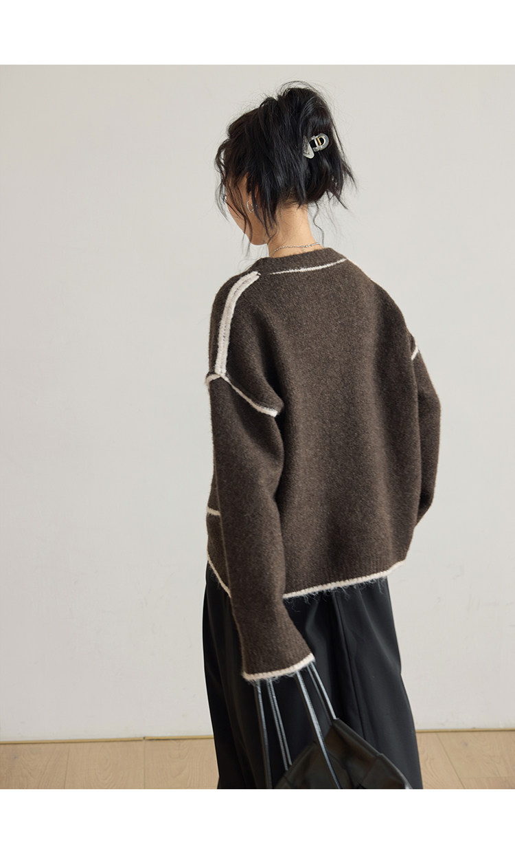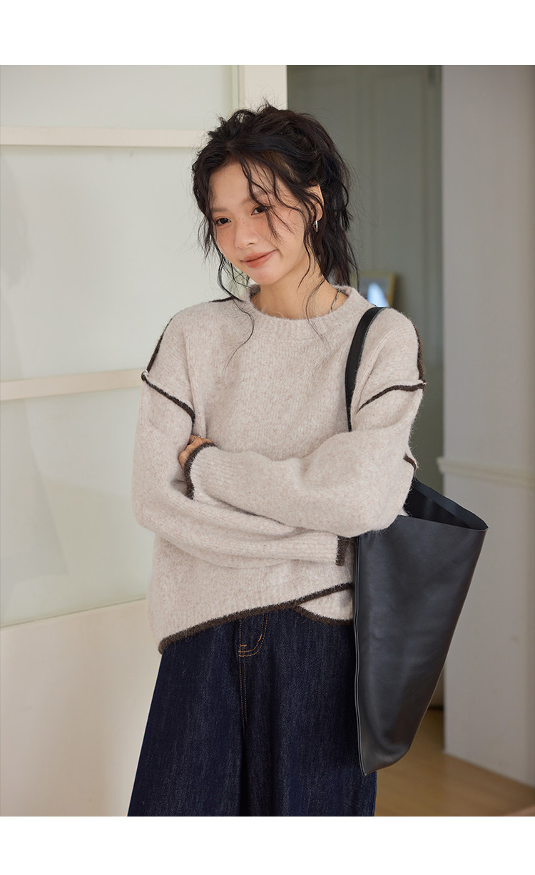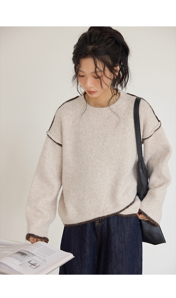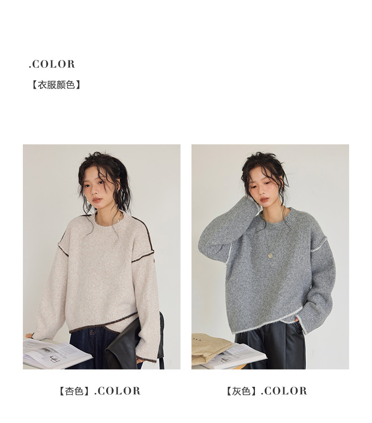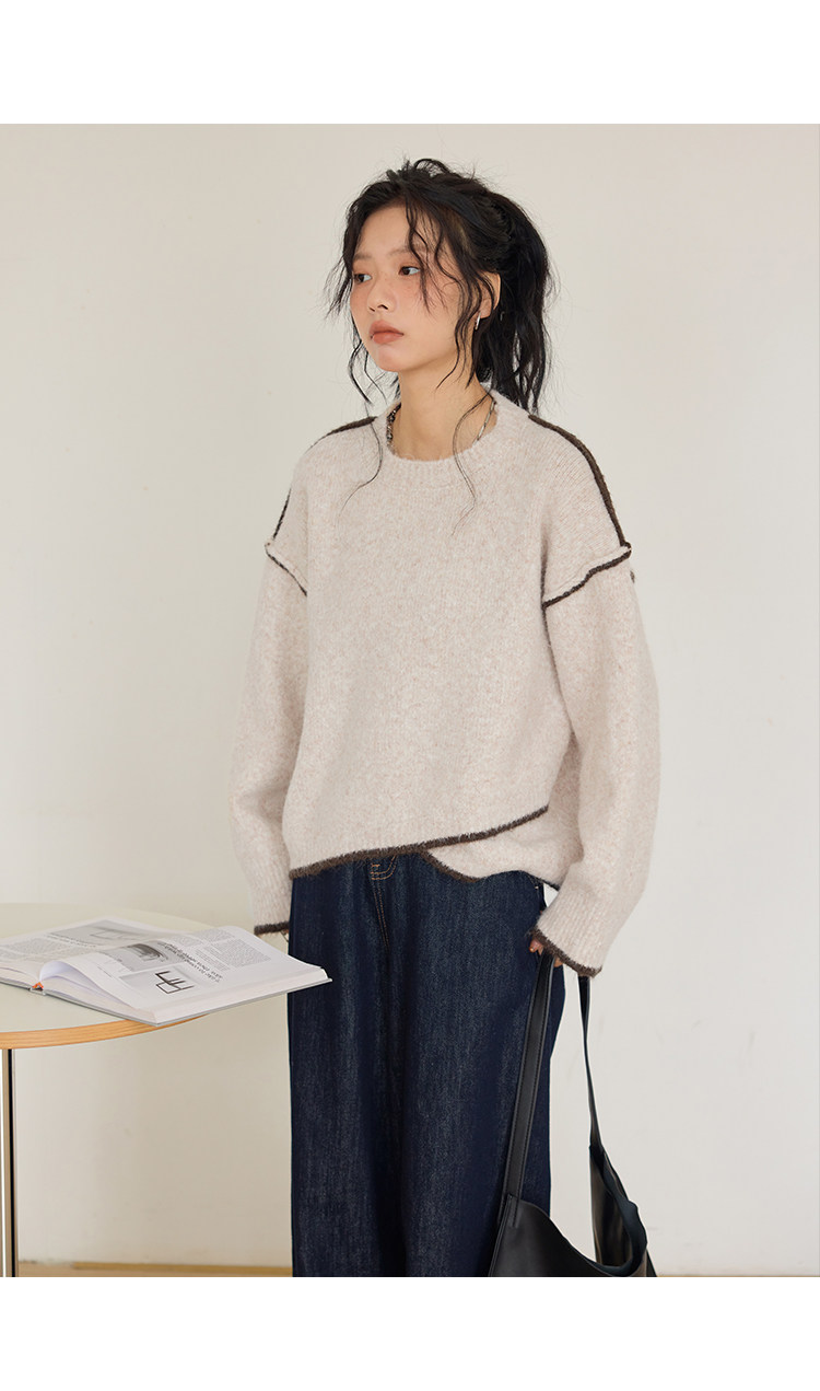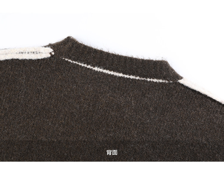 咖色圓領毛衣女冬季寬鬆加厚設計感小衆秋冬撞色不規則針織衫上衣