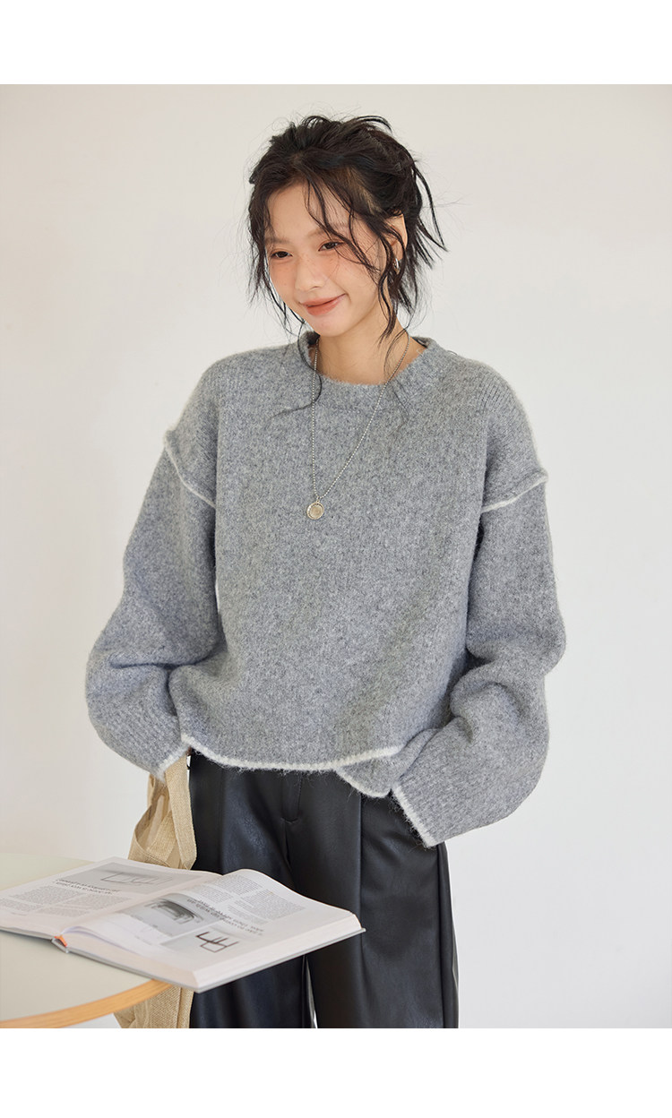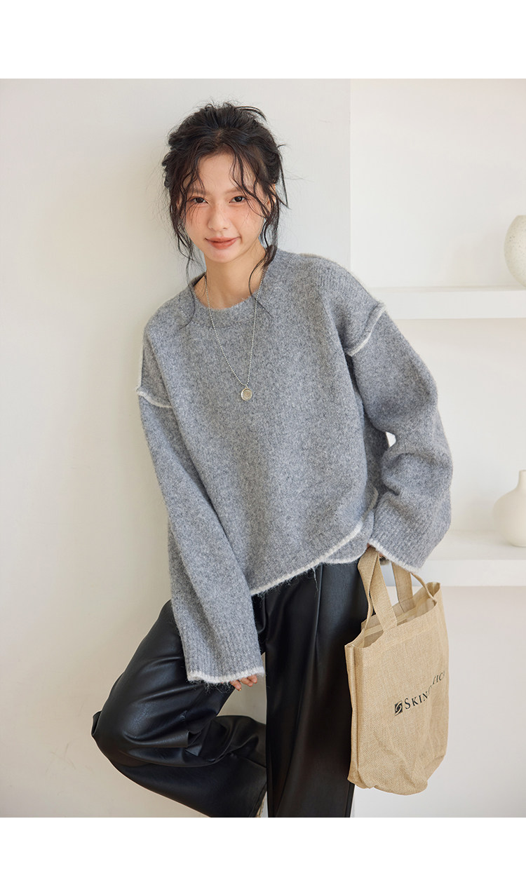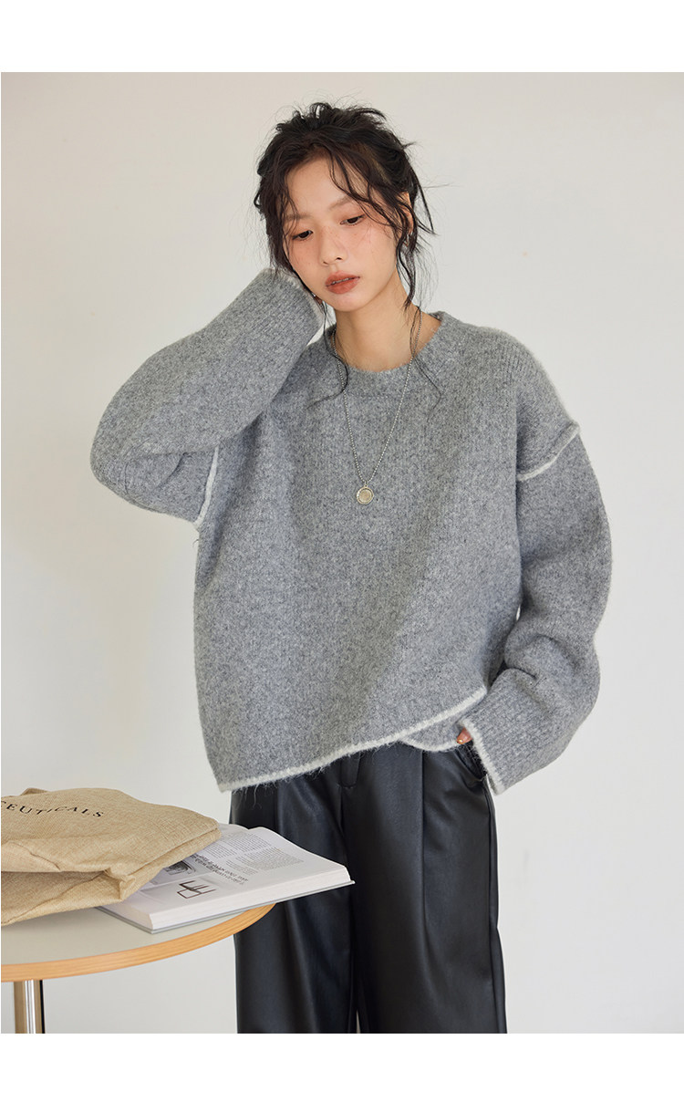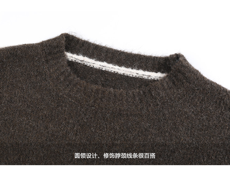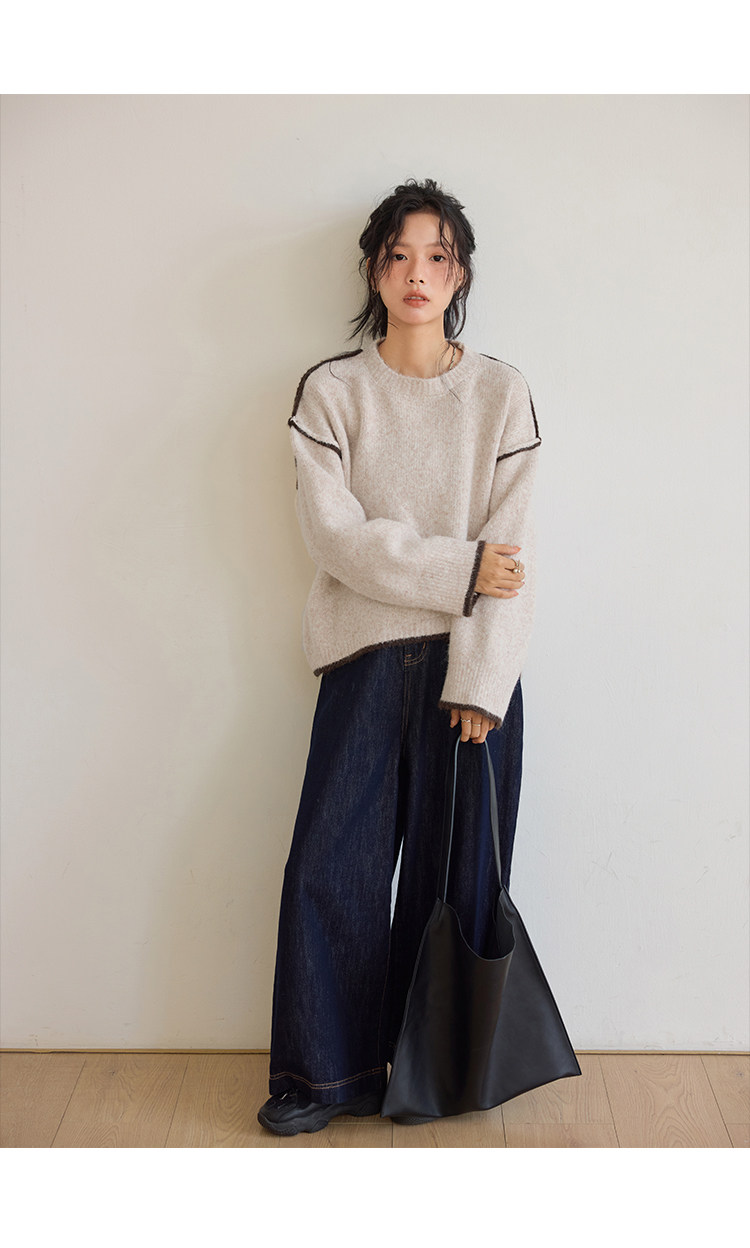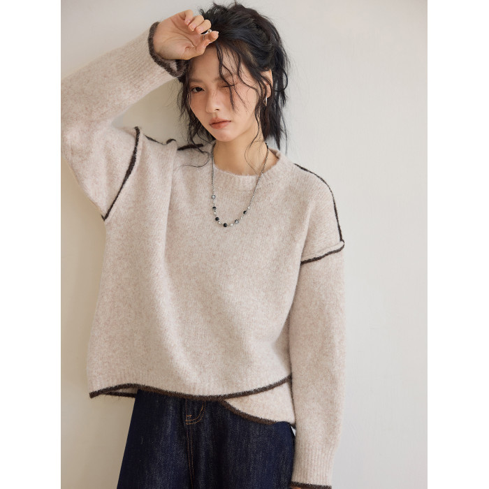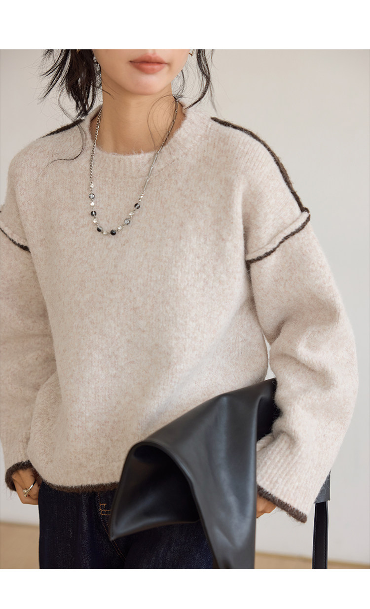 咖色圓領毛衣女冬季寬鬆加厚設計感小衆秋冬撞色不規則針織衫上衣