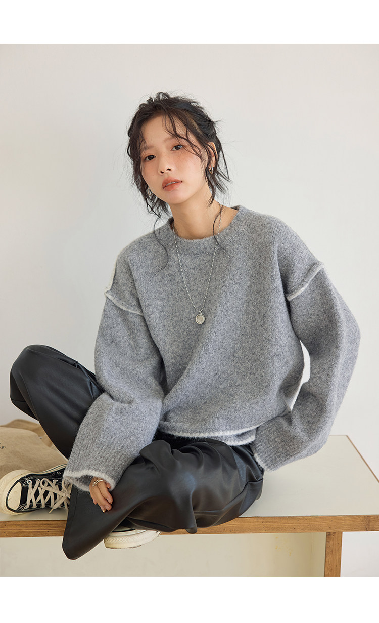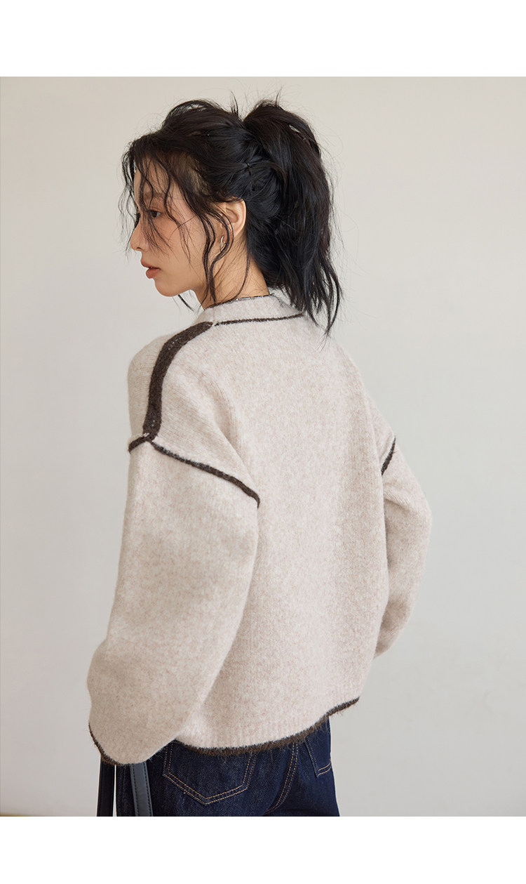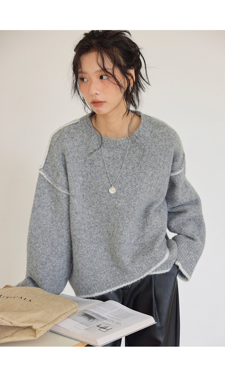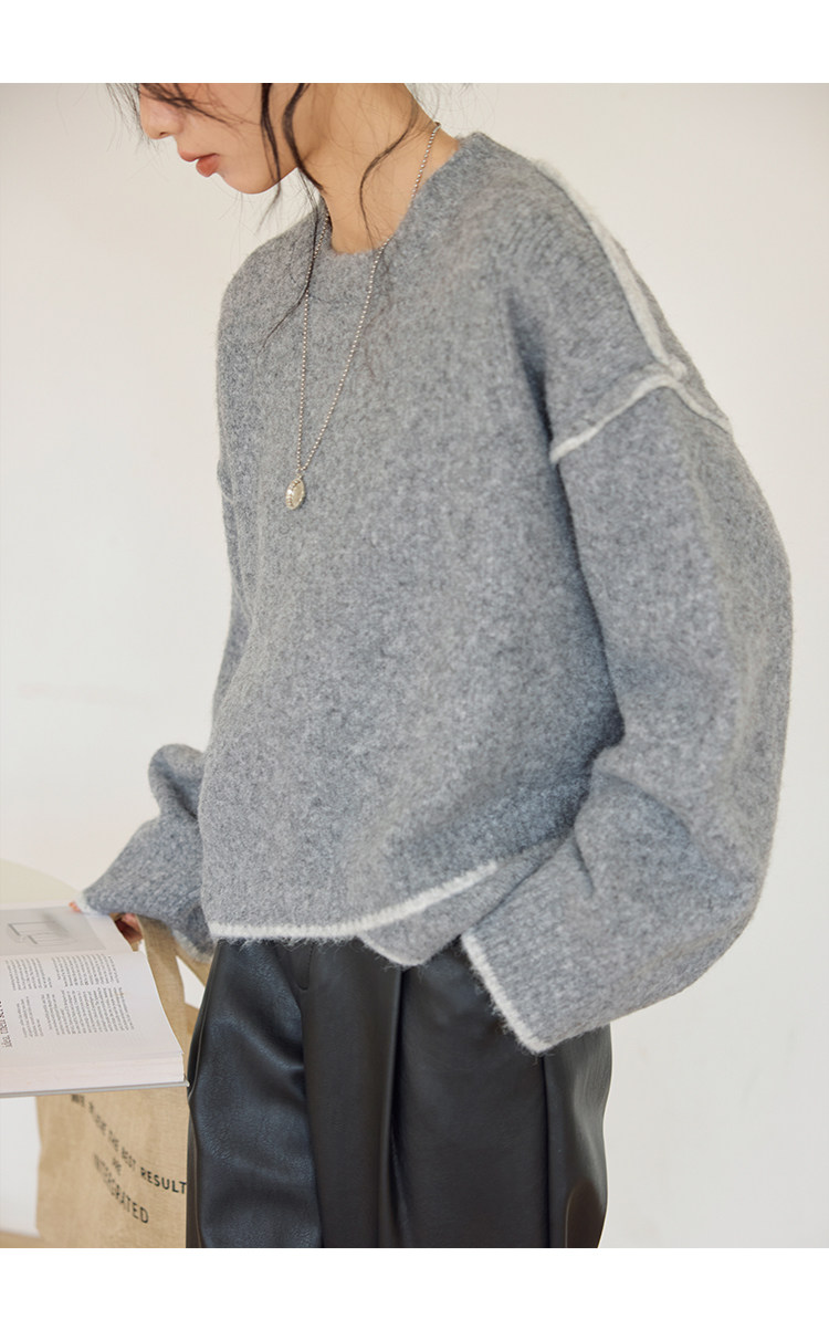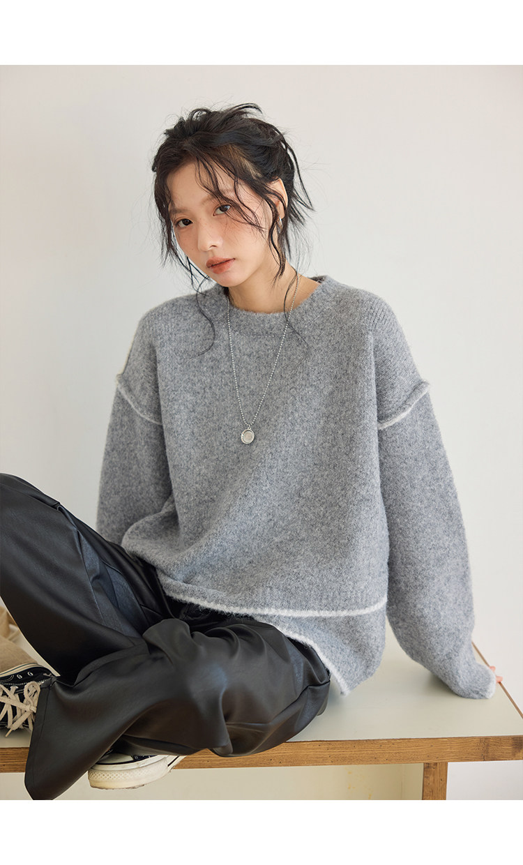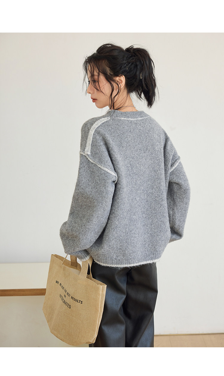 咖色圓領毛衣女冬季寬鬆加厚設計感小衆秋冬撞色不規則針織衫上衣