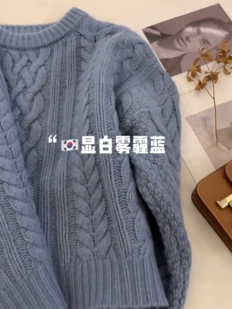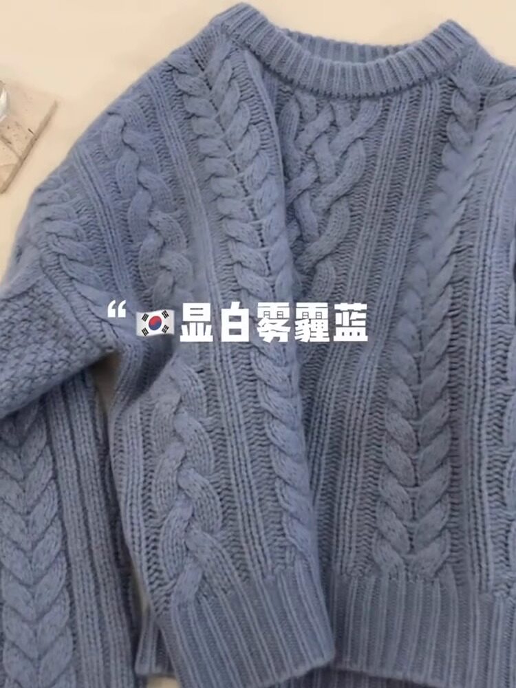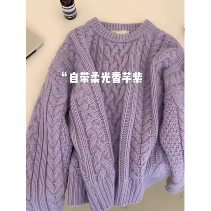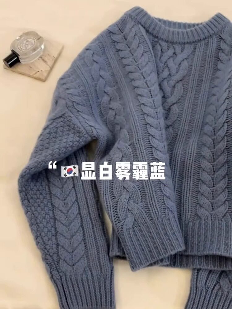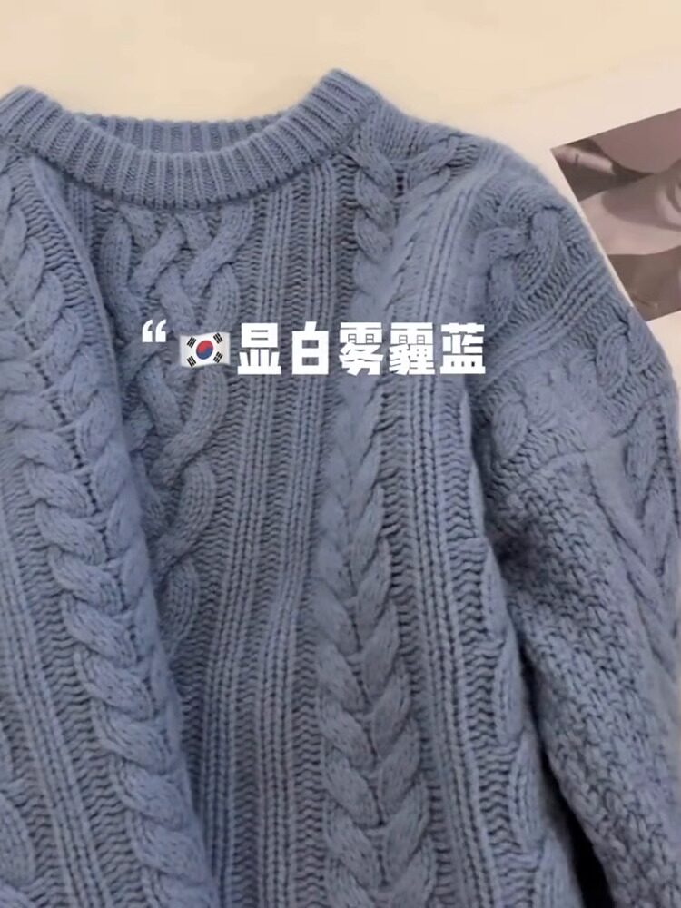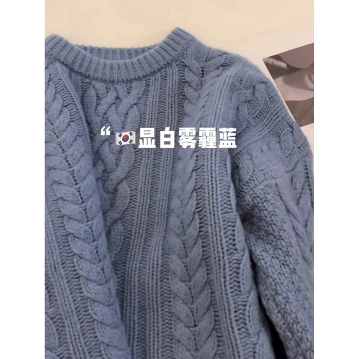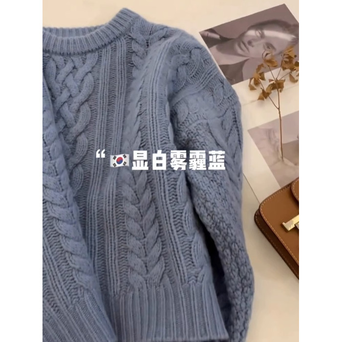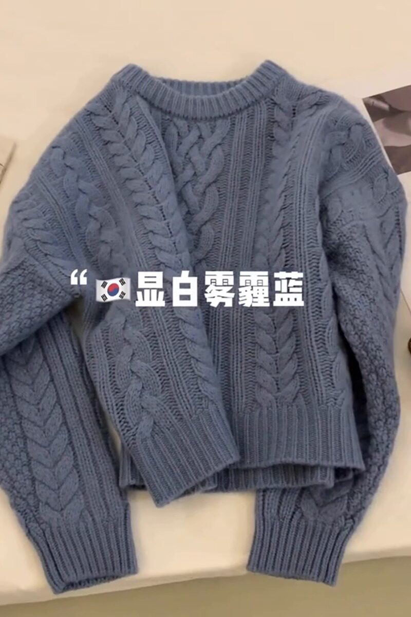 藍色浣熊絨套頭針織衫女秋冬季加厚外穿高級感慵懶風粗針麻花毛衣