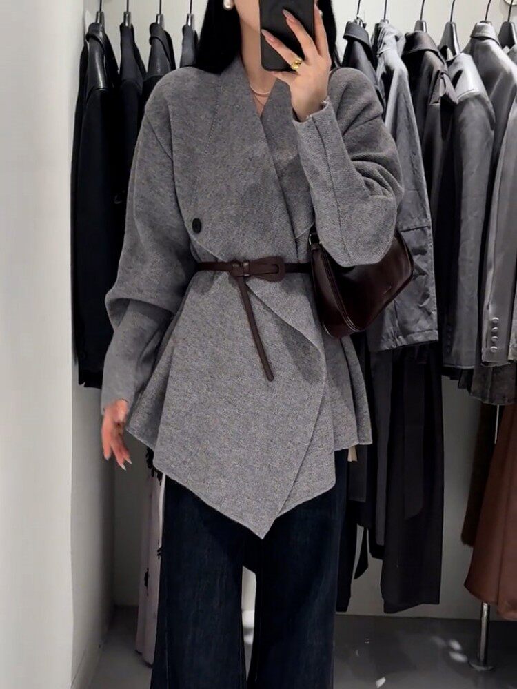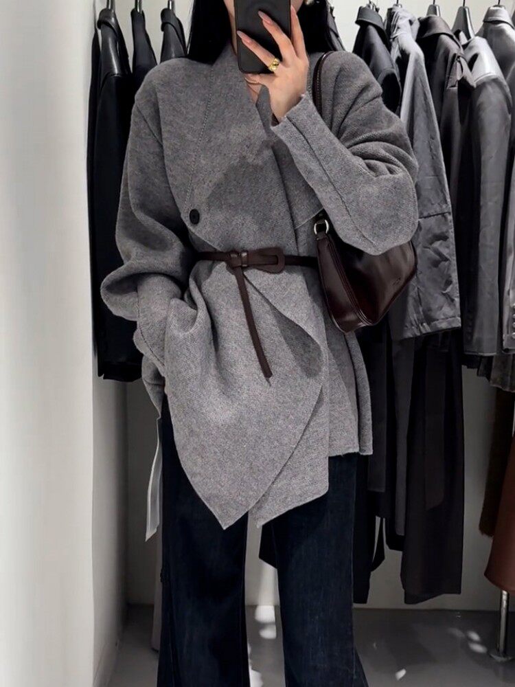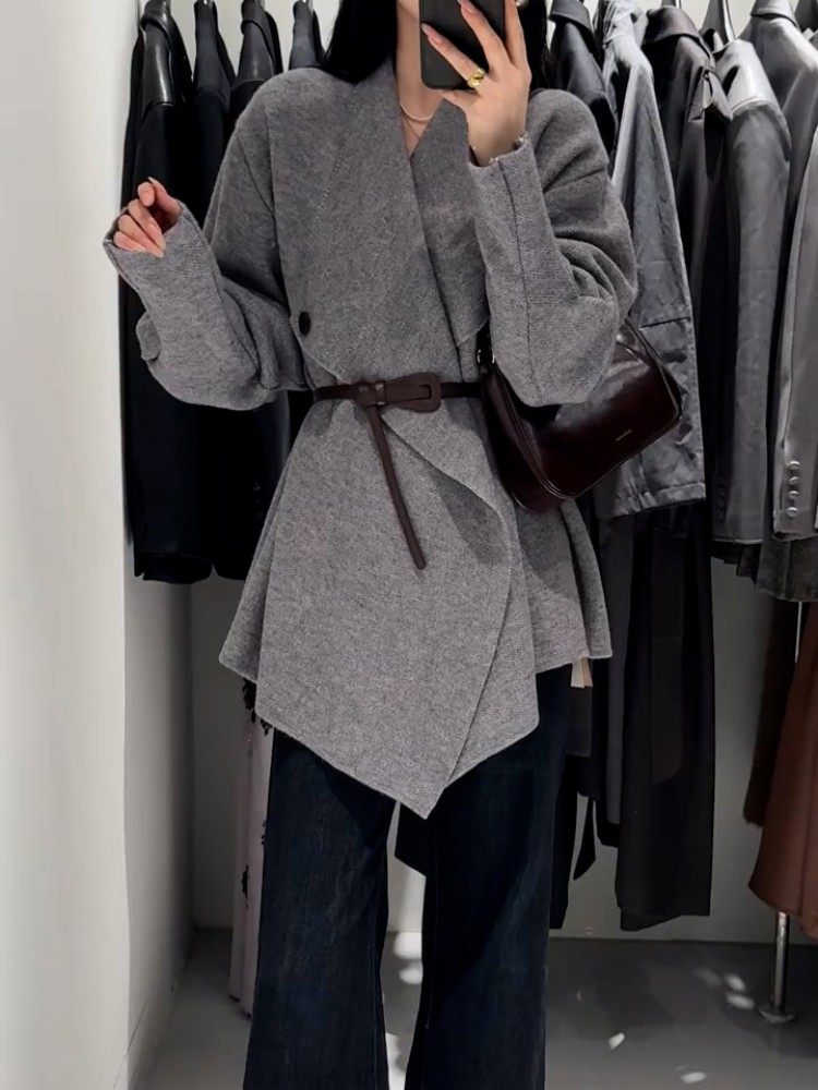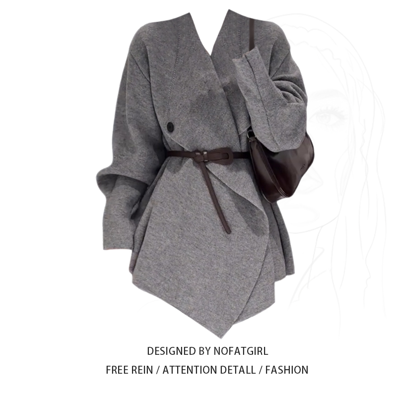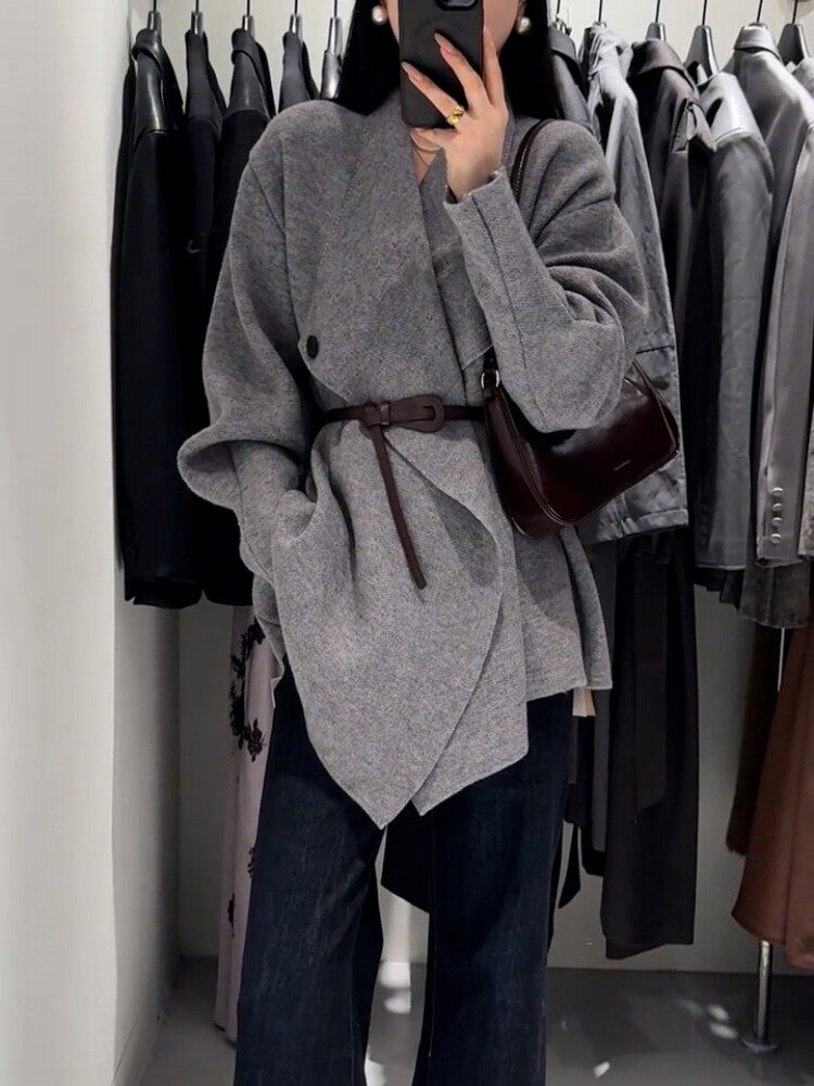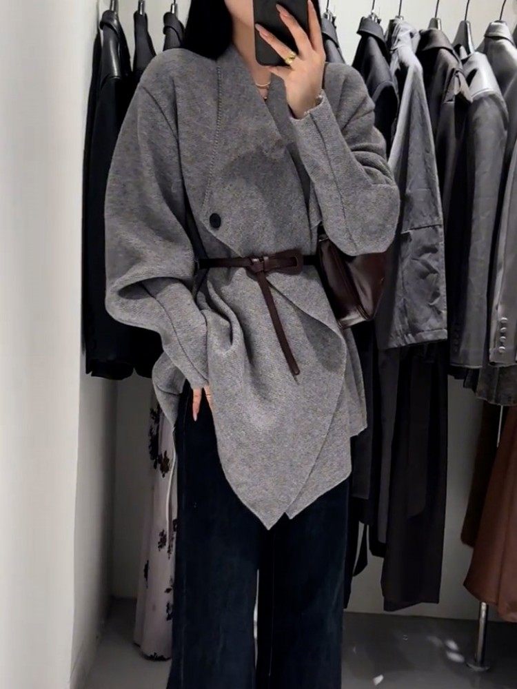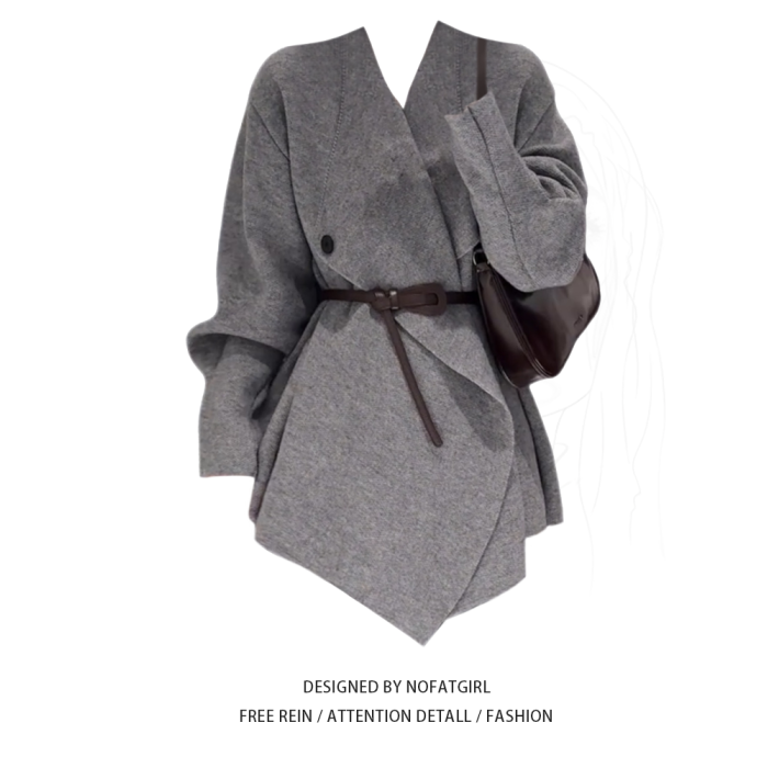 大碼胖妹妹設計感系綁翻領針織開衫女秋冬寬松收腰顯瘦高級感毛衣