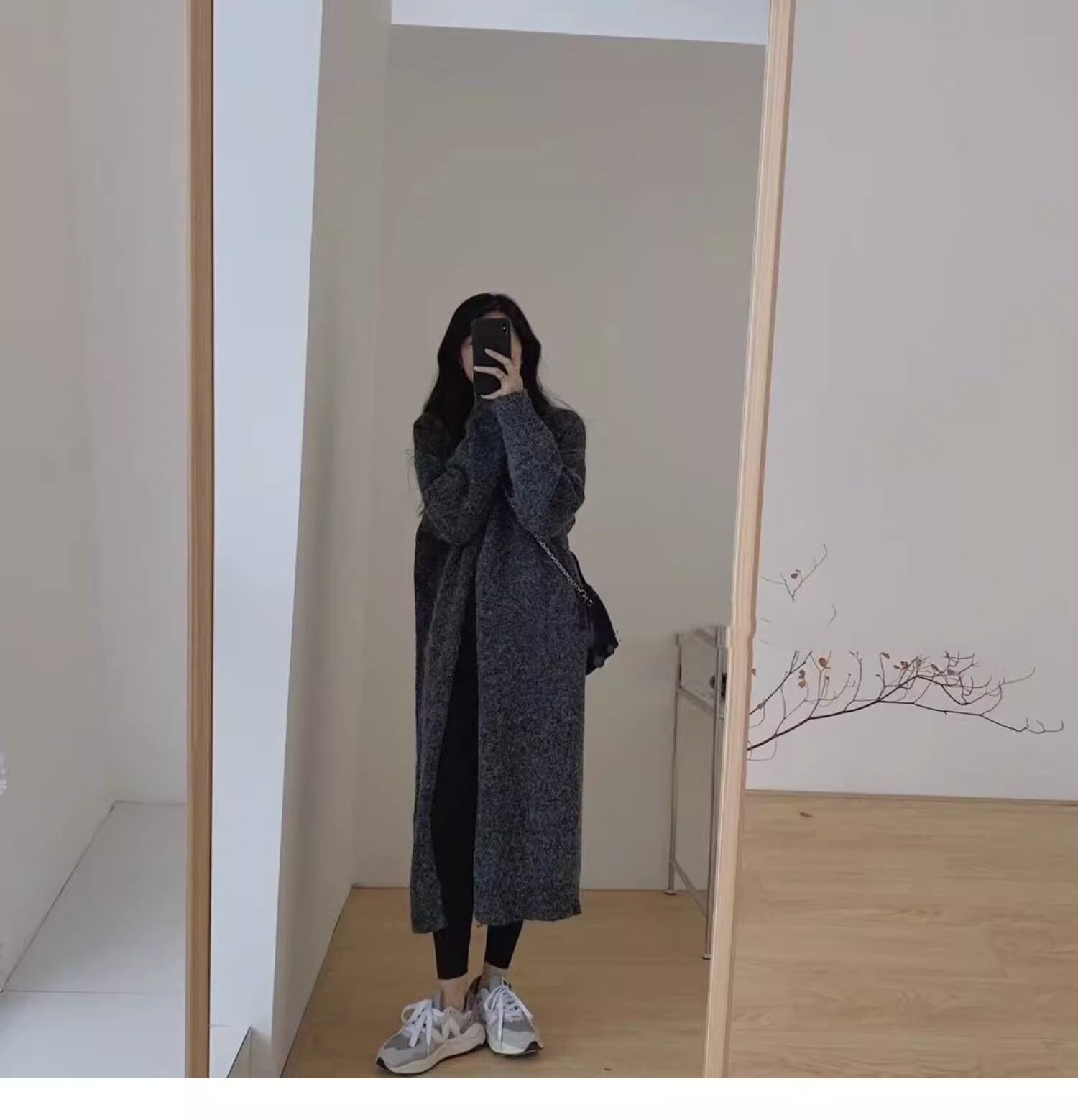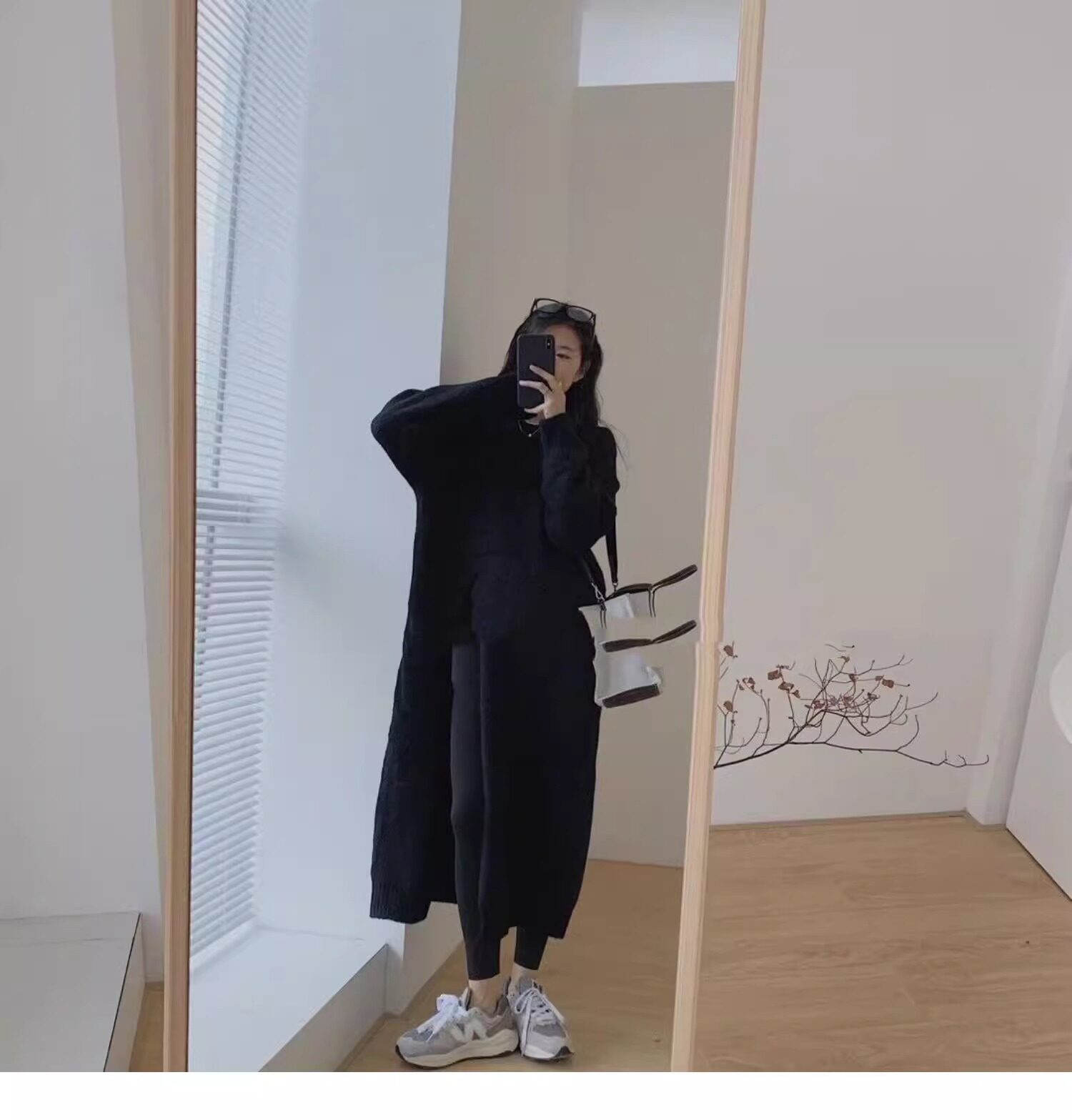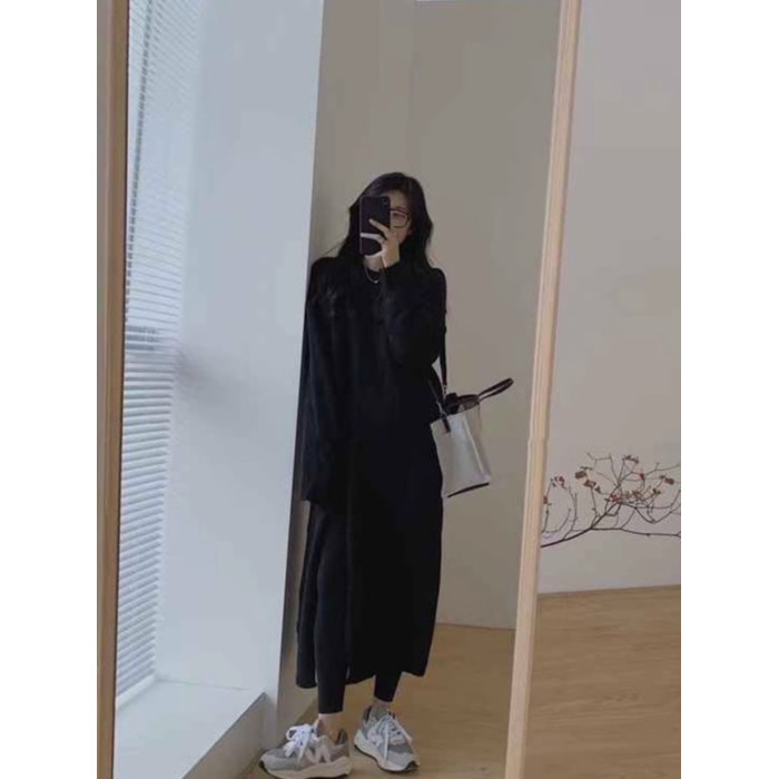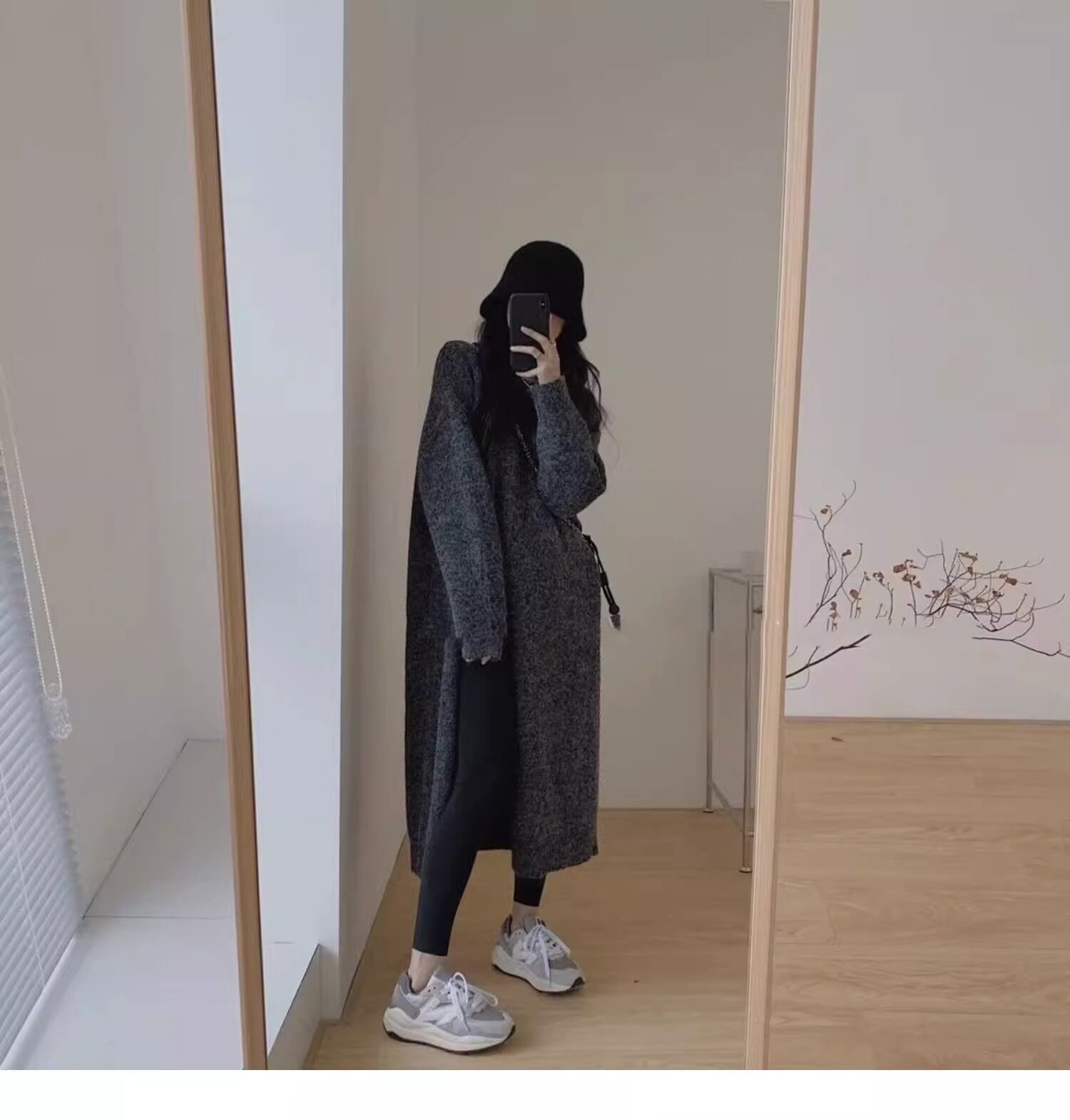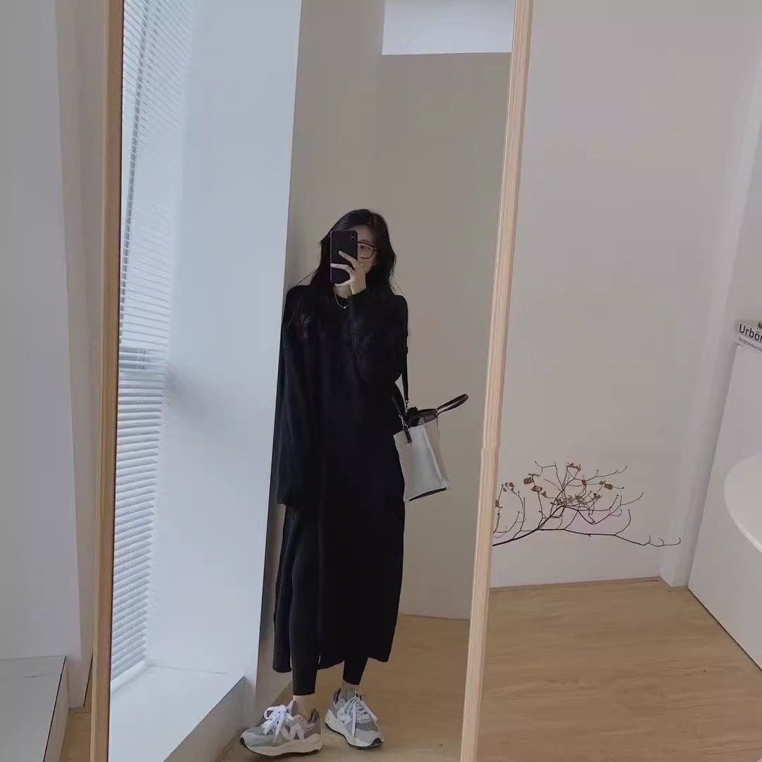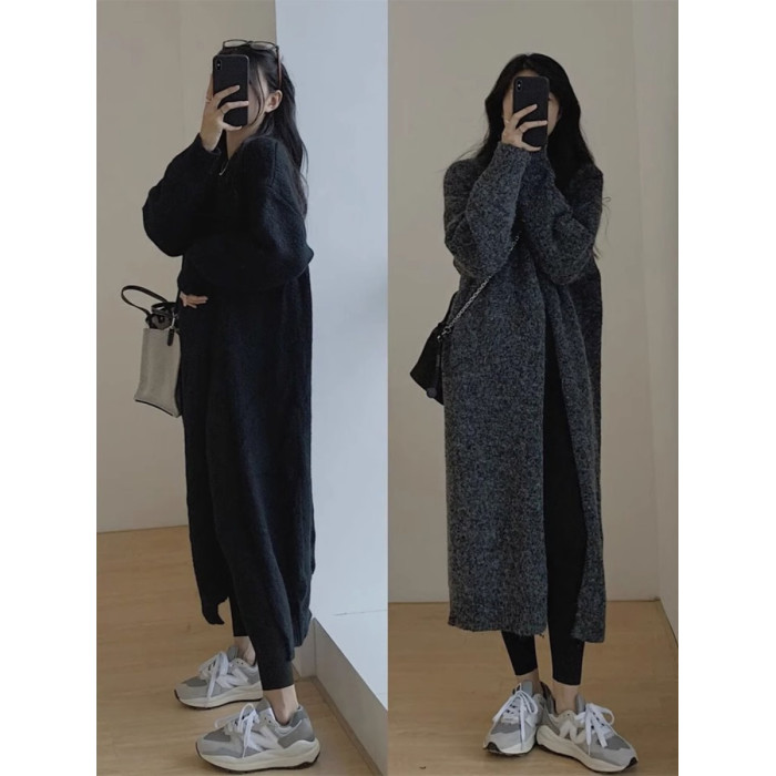 慵懶風寬松裙子開叉復古日系針織衫連衣裙套頭中長款毛衣女秋冬季