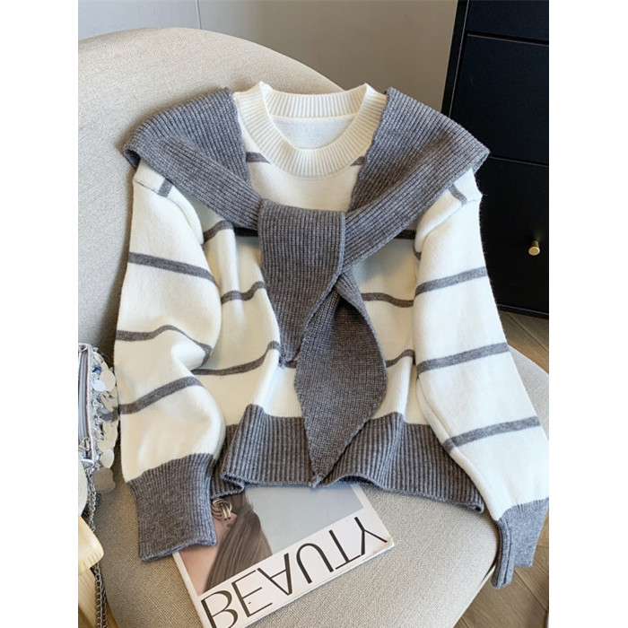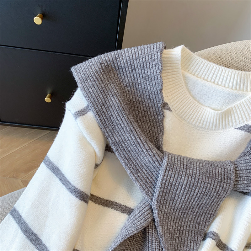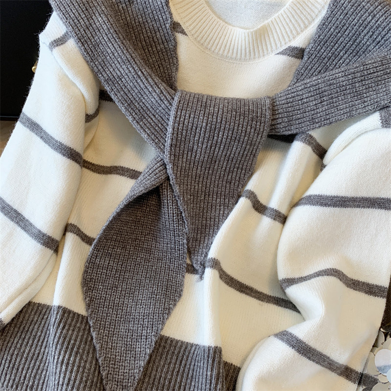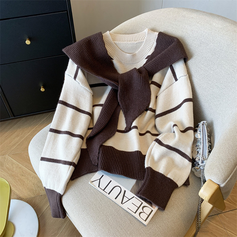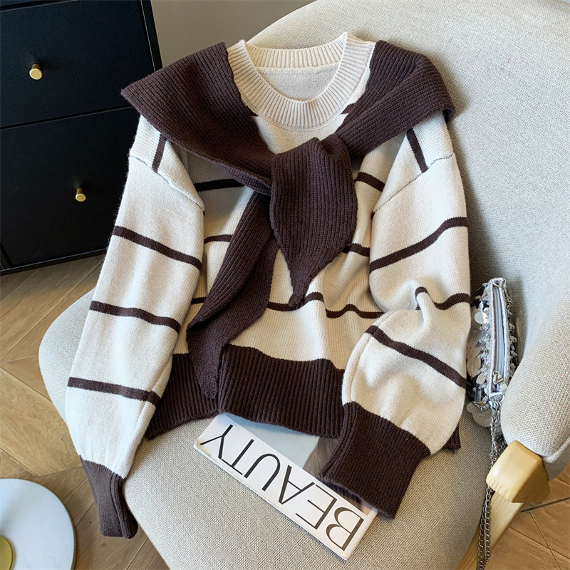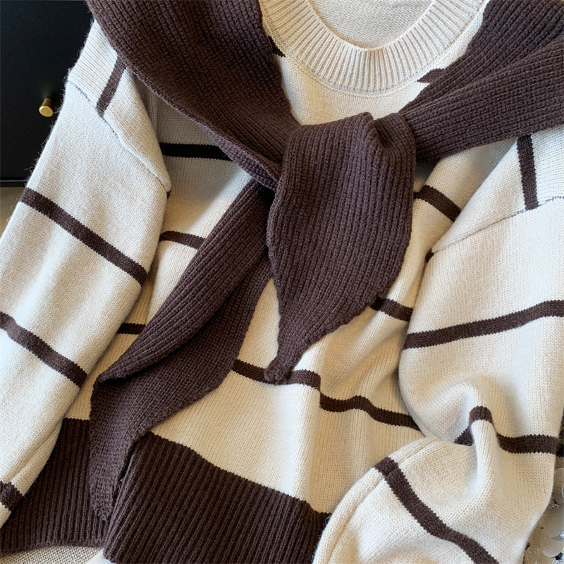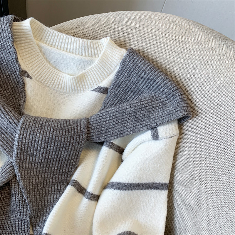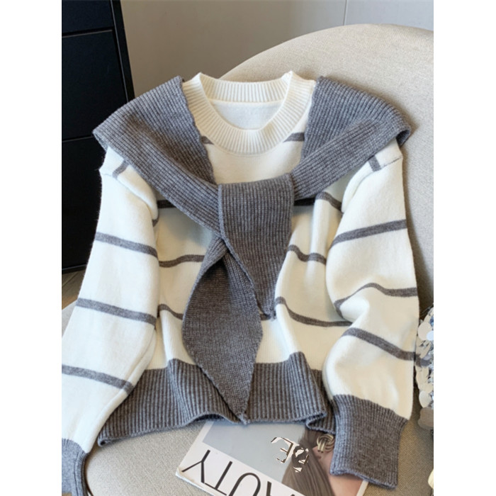 專櫃撤迴大牌剪標女裝條紋毛衣兩件套女秋冬學院風披肩針織衫上衣