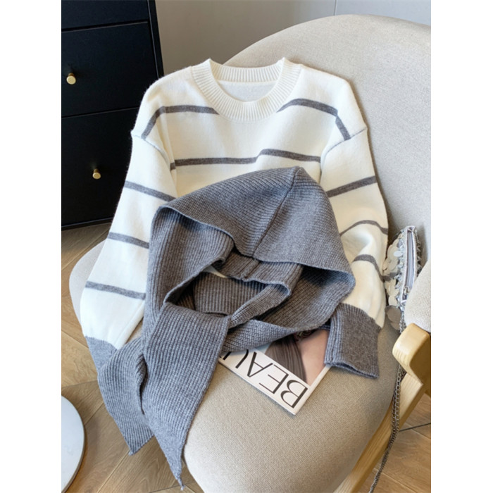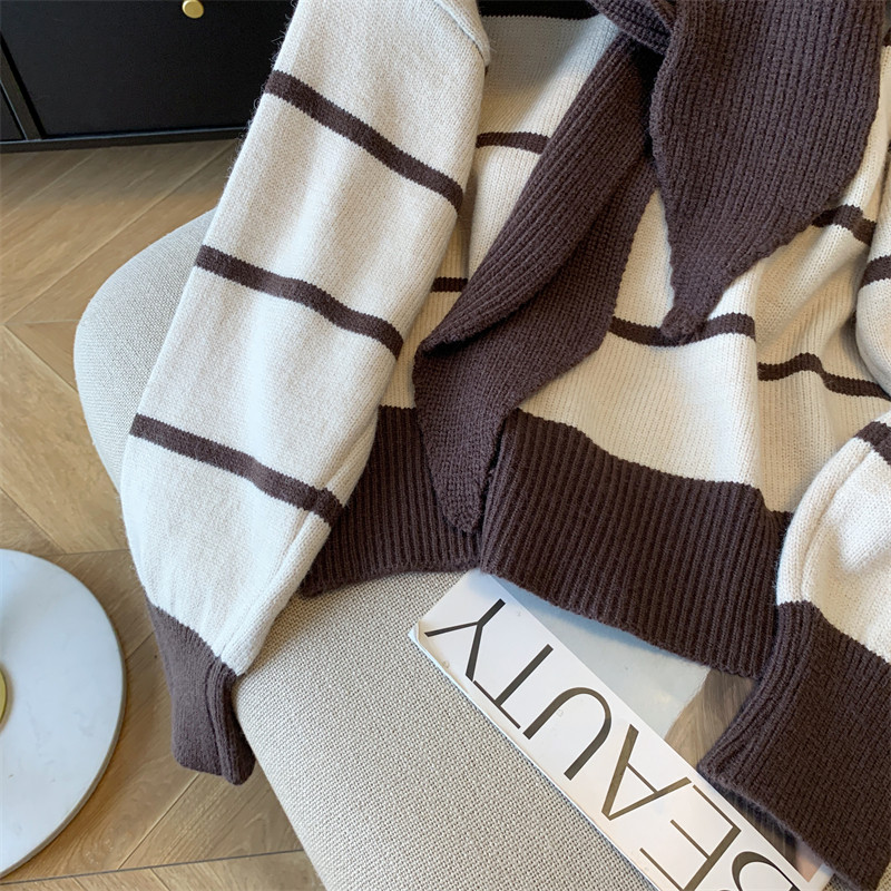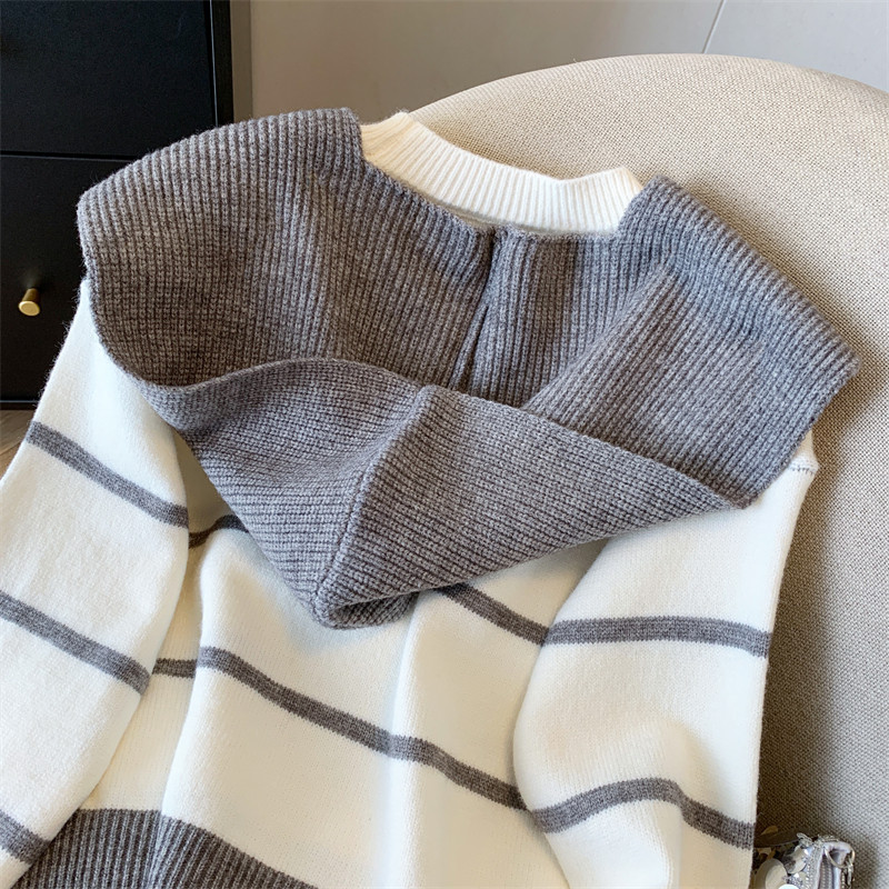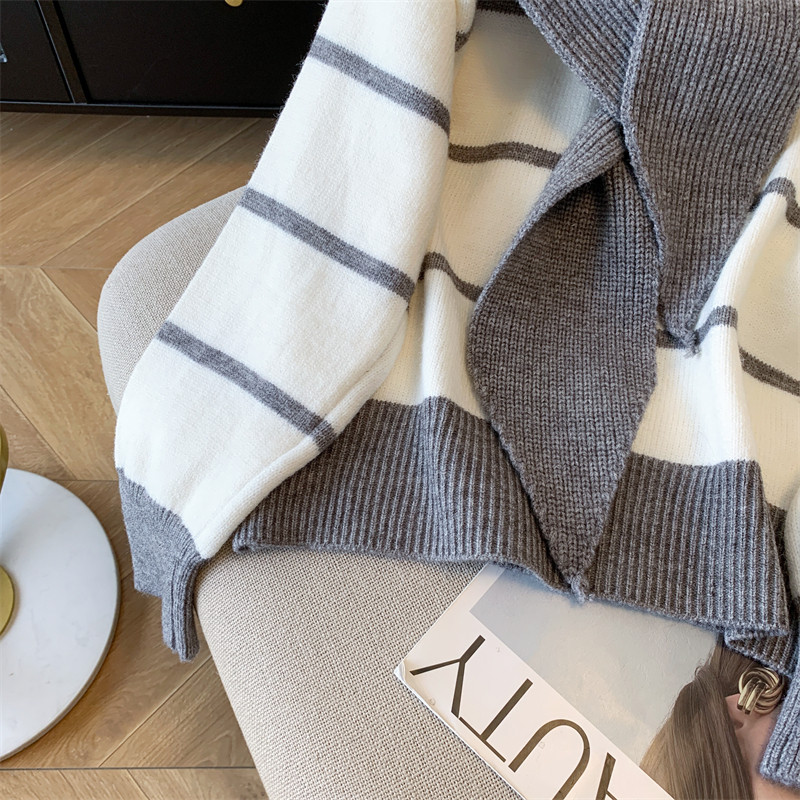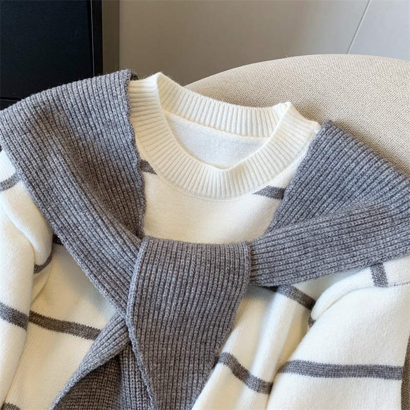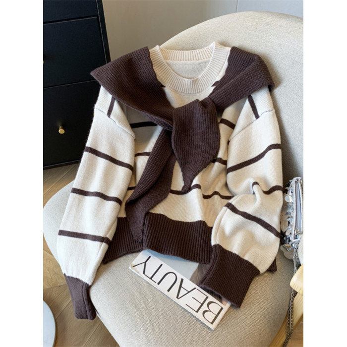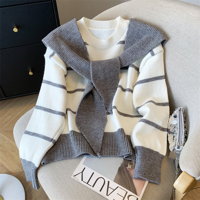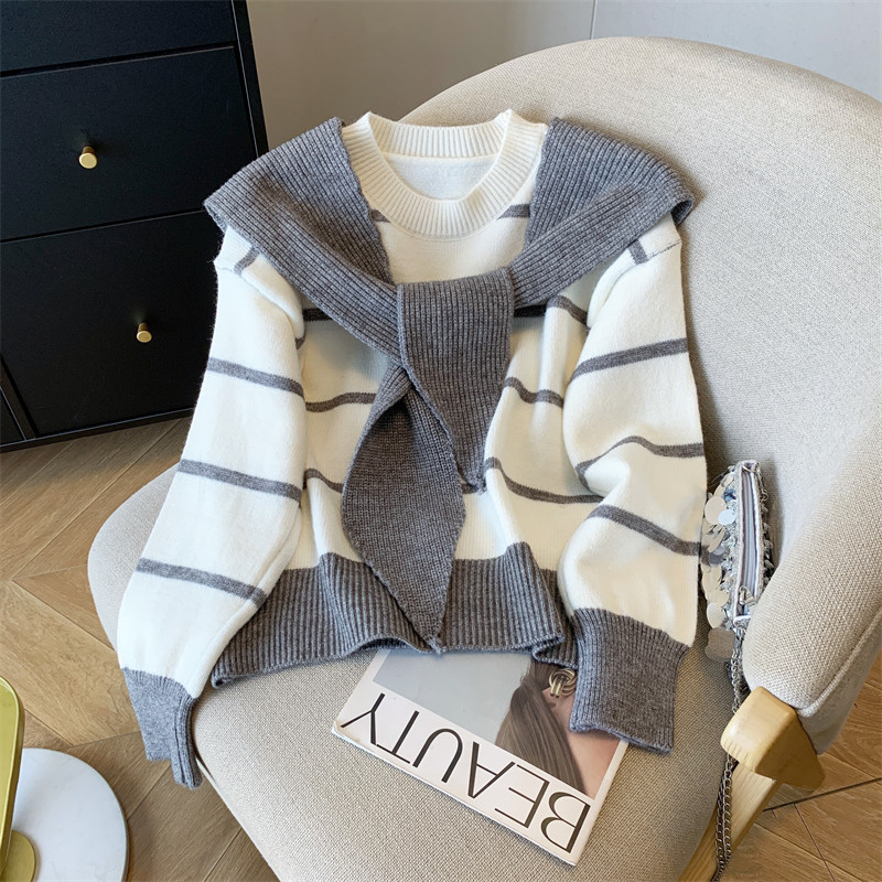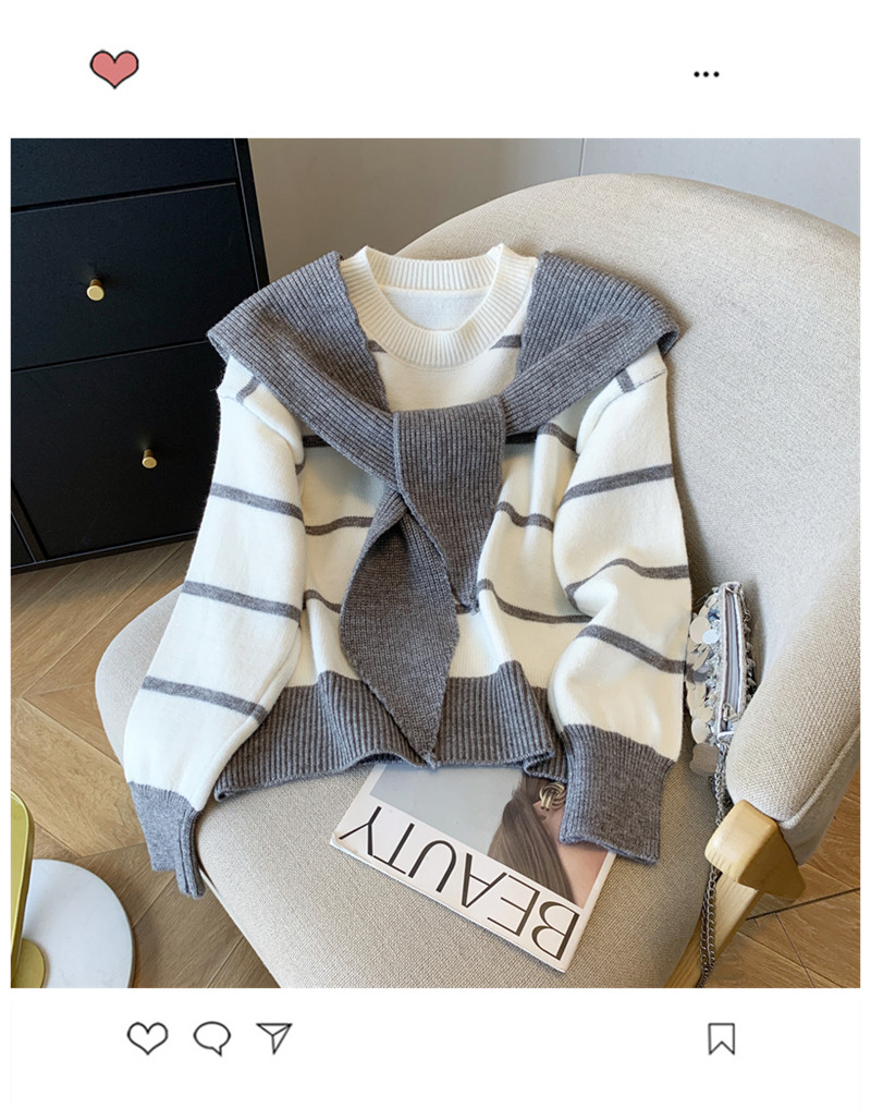 專櫃撤迴大牌剪標女裝條紋毛衣兩件套女秋冬學院風披肩針織衫上衣