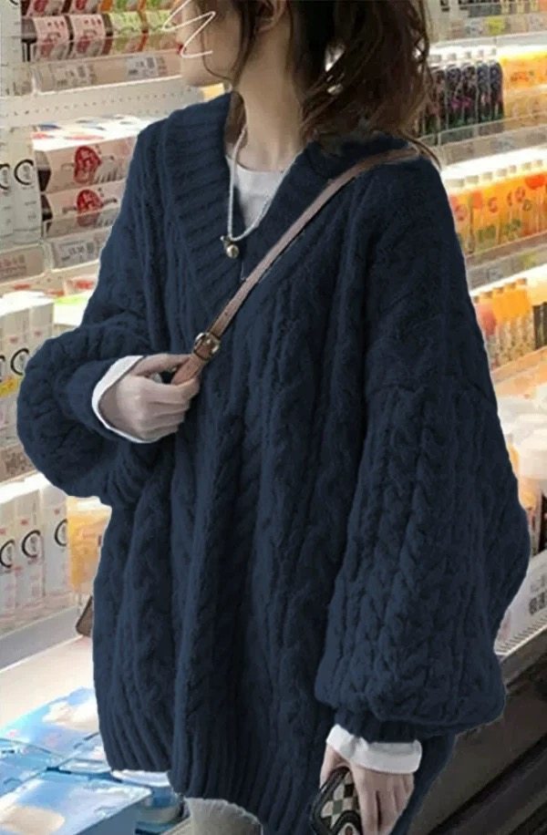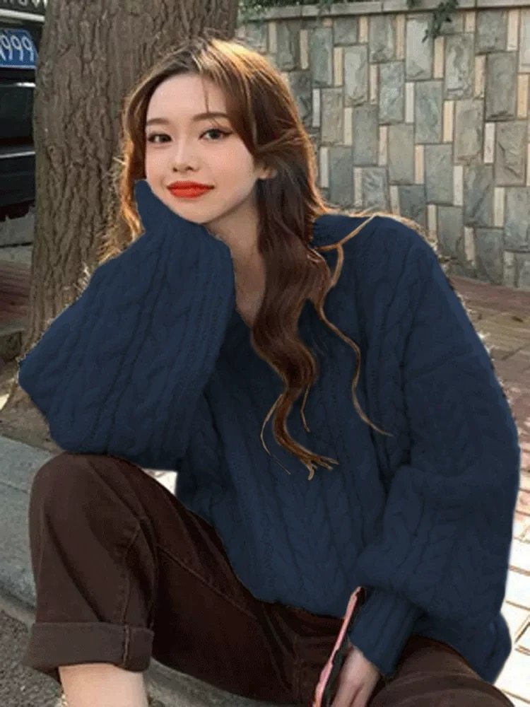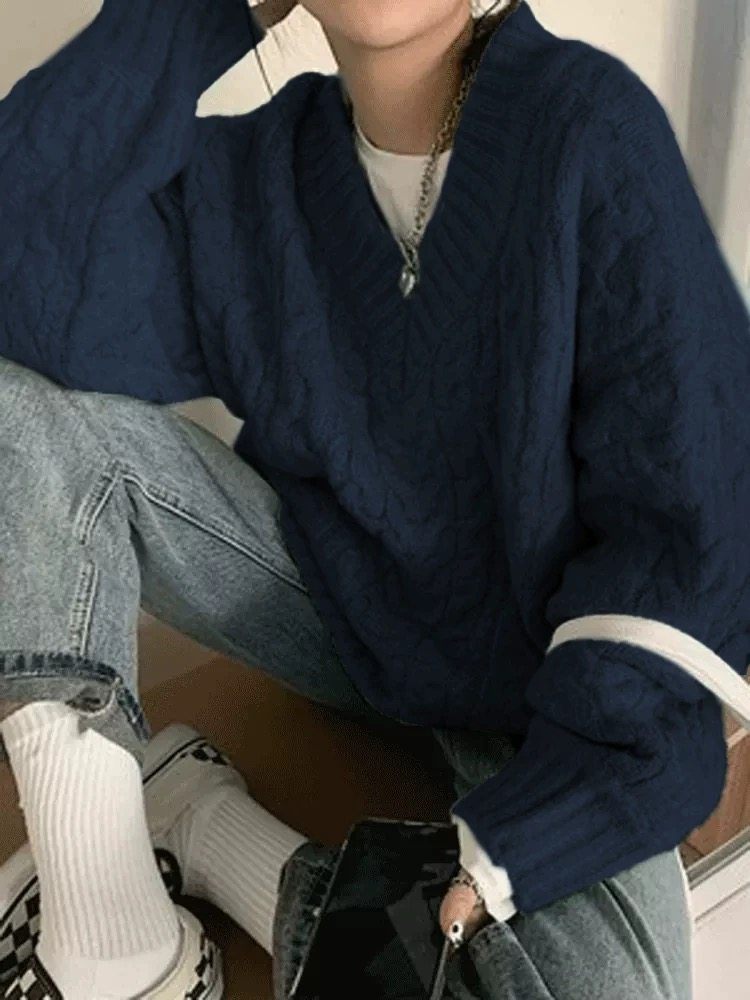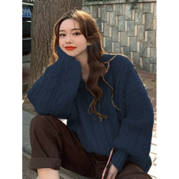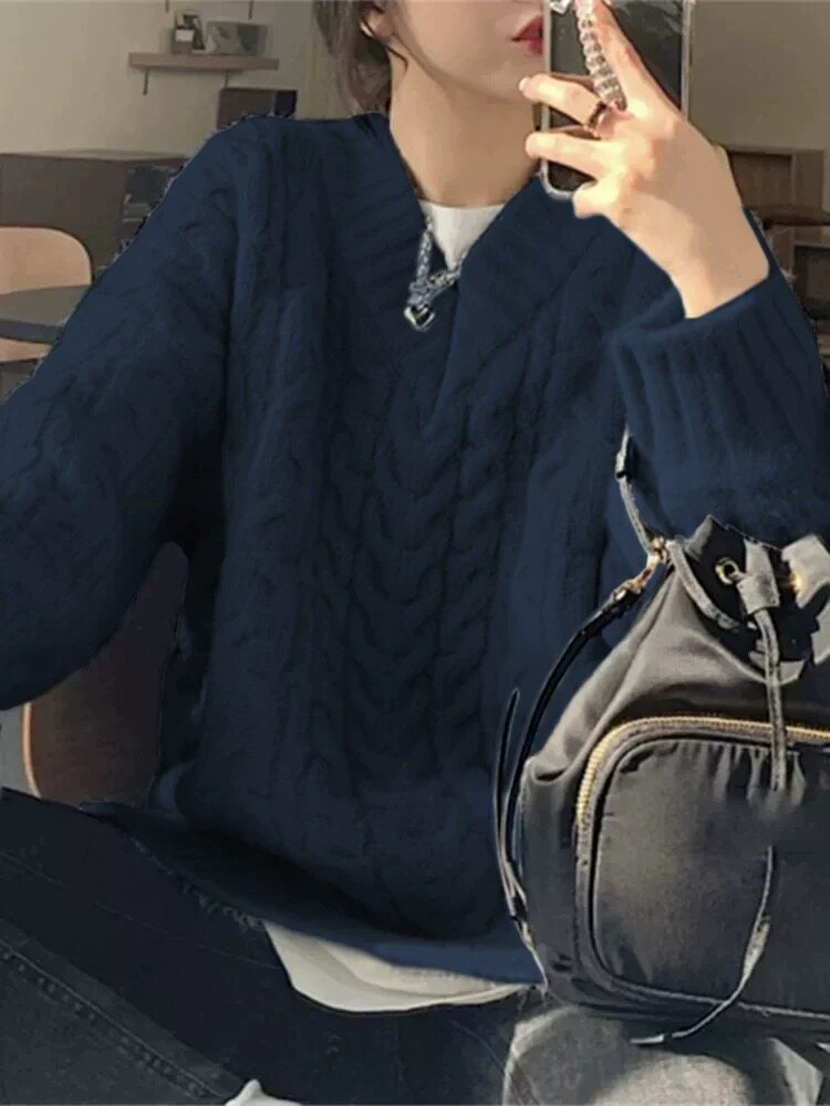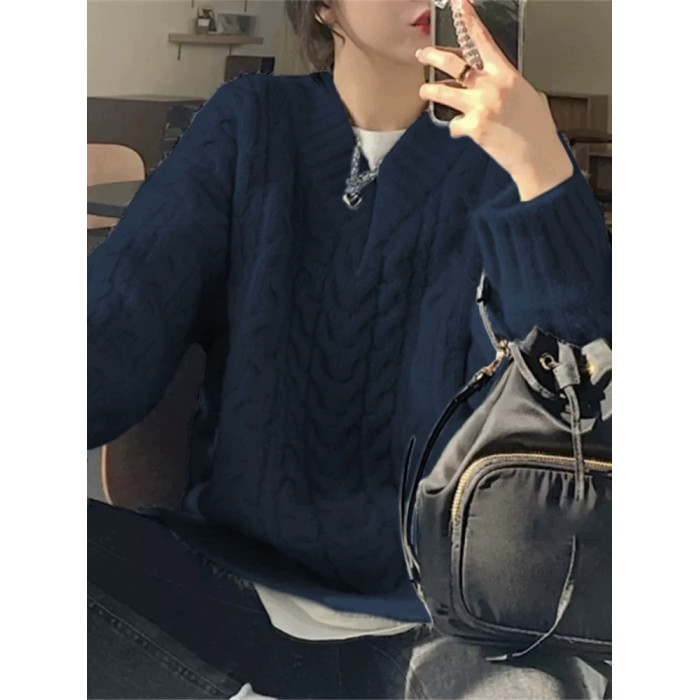 大碼胖MM藏藍色v領麻花毛衣女秋冬2025新款小衆軟糯慵懶針織上衣