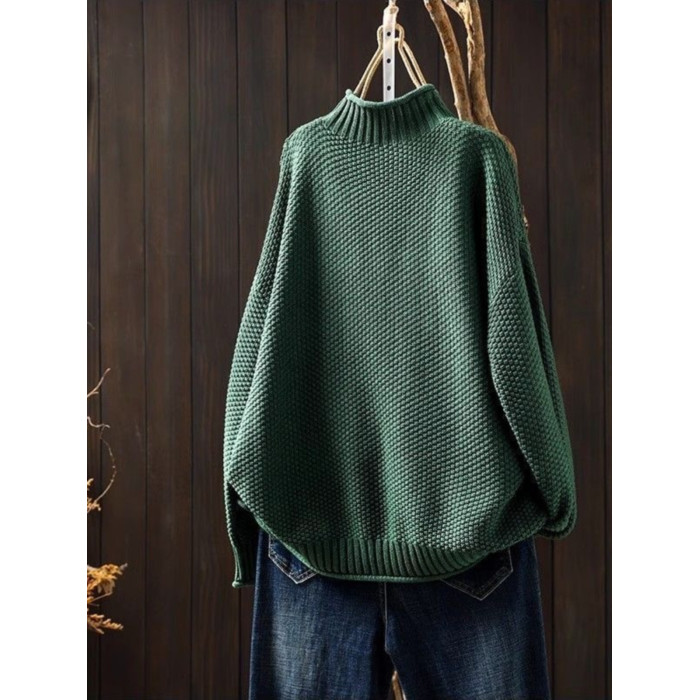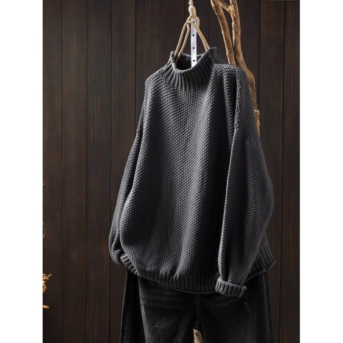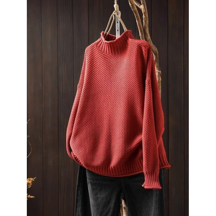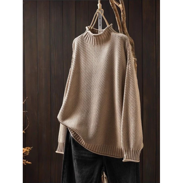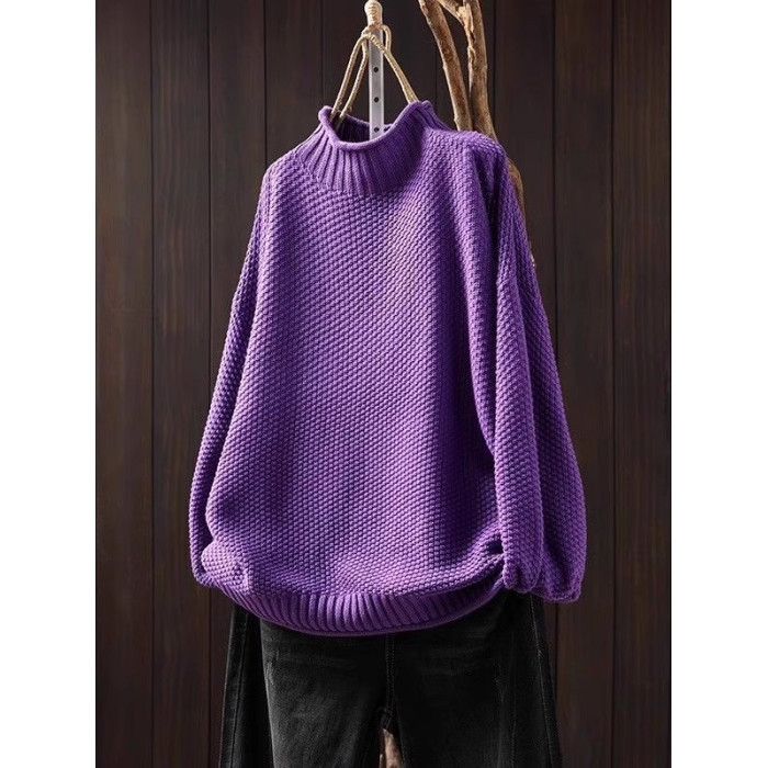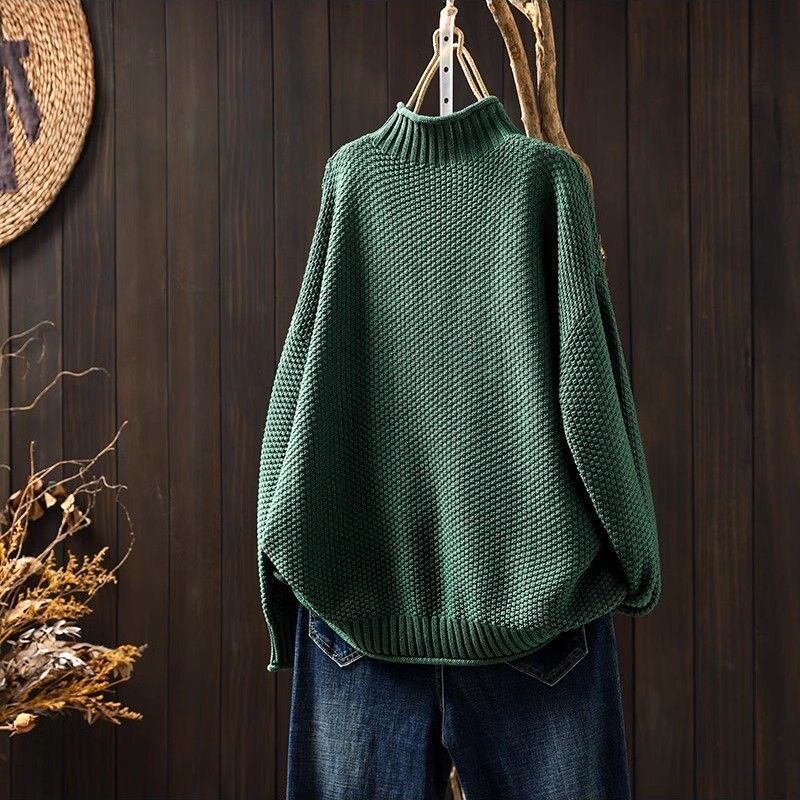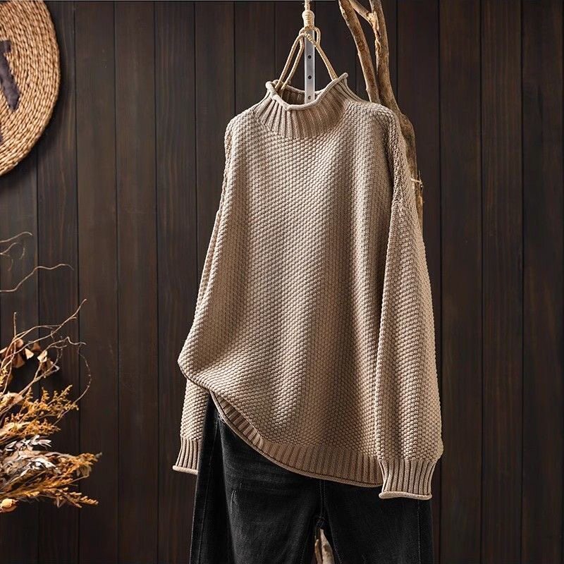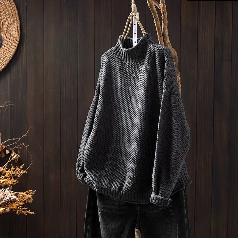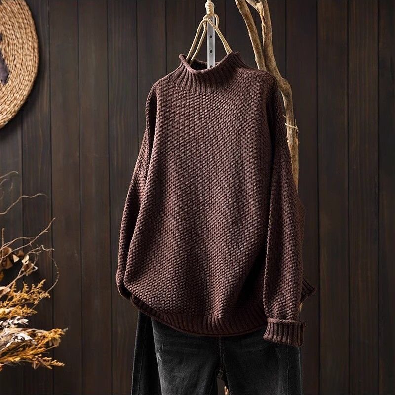 專櫃撤迴秋冬半高領復古文藝毛衣女寬松遮肉休閒百搭套頭針織線衣