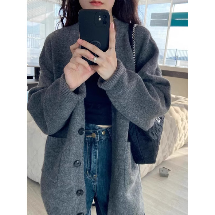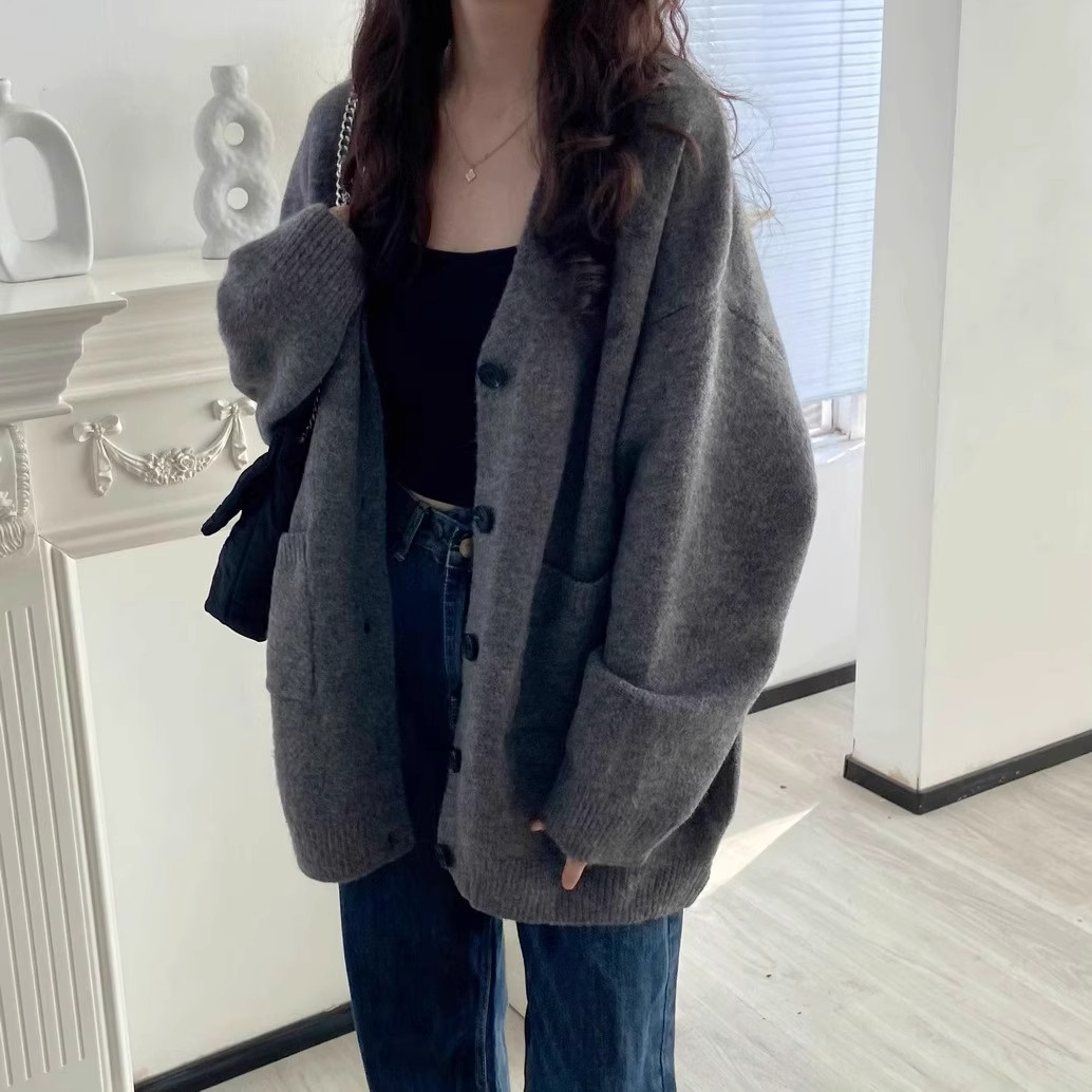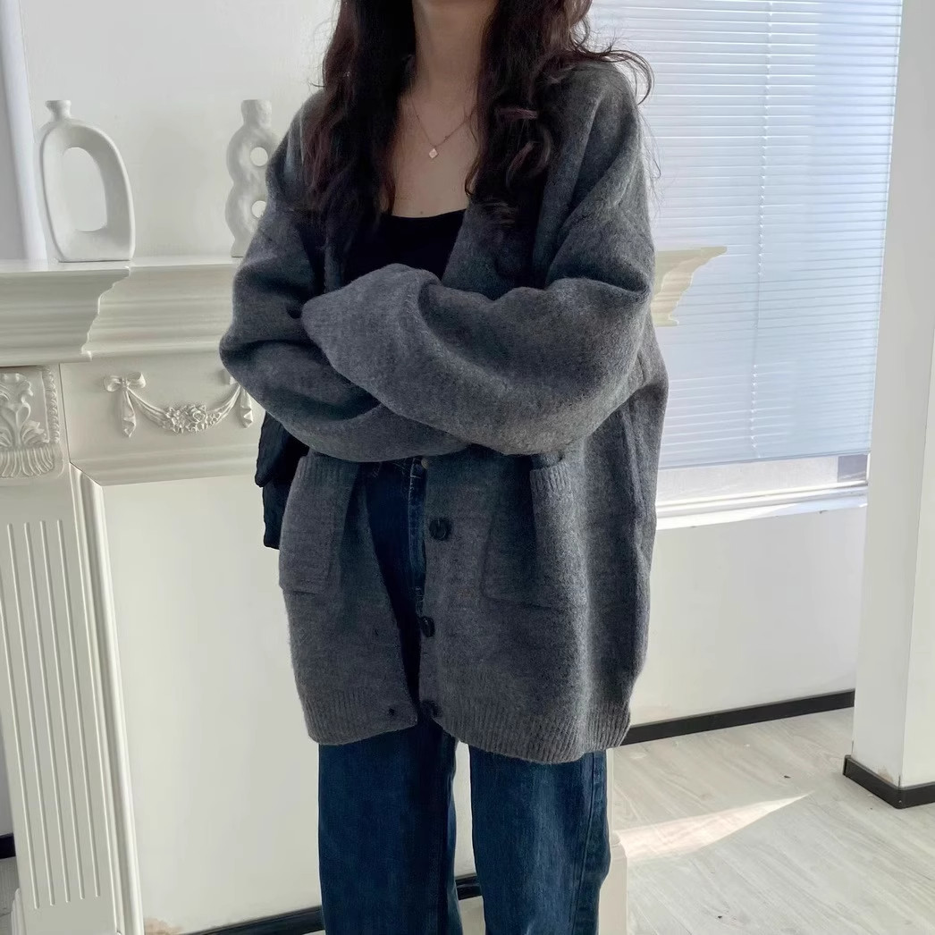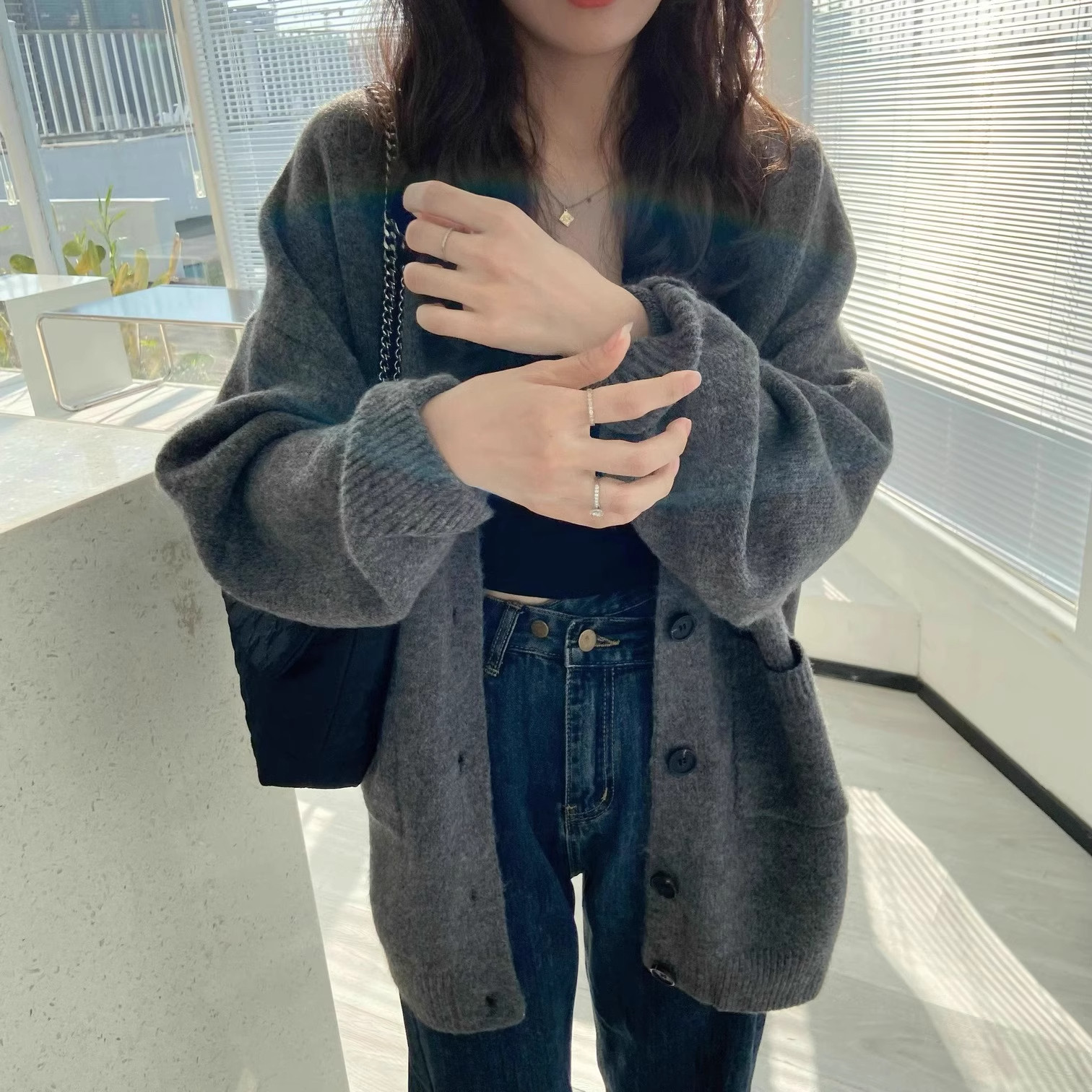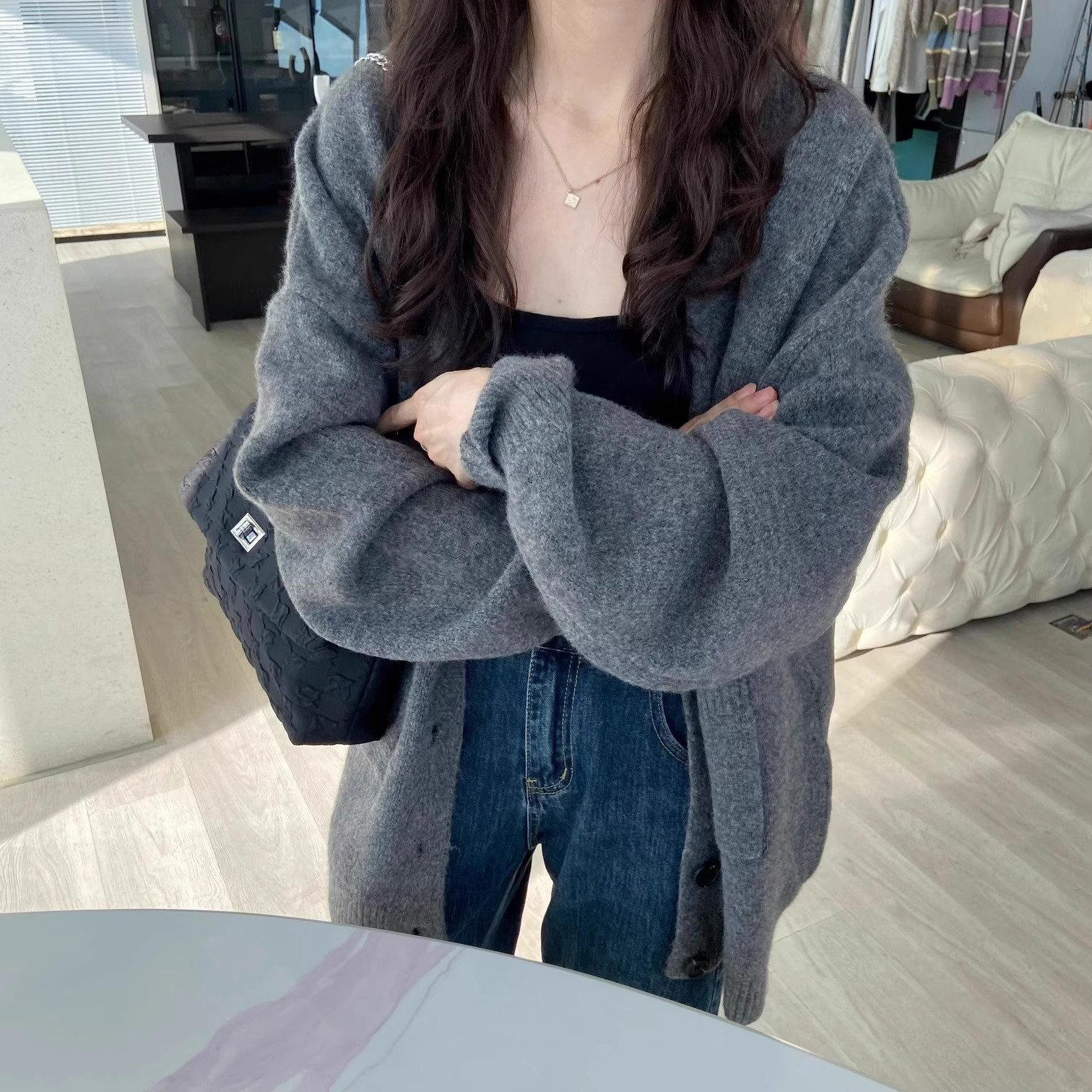 灰色針織毛衣外套開衫女秋冬新款慵懶風寬松高級感軟糯V領上衣厚