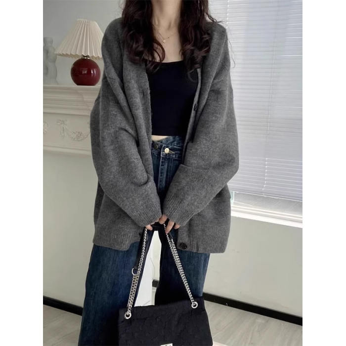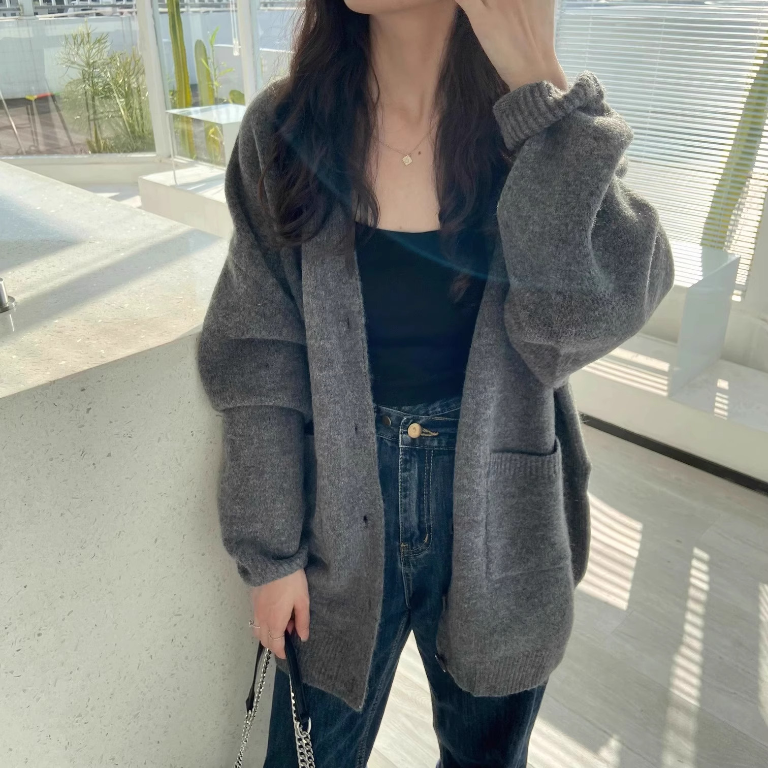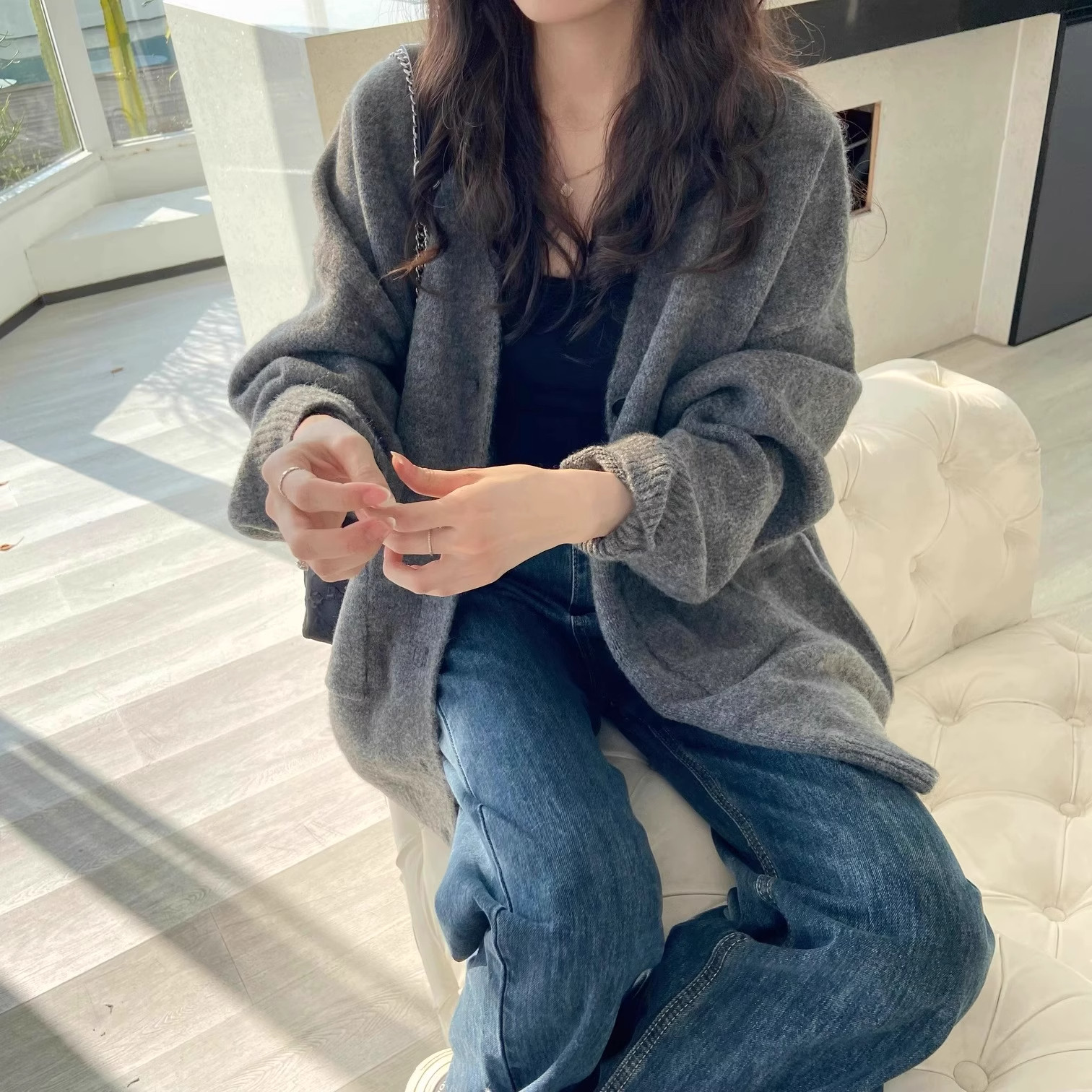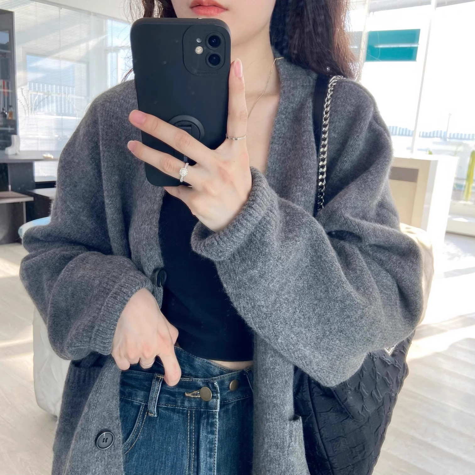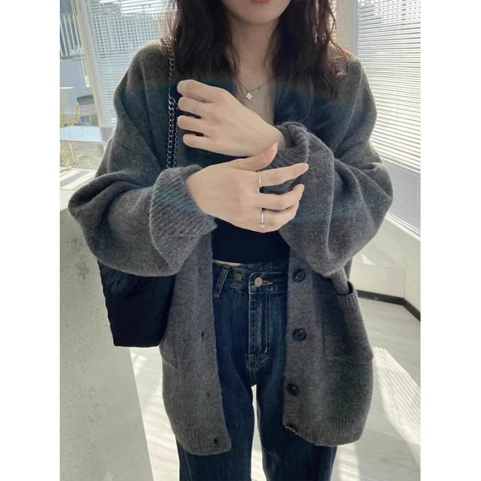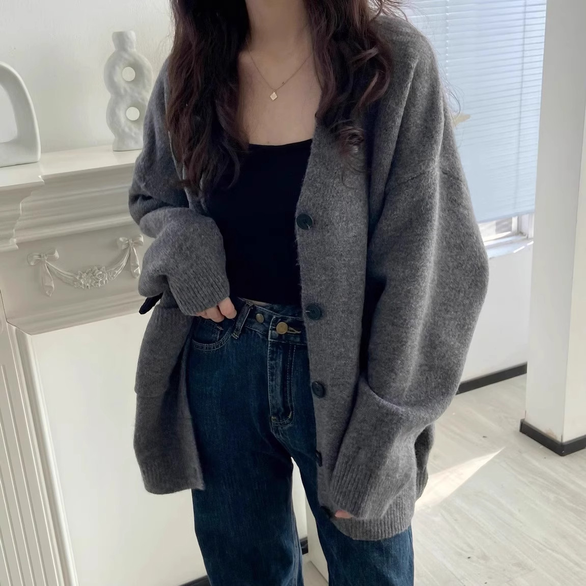 灰色針織毛衣外套開衫女秋冬新款慵懶風寬松高級感軟糯V領上衣厚