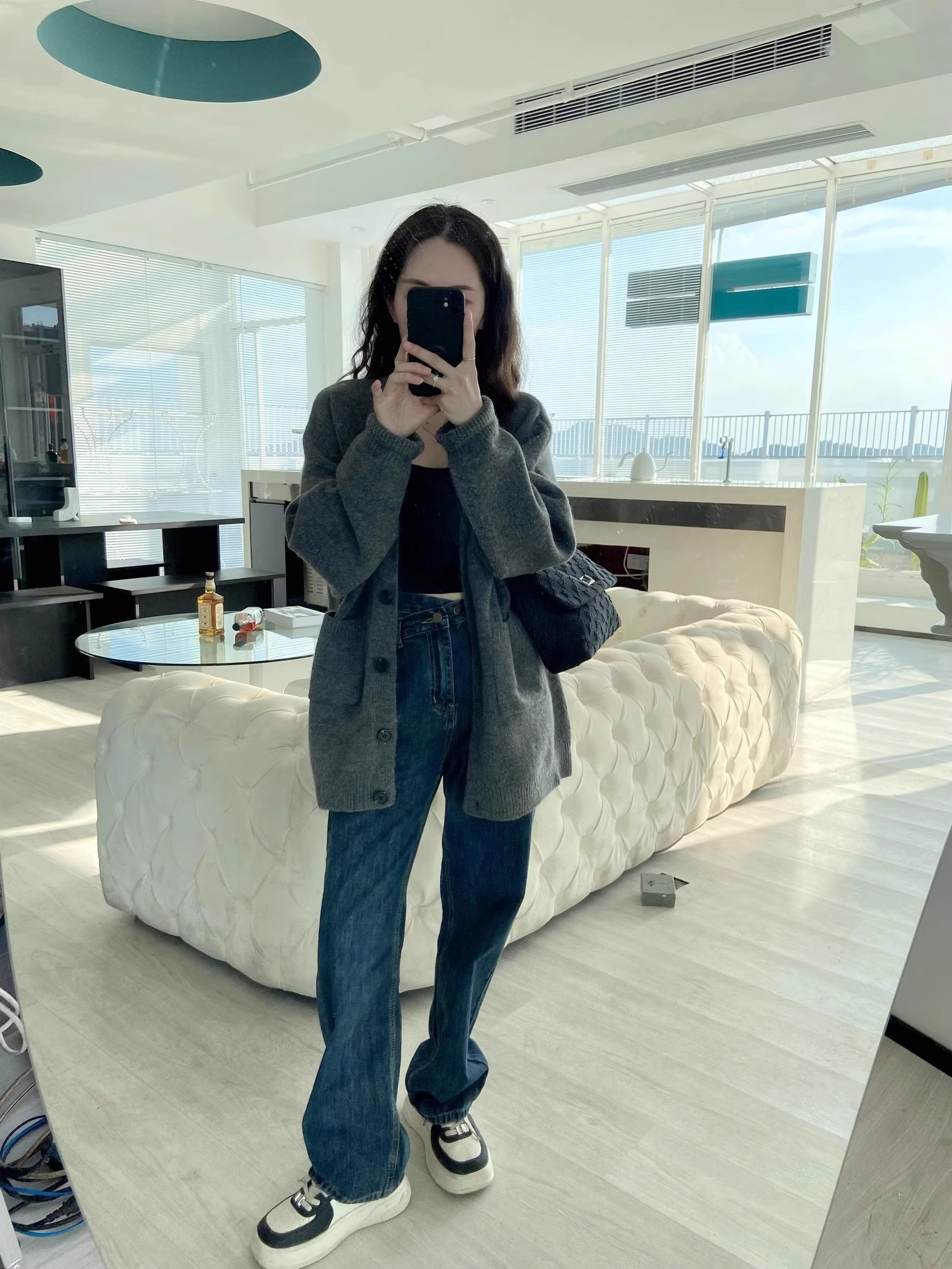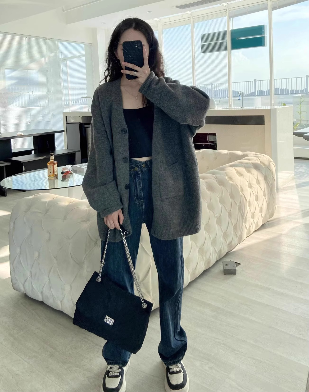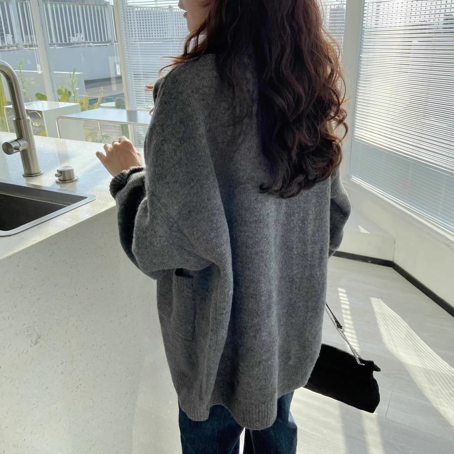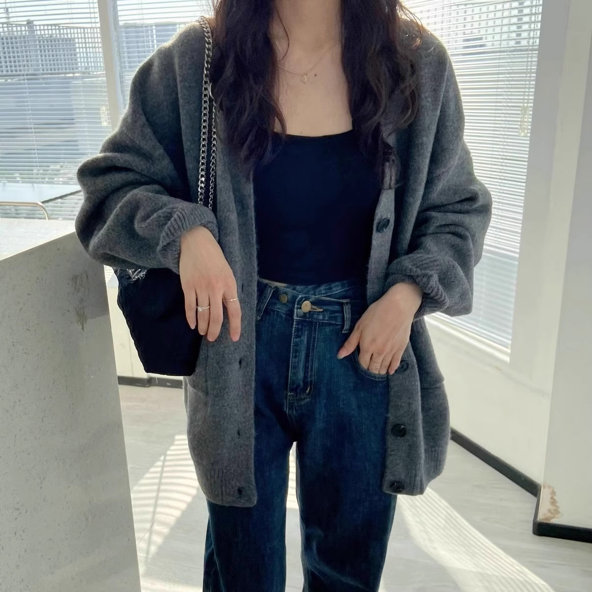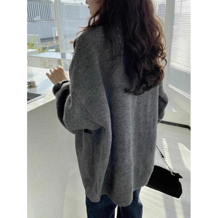 灰色針織毛衣外套開衫女秋冬新款慵懶風寬松高級感軟糯V領上衣厚