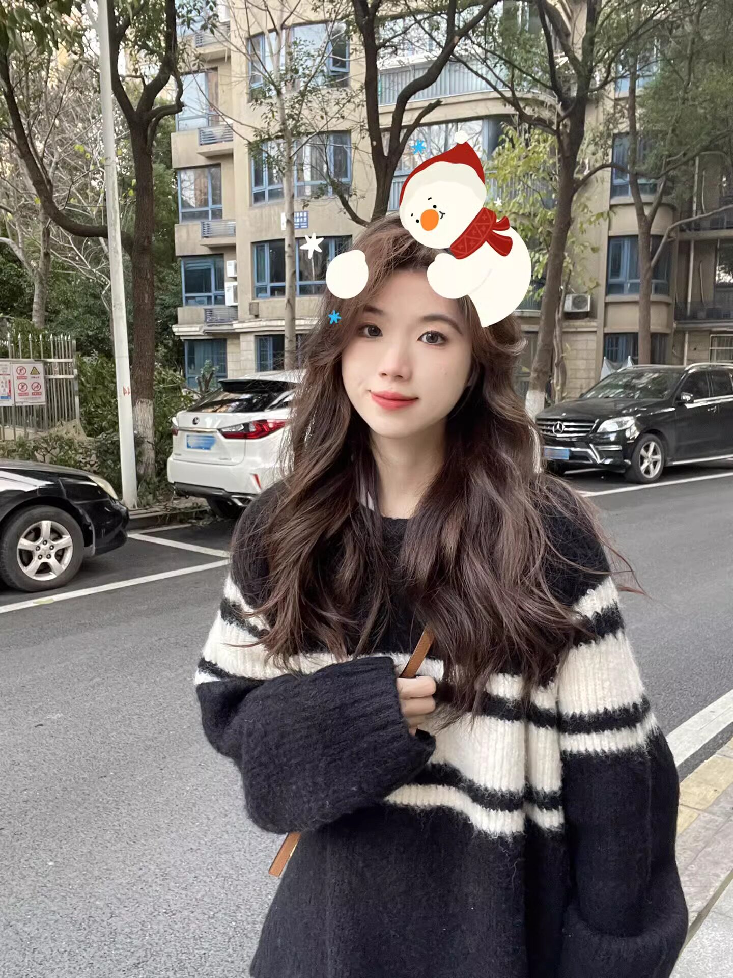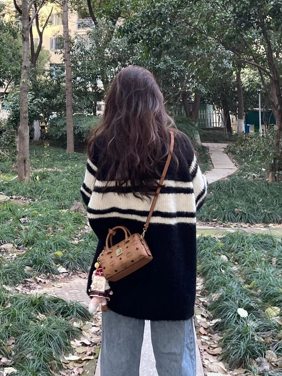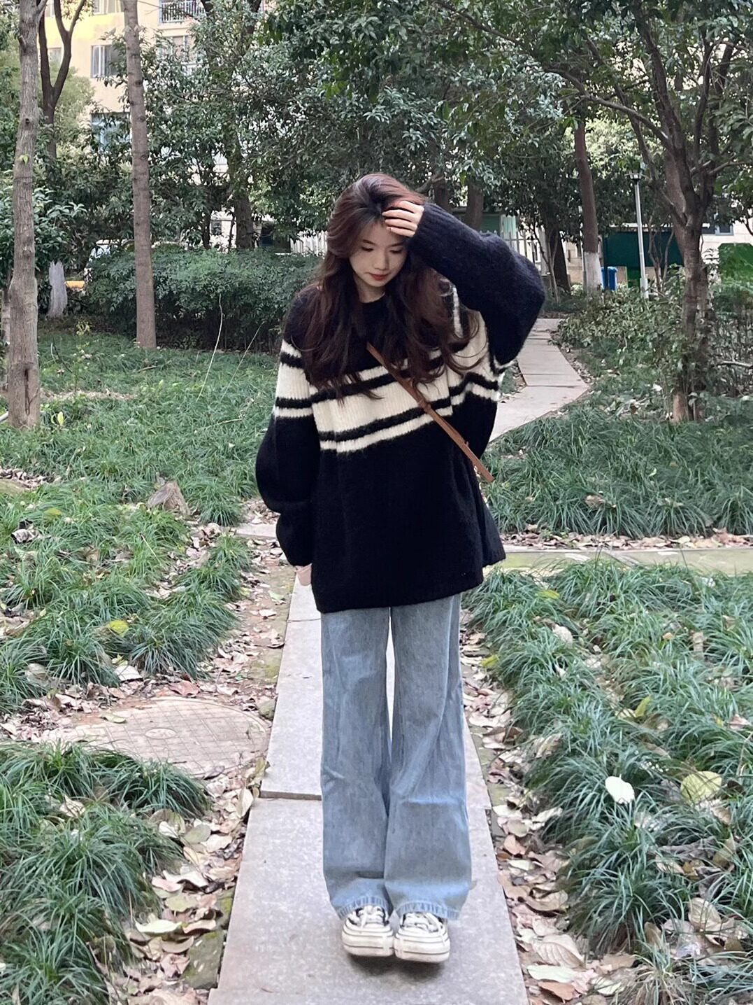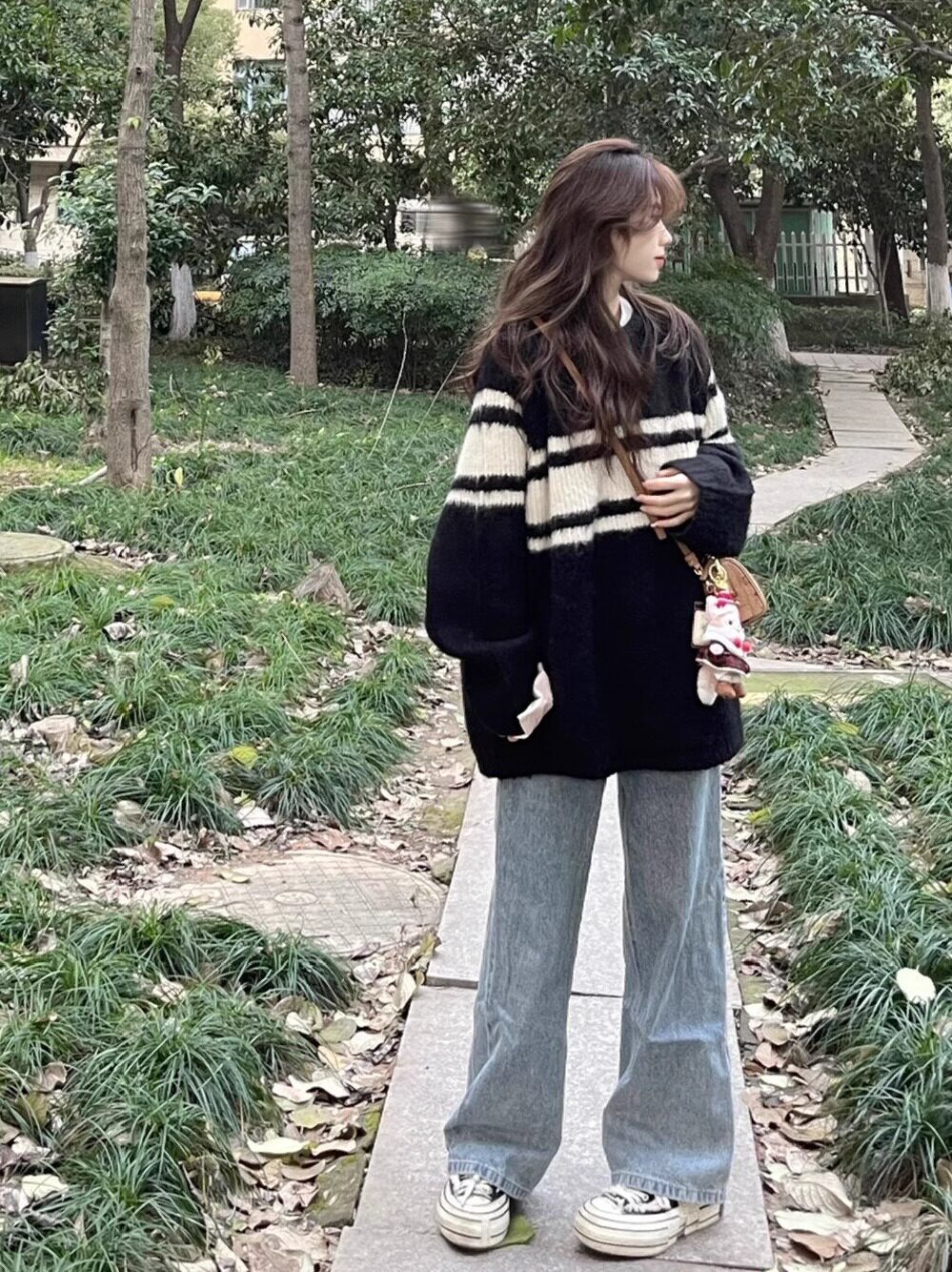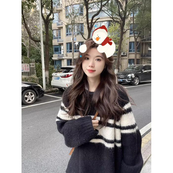 韓系高級感毛衣女加厚慵懶2025新款秋冬圓領寬松條紋撞色外套上衣