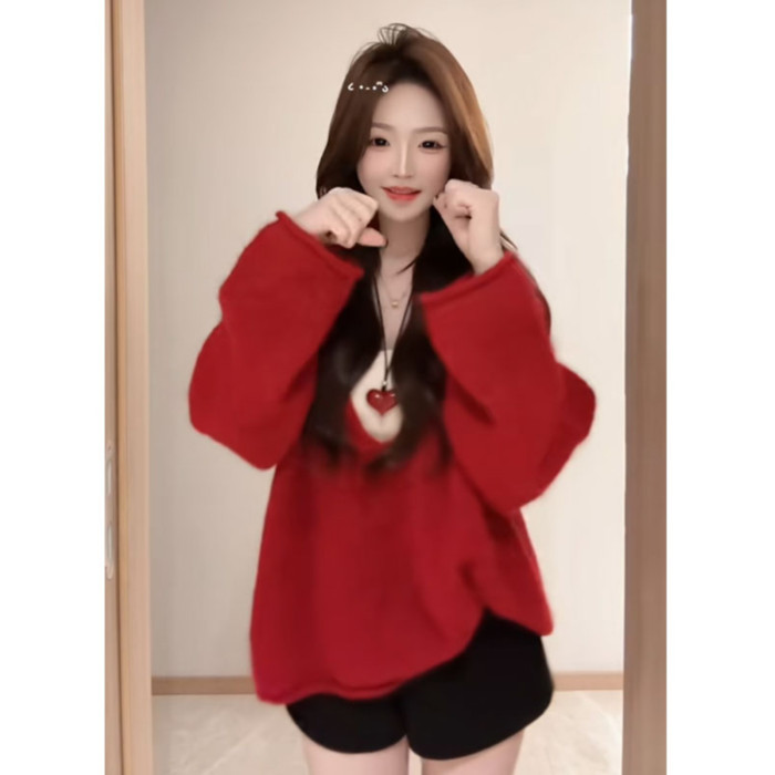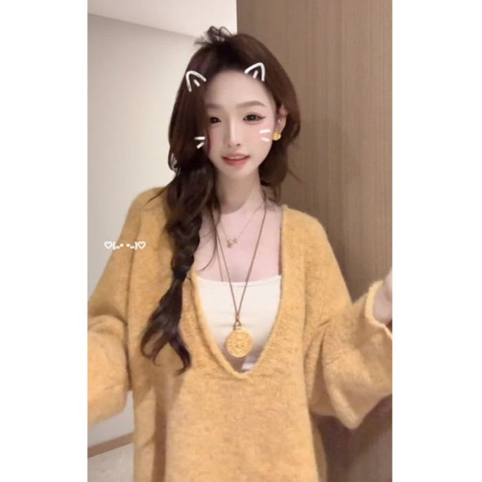 深秋初冬穿搭黃色大V領毛衣女秋冬季寬松慵懶風中長款針織衫上衣