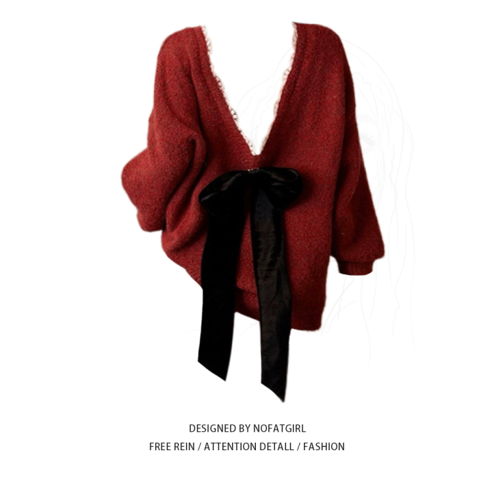 大碼胖MM紅色聖誕蝴蝶結露背v領毛衣女秋冬慵懶風高級感針織上衣