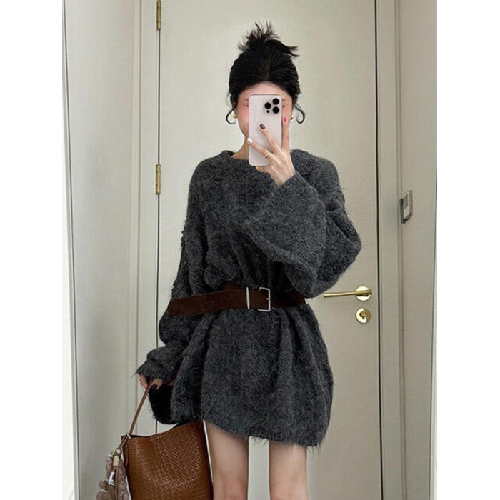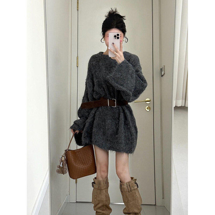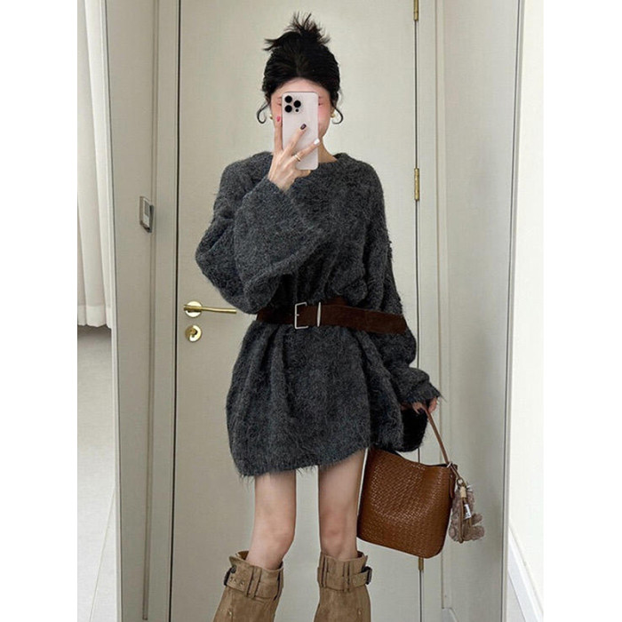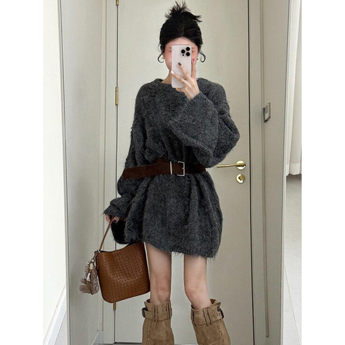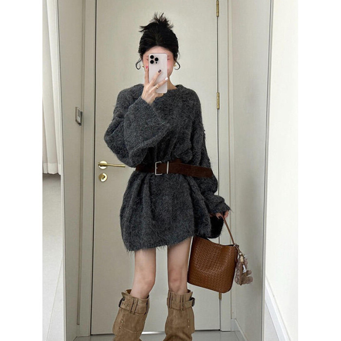 慵懶老錢風灰色軟糯中長款毛衣女秋冬季高級感加厚寬松針織衫上衣
