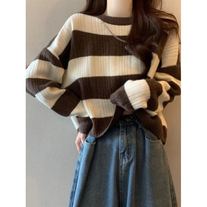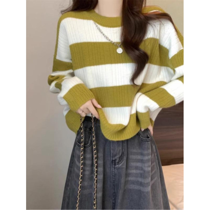 秋冬新款條紋針織打底衫毛衣女內搭圓領短款寬鬆小個子軟糯上衣潮