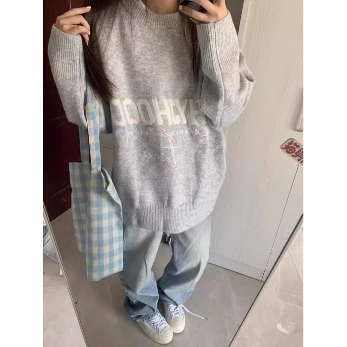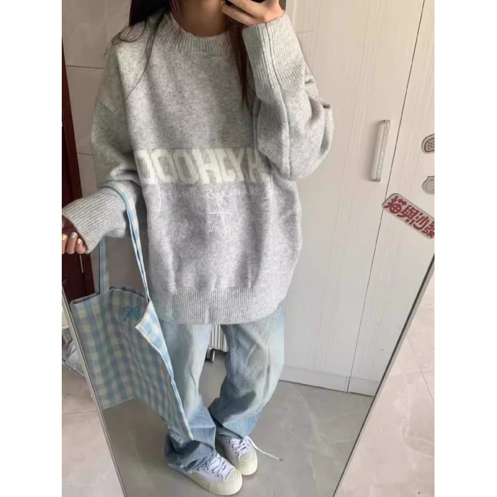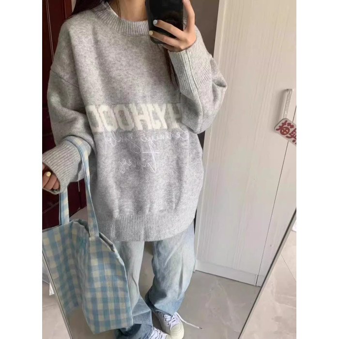 國潮oversize字母圓領毛衣女秋冬新寬鬆慵嬾風溫柔軟糯百搭針織衫