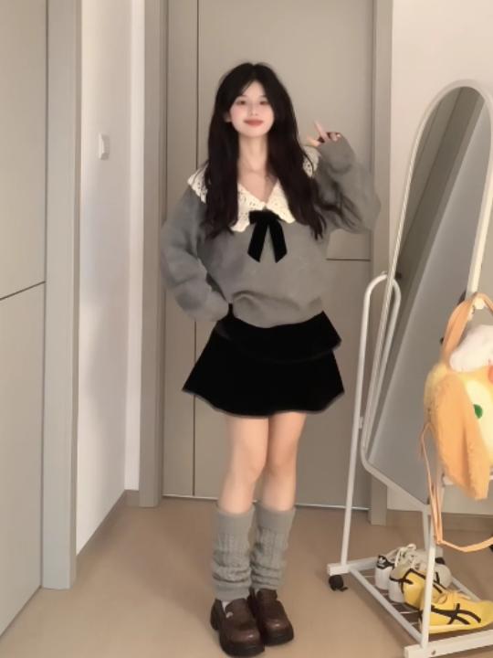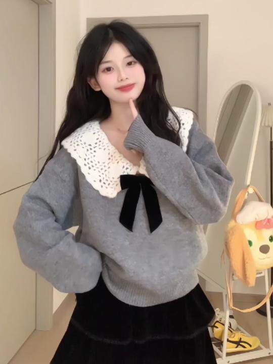 甜美設計感穿搭娃娃領毛衣女秋冬小個子溫柔減齡慵懶風針織衫上衣