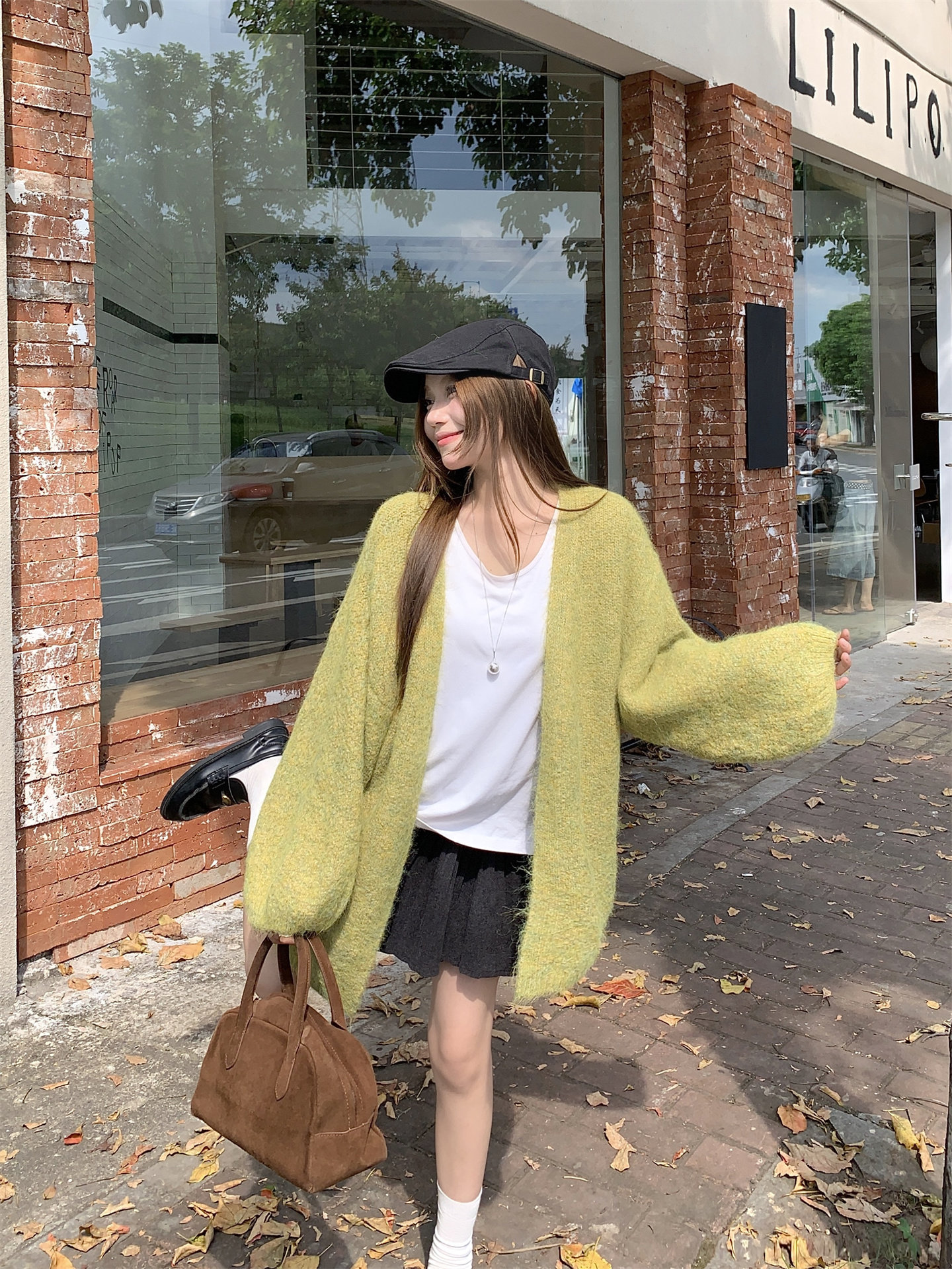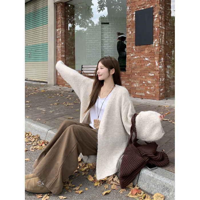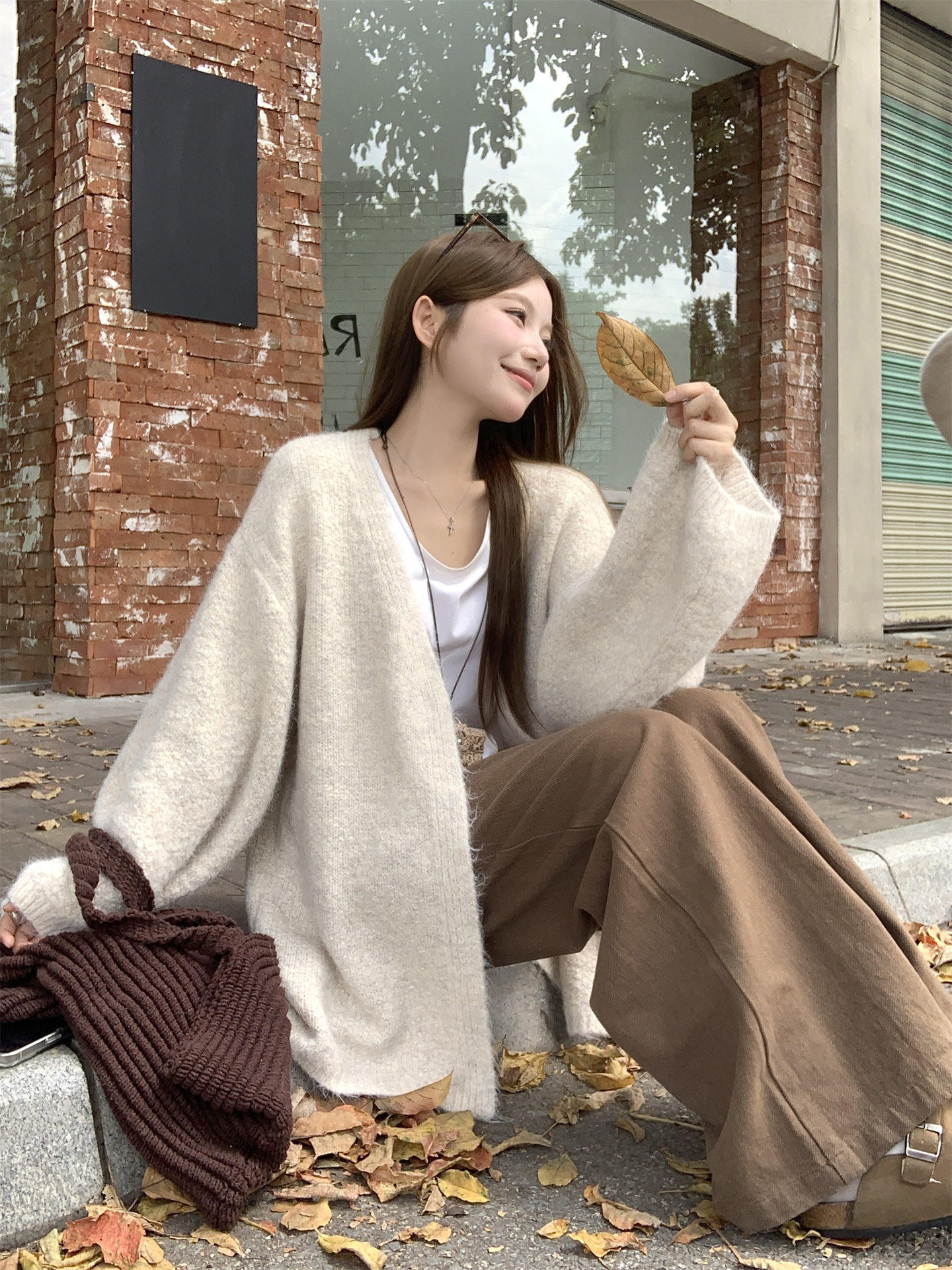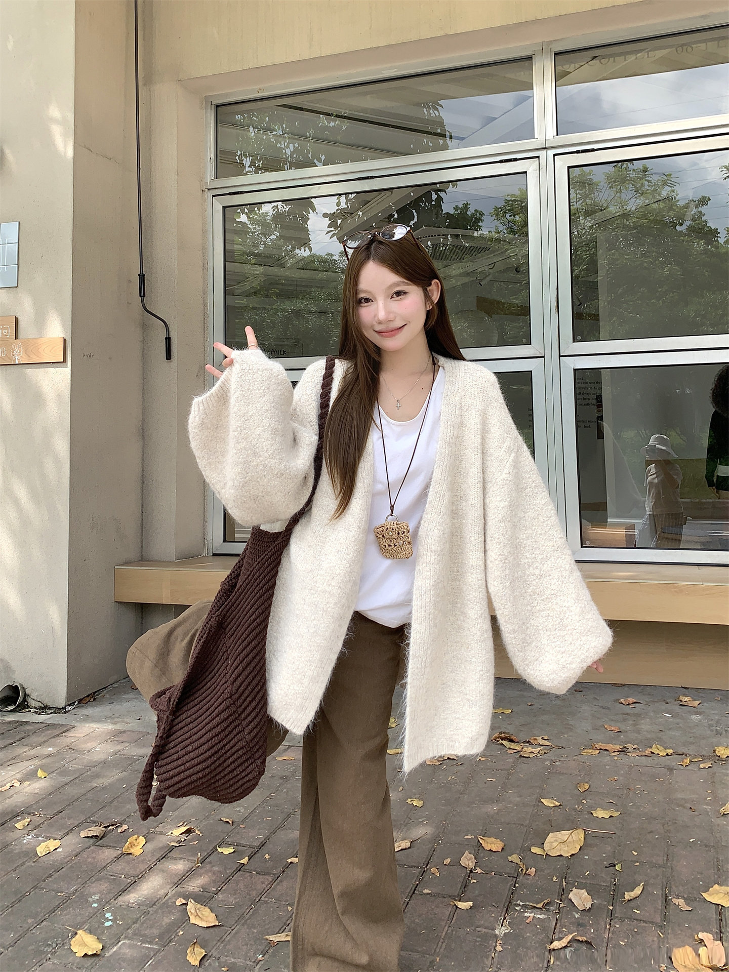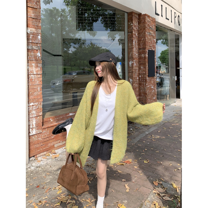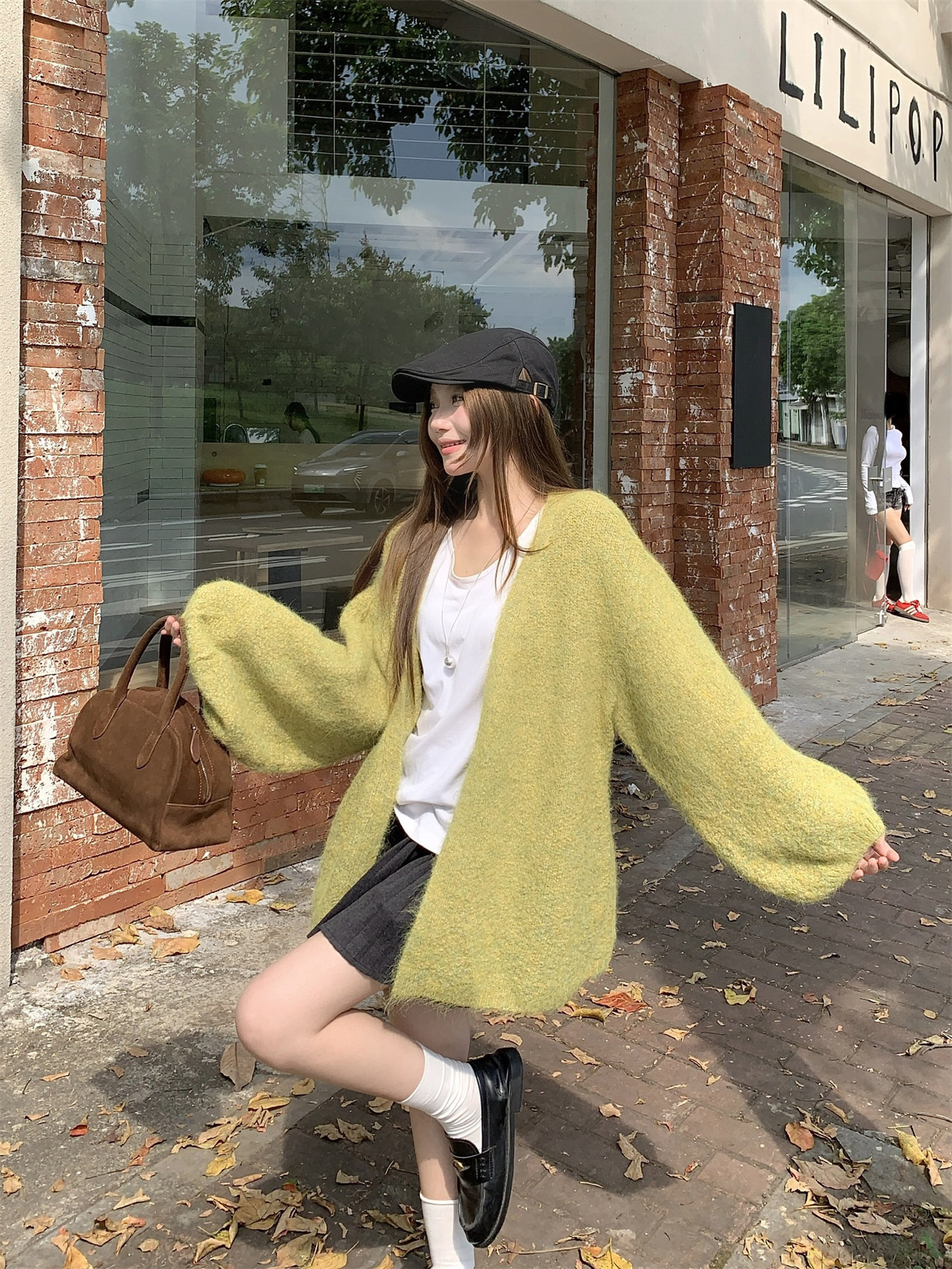 PPHOME慵嬾風軟糯毛衣短外套女秋季加厚杏色休閒寬鬆針織開衫上衣
