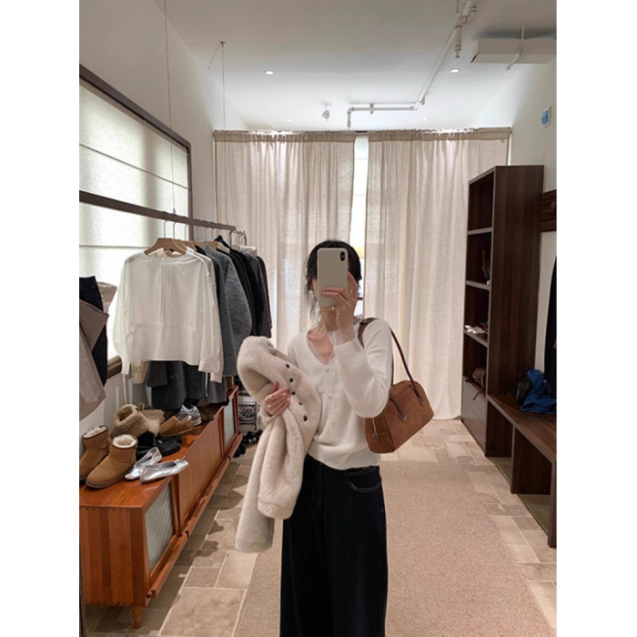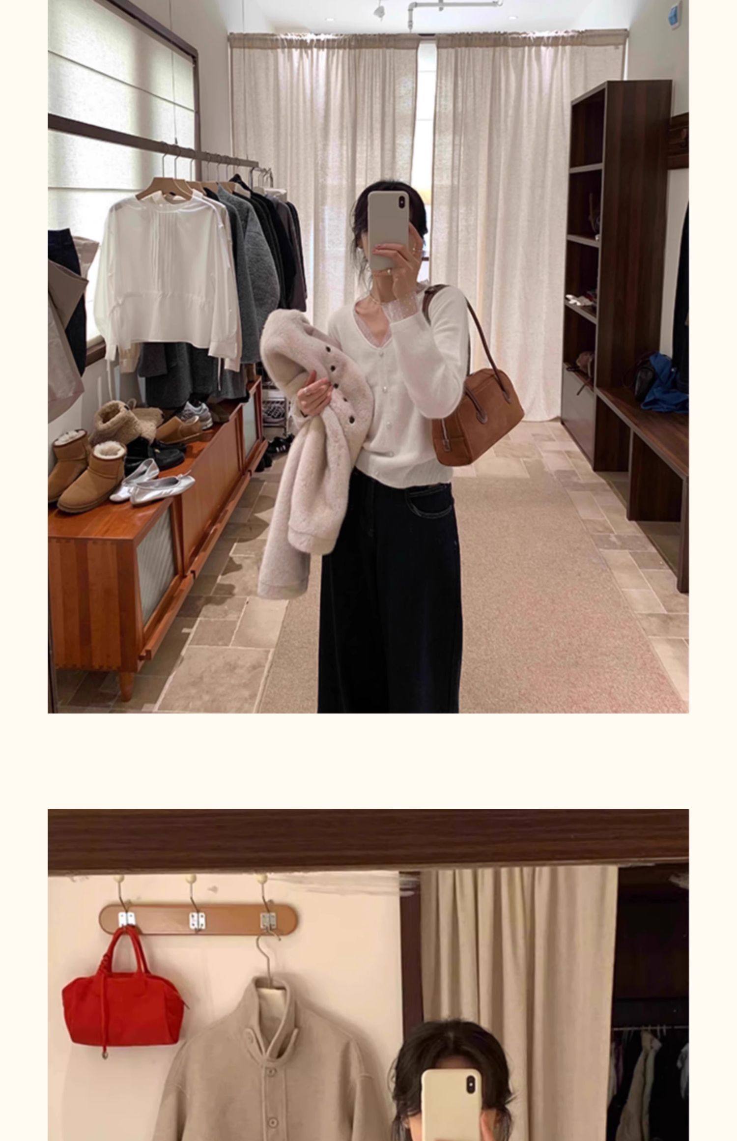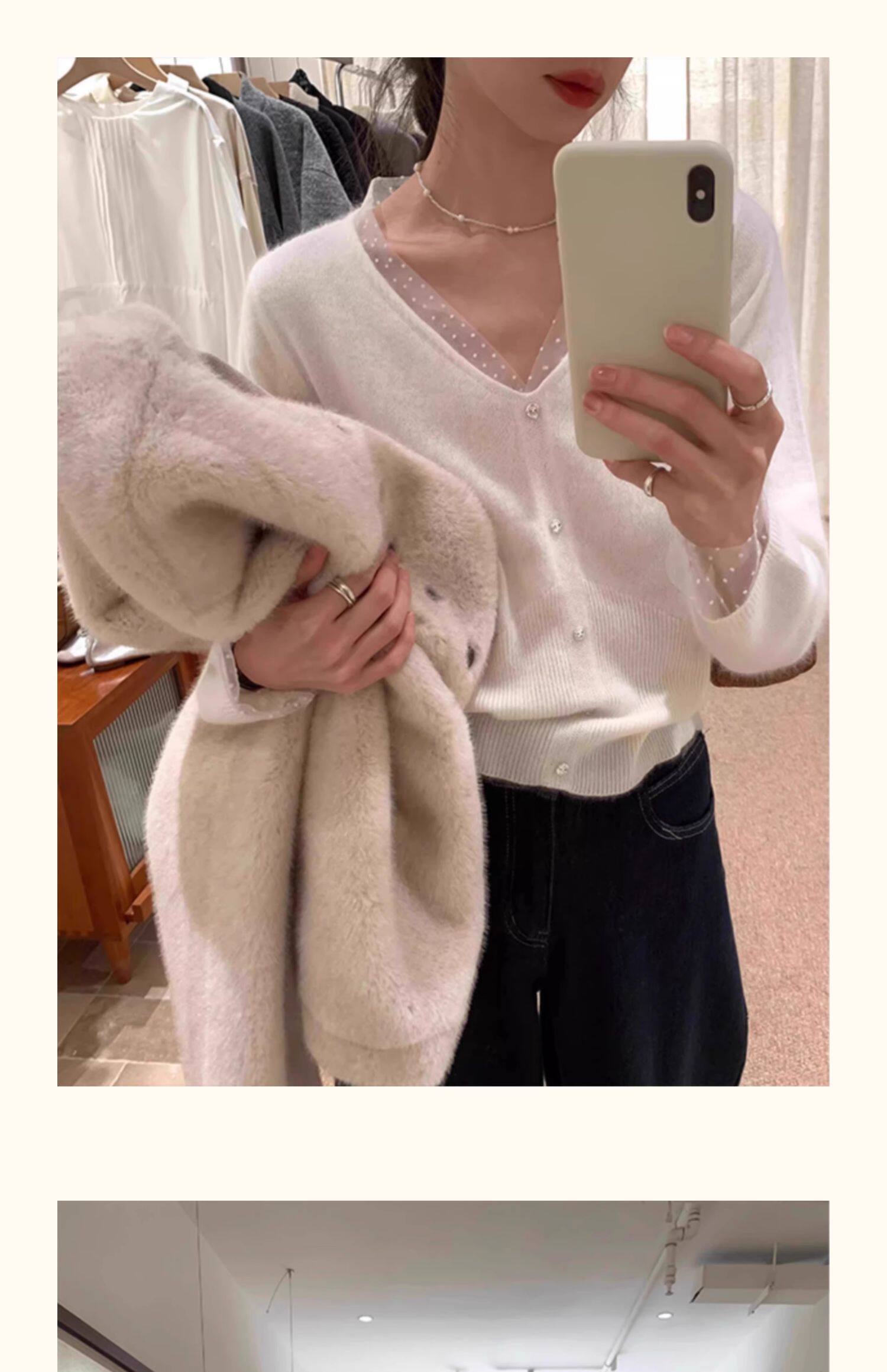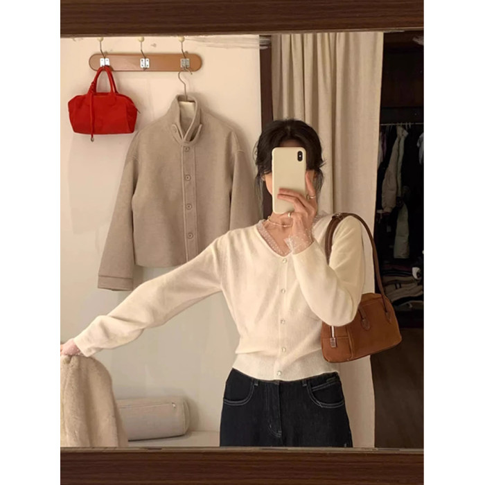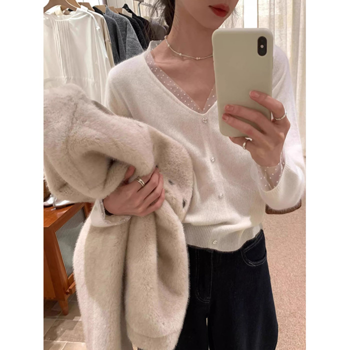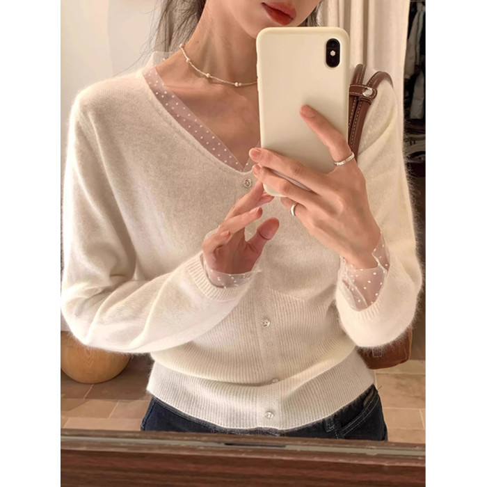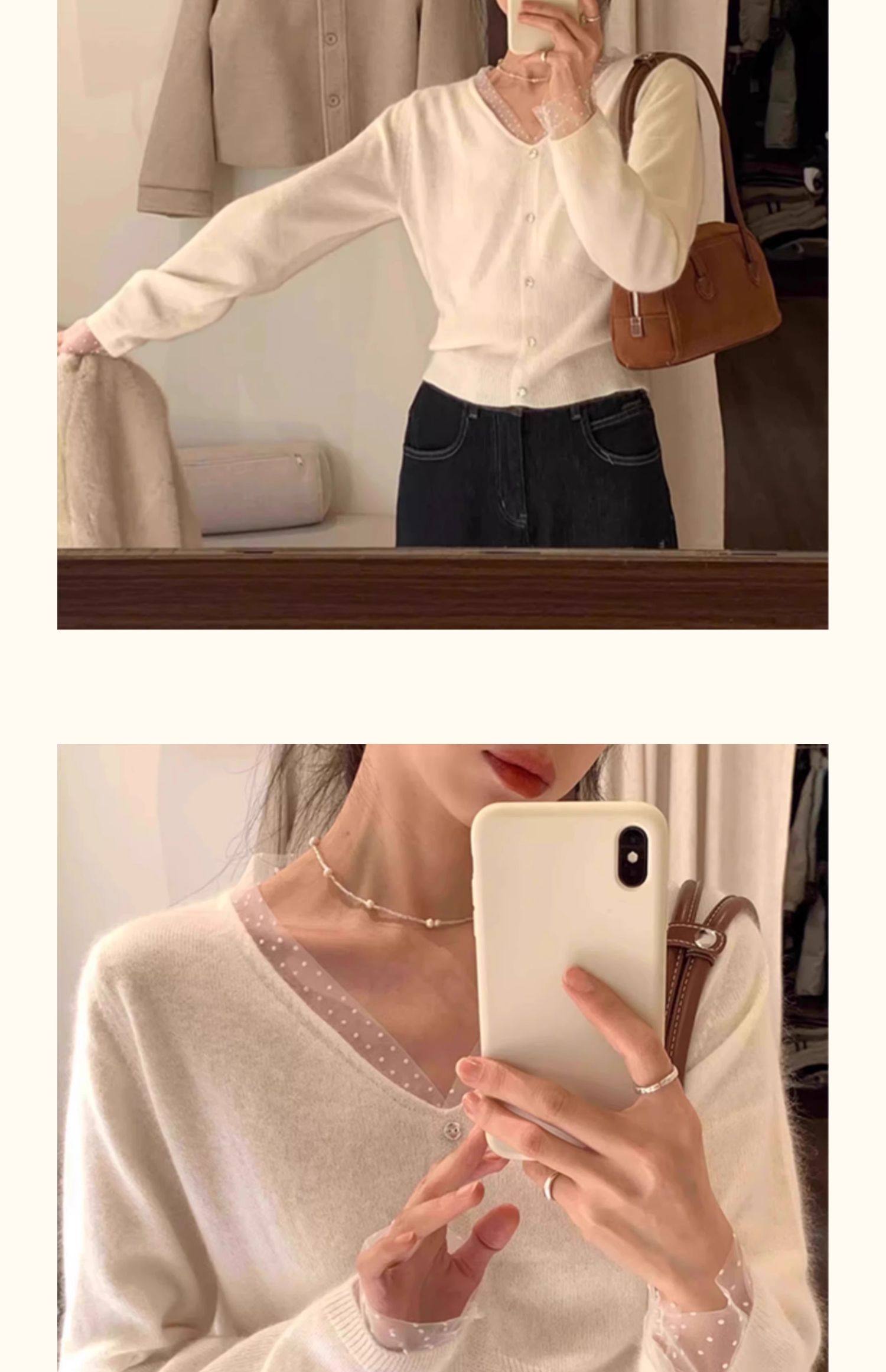 漂亮蕾絲V領白色毛衣女波點拼接針織衫內搭短上衣秋冬小香打底衫